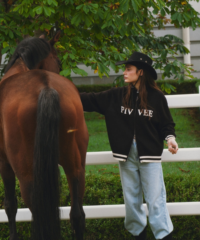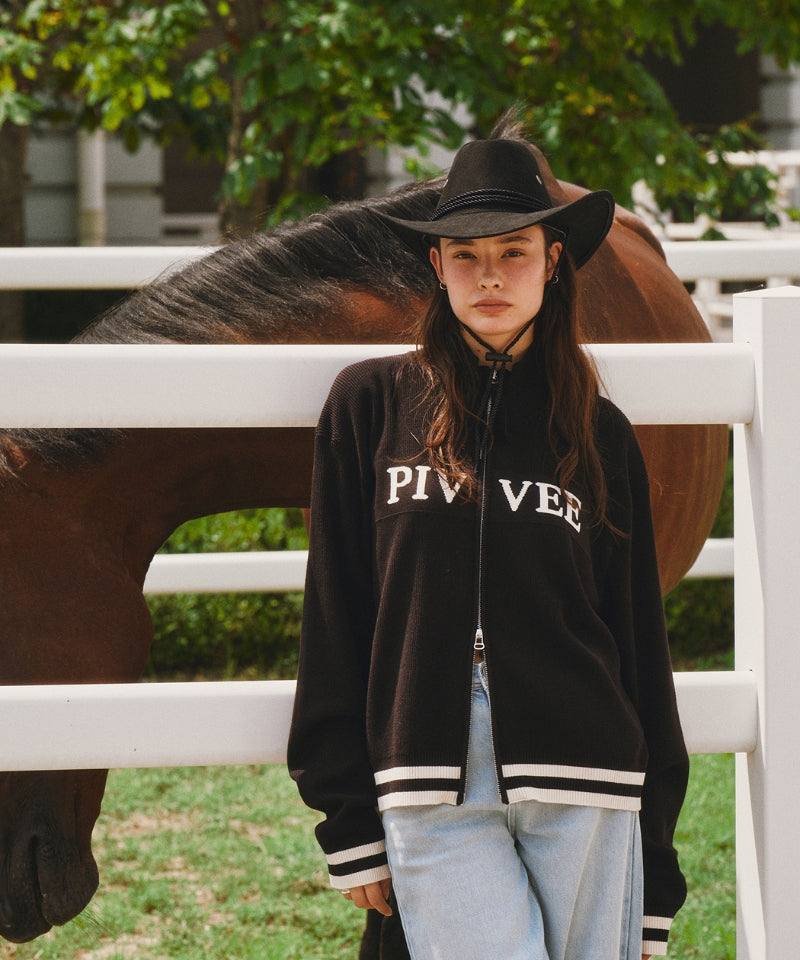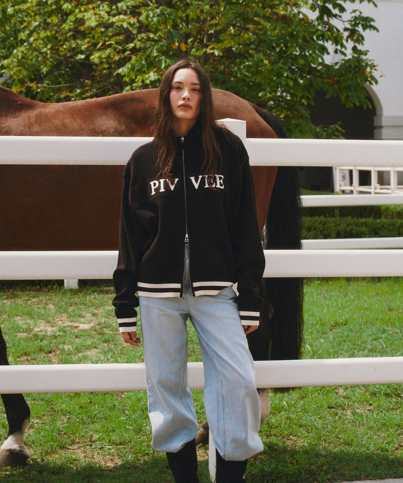 This logo jacquard knit zip-up cardigan features a front PvB logo pattern woven into the fabric. Subtle point logo color accents add a refined, casual elegance. Detailed with a zipper and fabric embellishments, it offers a semi-cropped fit in size S and a relaxed silhouette in size L. Designed as a unisex piece, it is made from a blend of 75% rayon and 25% polyester. Crafted in Korea for quality and style.