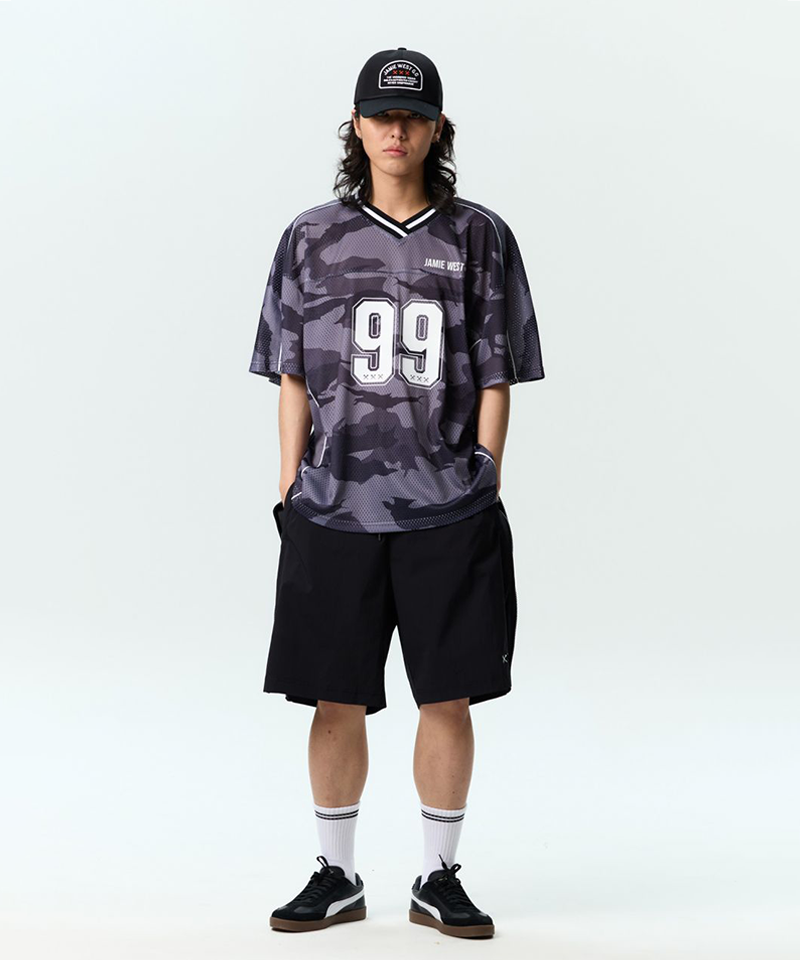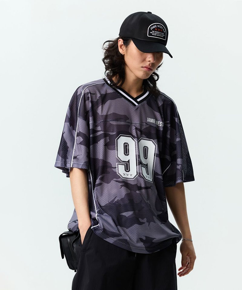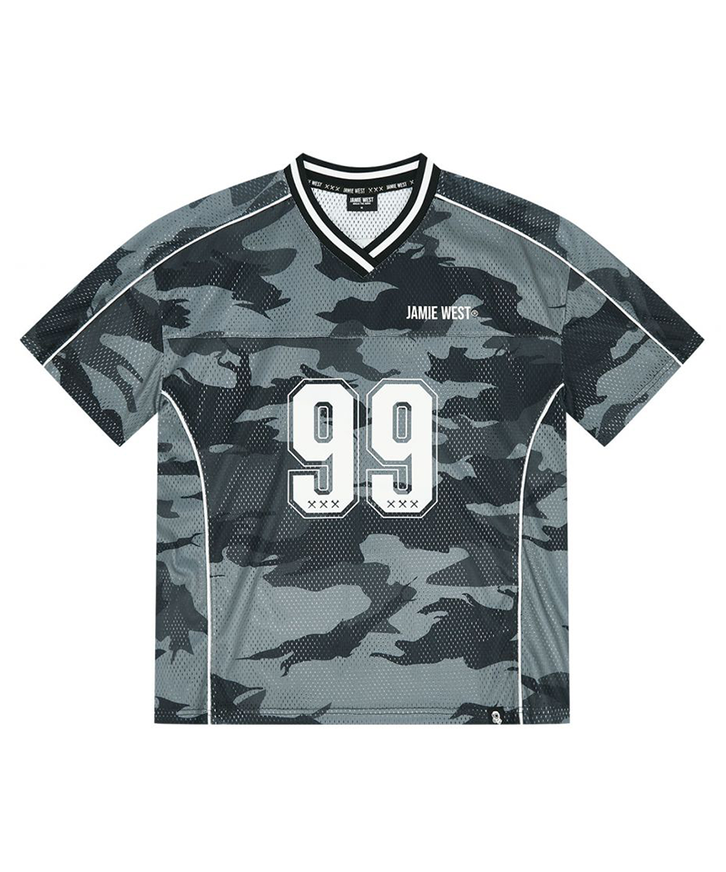 Get noticed with the Jamie West No.99 Vneck Mesh Camo T-Shirts in Black. Combining a bold camo mesh design with a playful V-neck cut, this tee adds a fun edge to your casual look. Lightweight and breathable, it’s perfect for staying cool while making a statement wherever you go.