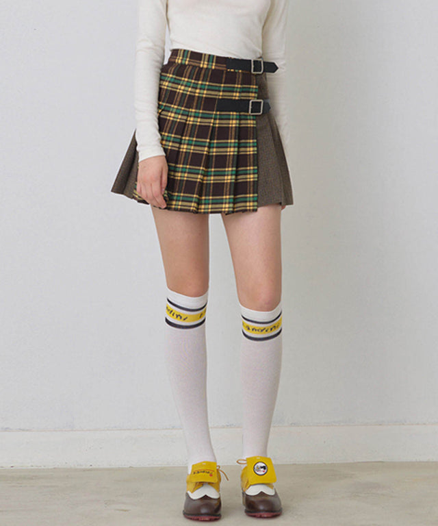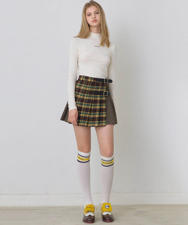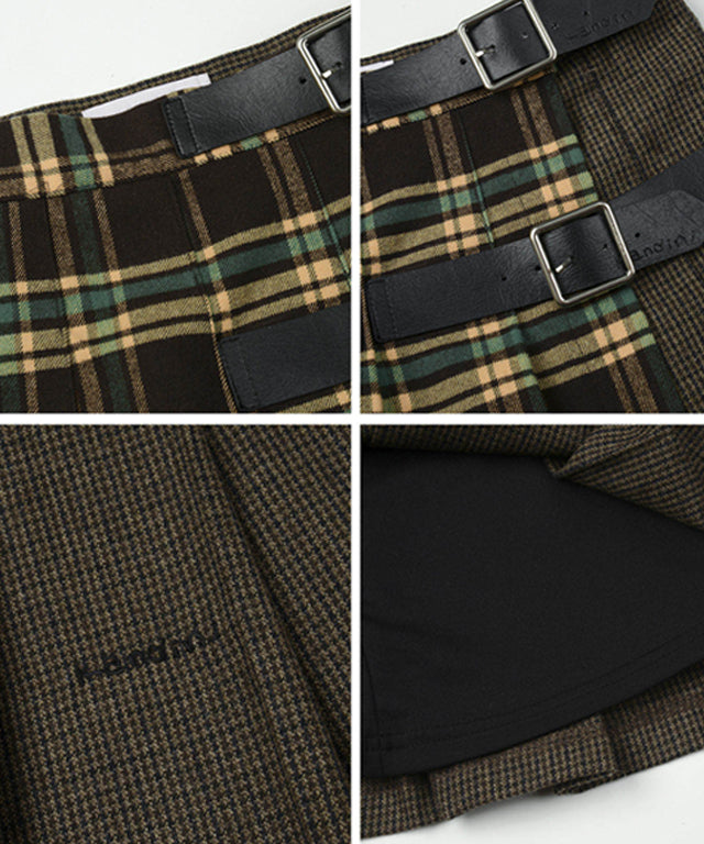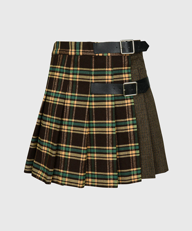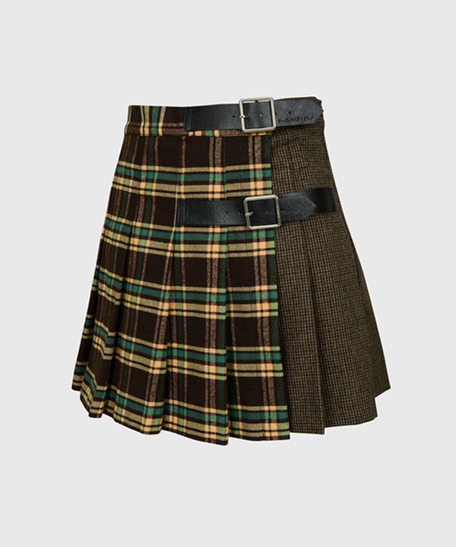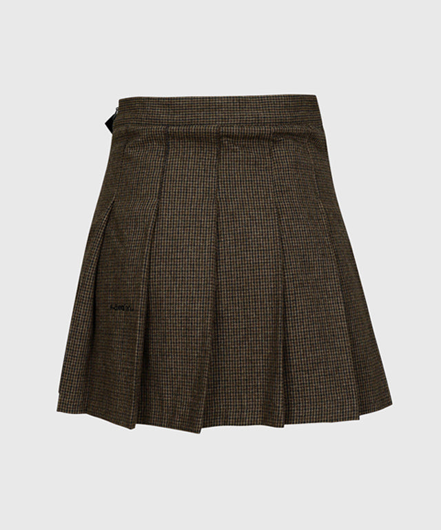 Constructed from a warm wool blend, this double check pleated skirt pairs a stylish belt detail with a soft polyester blend interior. Crafted with a mini length and functional underpants for increased stability, this garment also boasts superior softness, moisture absorption, quick-drying capabilities, and shape-preserving properties. Featuring a slimming silhouette, pockets have been omitted to ensure a perfect fit.