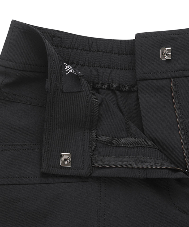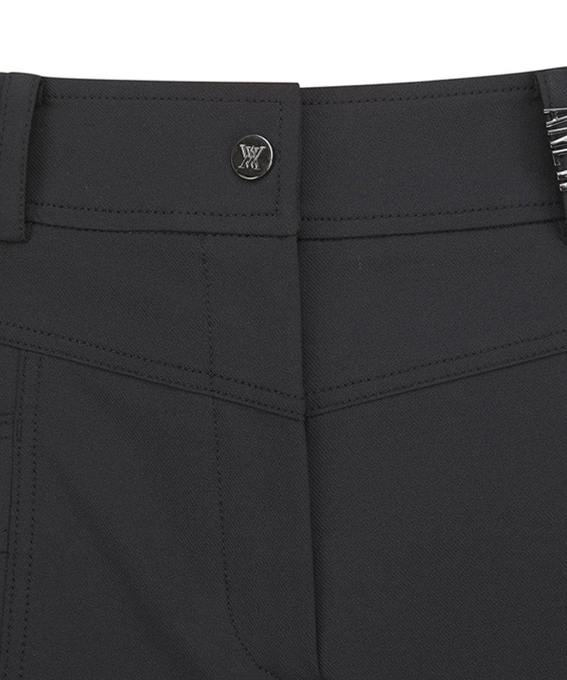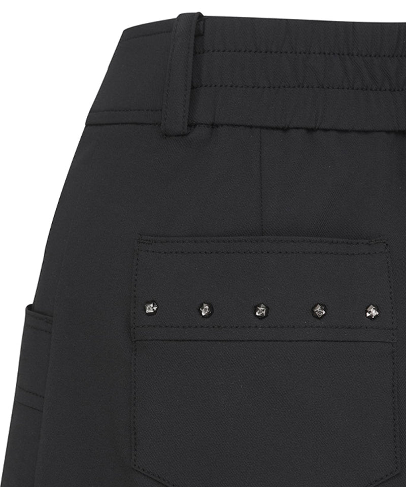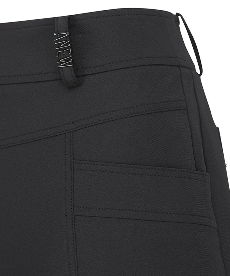 These are 5-part cabra pants. The V-line cut on the front part distracts the gaze from the abdomen, and the side pocket-shaped details are designed to be worn without burden. The wide cabra details on the hemline give a point to make the leg line look a little slimmer, and the back hip part also has an out pocket detail, so that it can be worn casually.