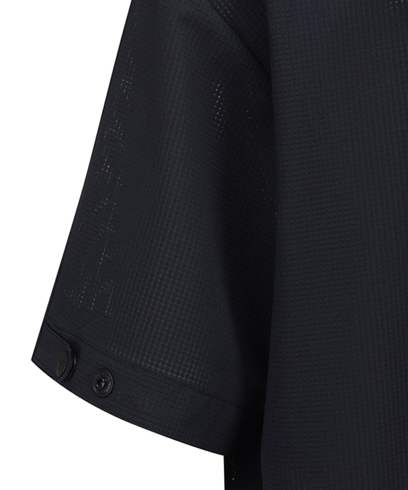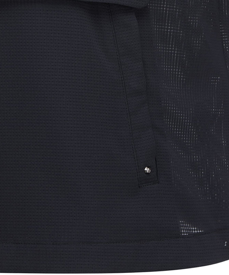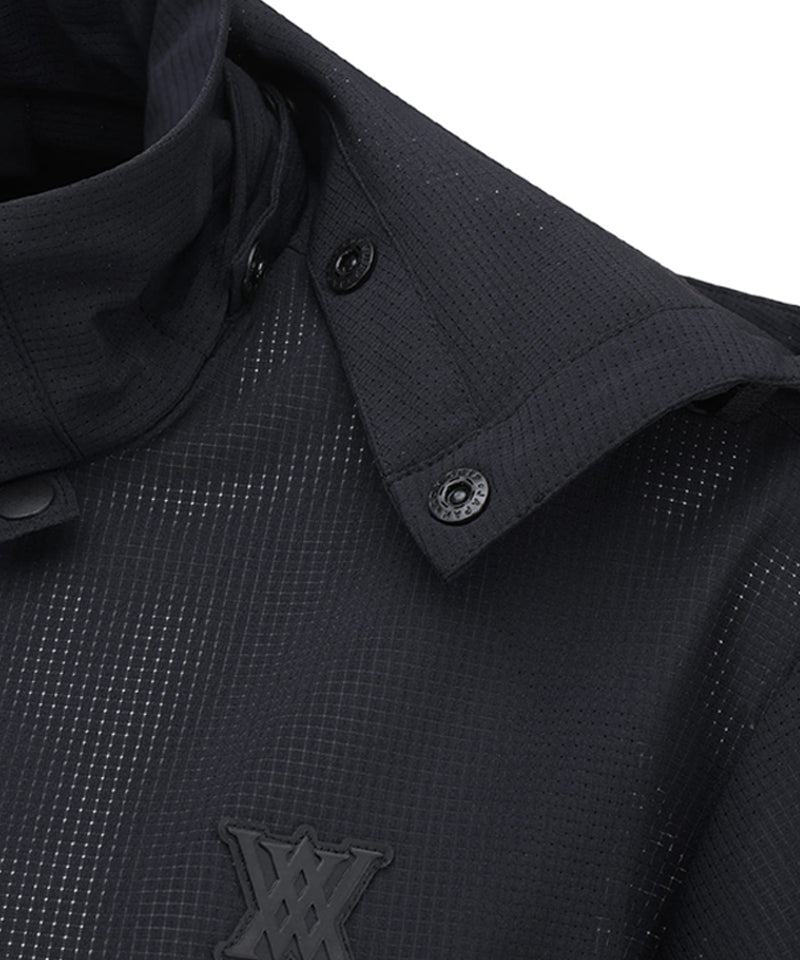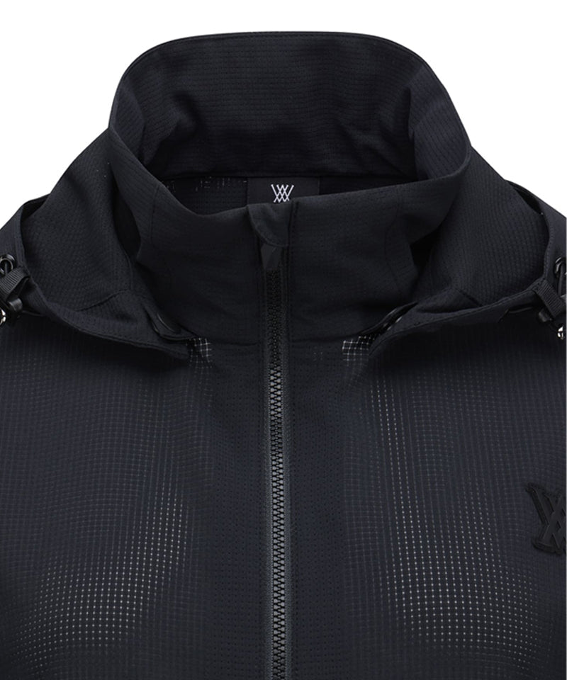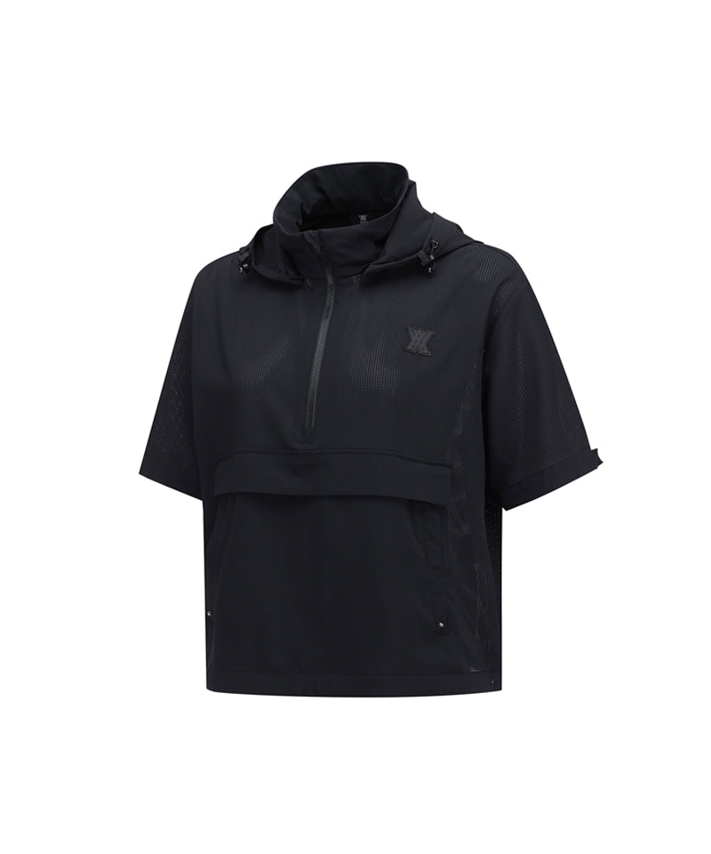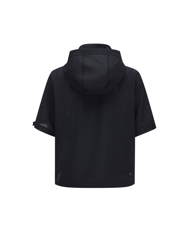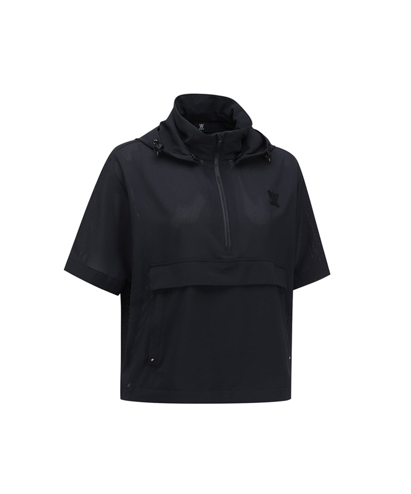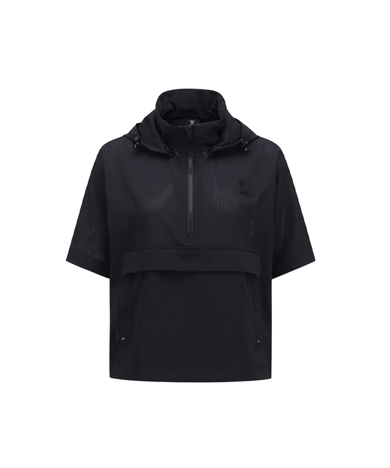 Anorak-style hooded half-zip-up using mesh hole material. The hood is built into the inside of the neckline, so you can take it out and wear it when needed. There is a string inside the hem, so you can adjust it to fit your body shape.