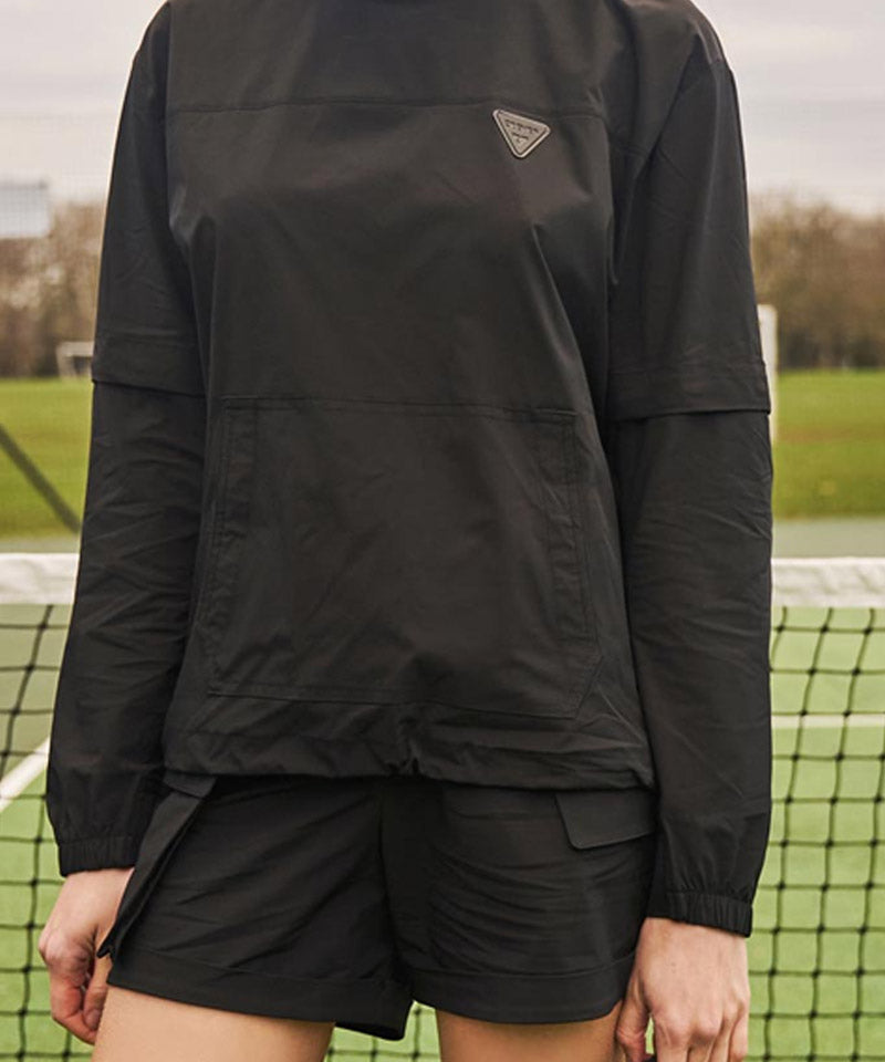 Multi-pocket anorak shorts nylon material with excellent elasticity detachable pocket. Excellent fit thanks to banding at the waist set product with detachable sleeve field anorak.