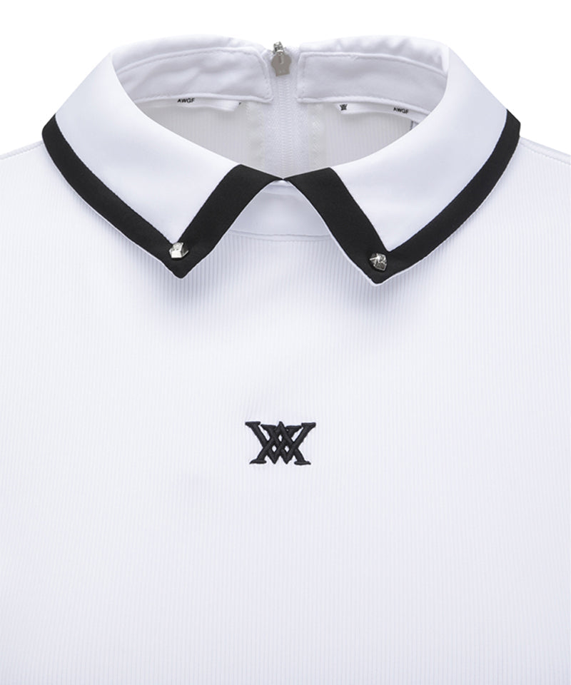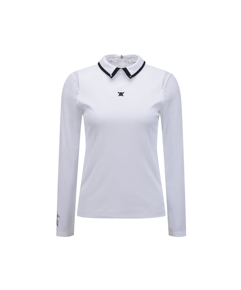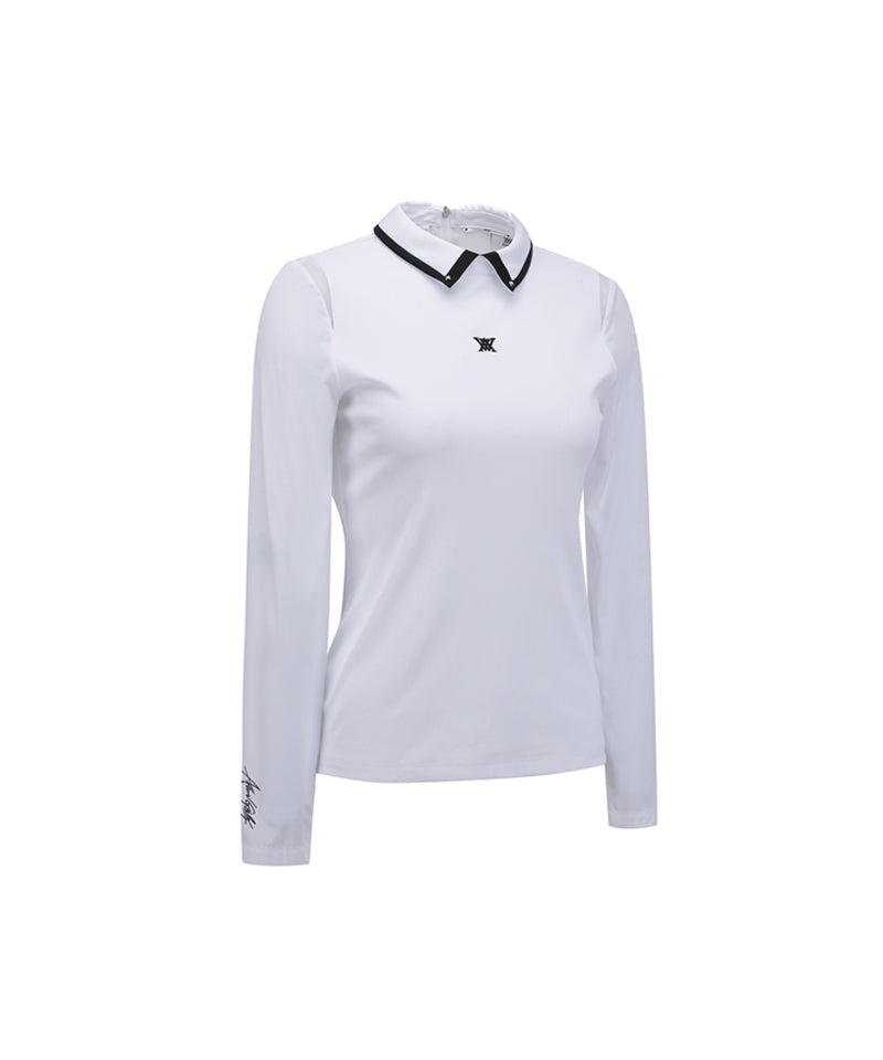 This inner T-shirt features a slim silhouette that follows the body line neatly with a bone structure. It has a classic shirt shape and the sleeves are lined with cool material, so you can achieve the same effect without having to wear a separate base layer. The collar is accented with black tipping and studs, and the powernet color matching the armhole line provides breathability and a stylish look unique to Anyu.