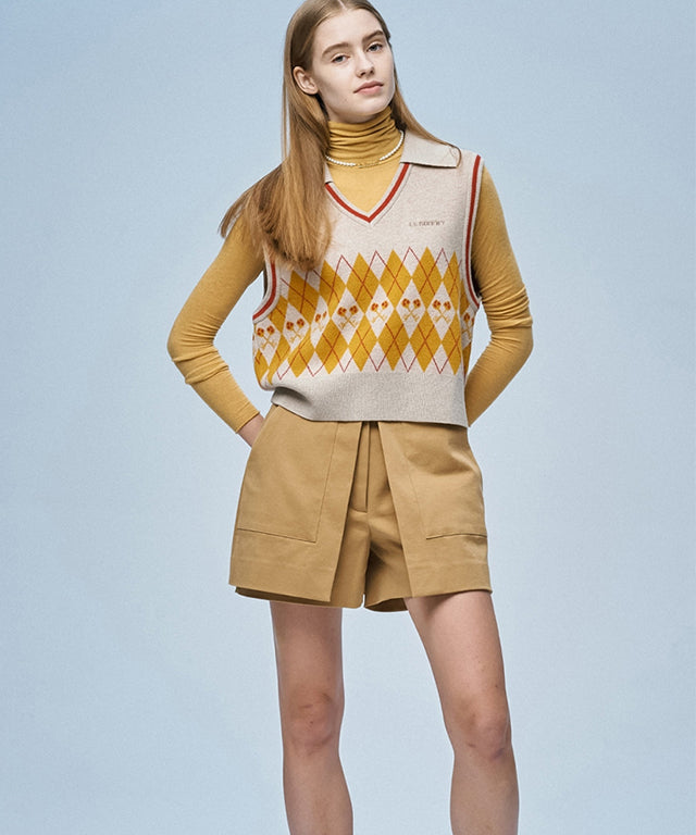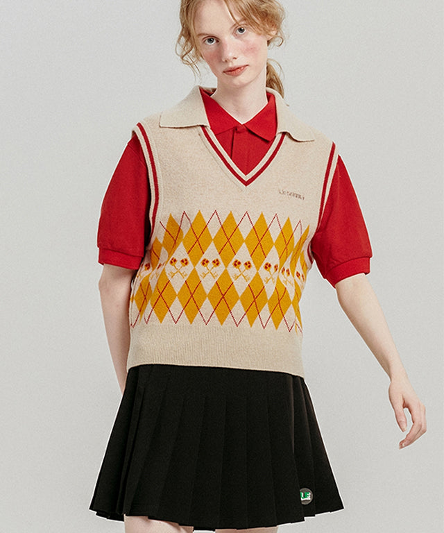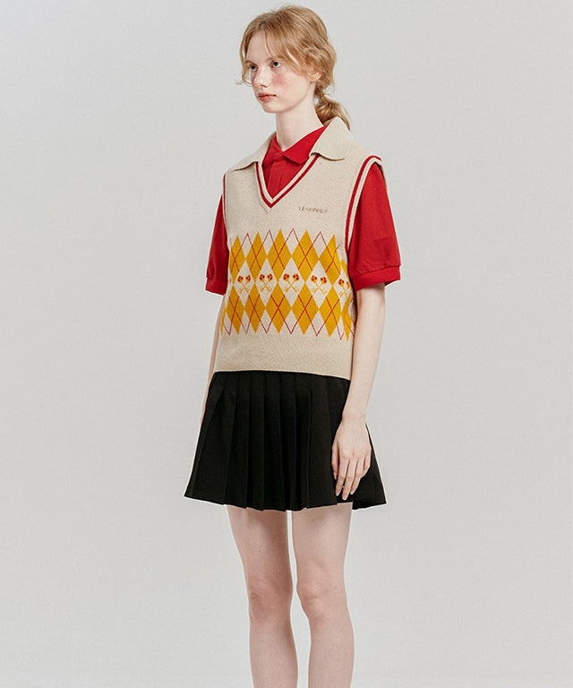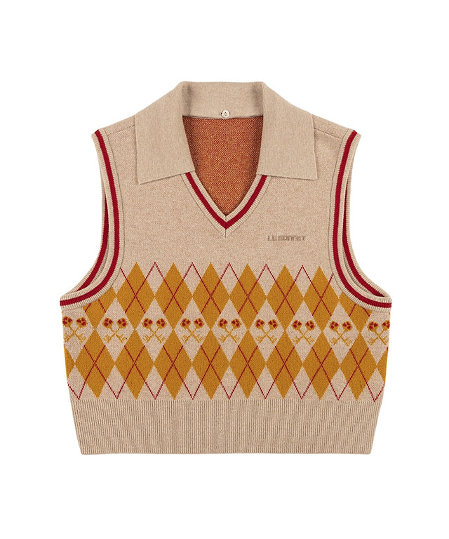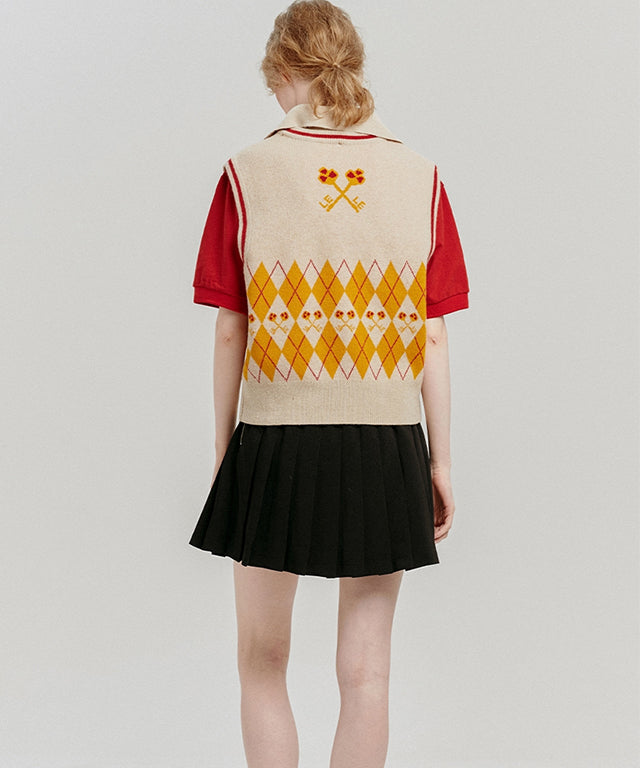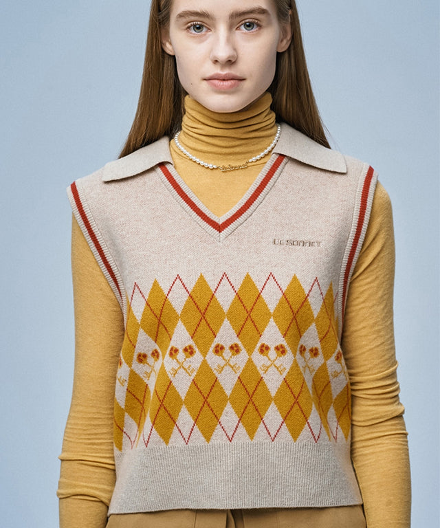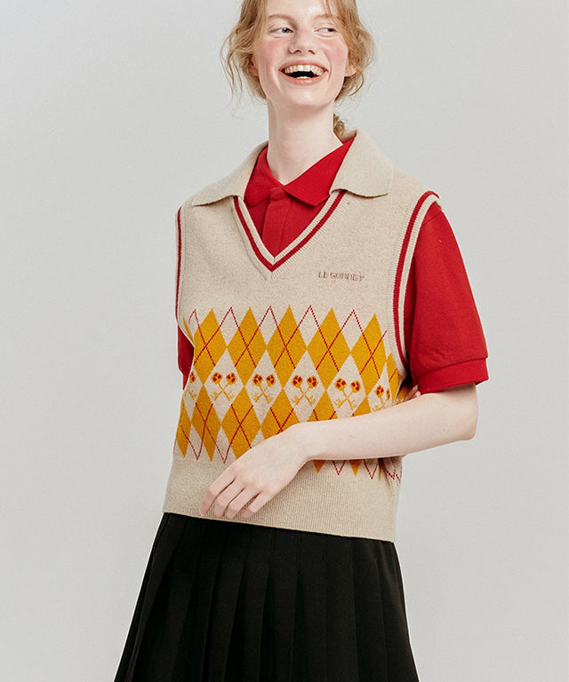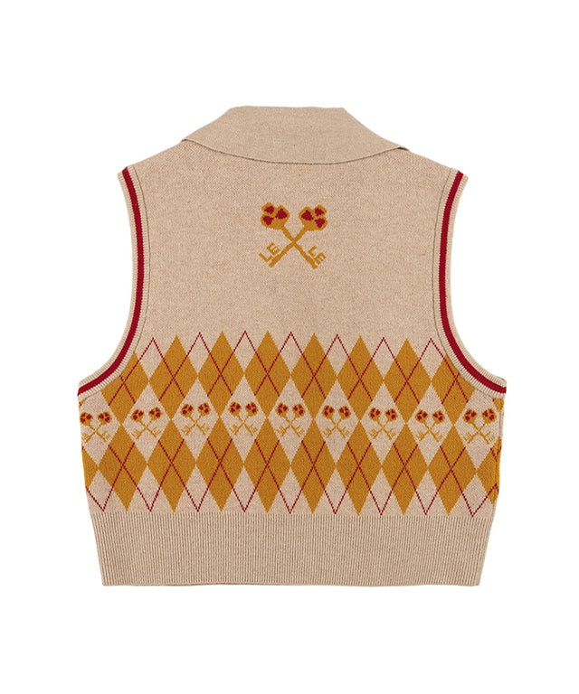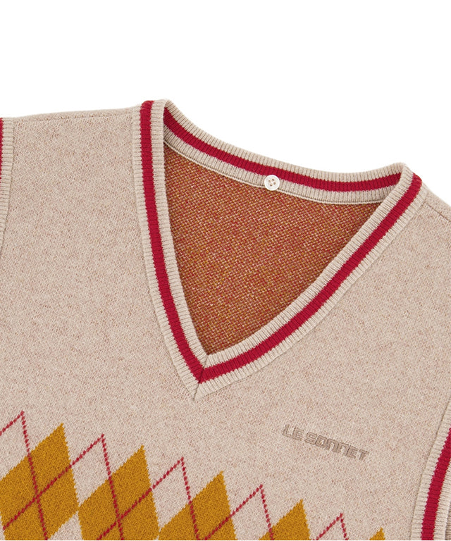 LE SONNET Logo & Argyle Knit Vest - Beige
