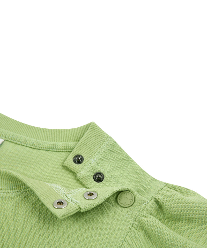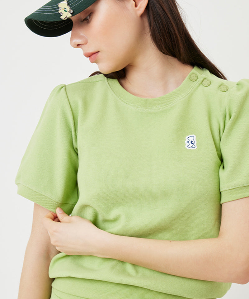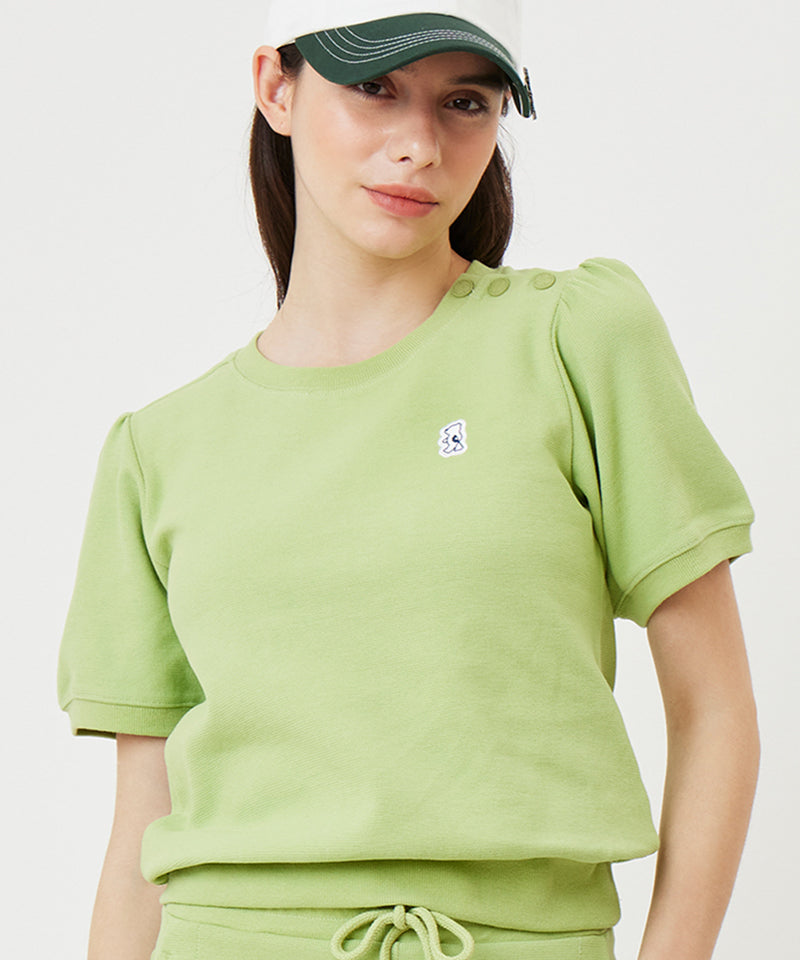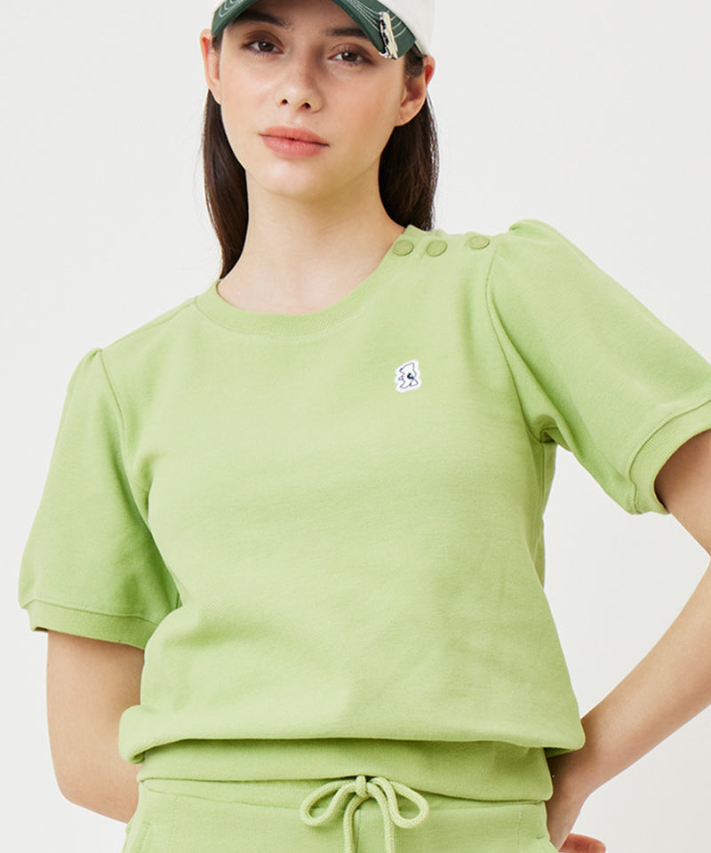 Planned short sleeve sweatshirt. Easy to wear with snap detail on the neck and puff detail on the sleeves for a feminine mood Item. Overall, the relaxed silhouette is not only in sports activities, but also in everyday life It's a good design to use.