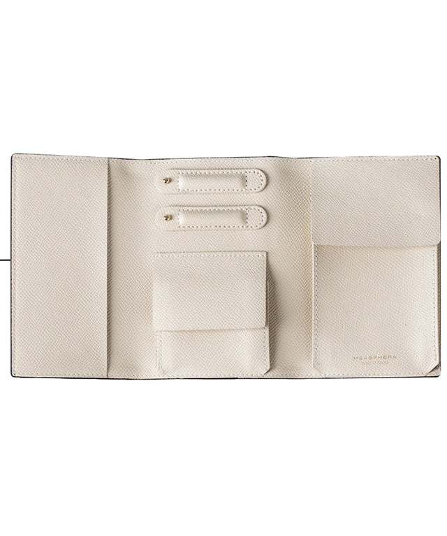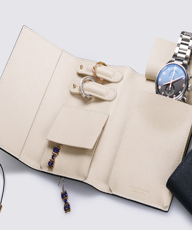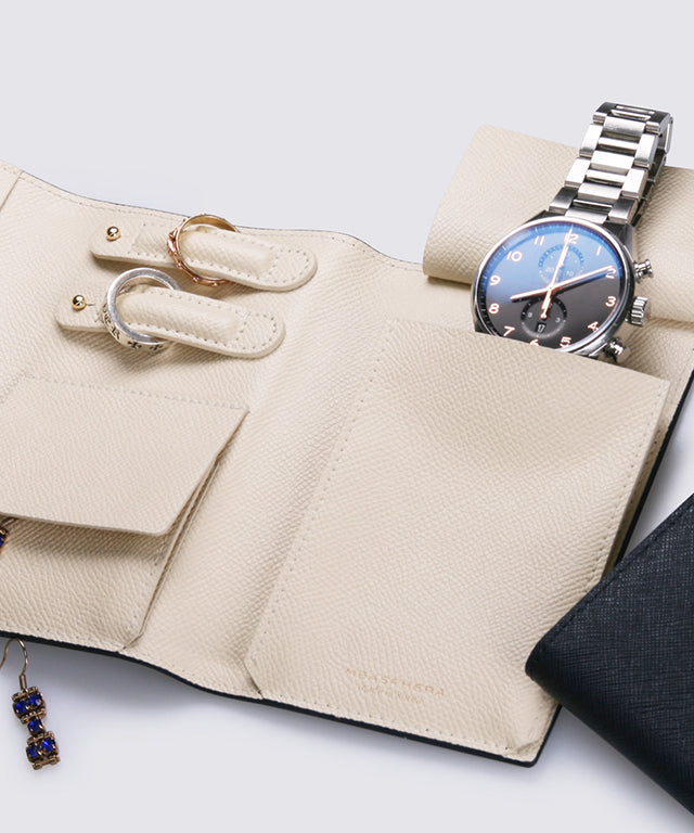 Pouch for storage of accessories and watches. Saffiano leather that is resistant to scratches. Classic leather strap and gold tip design