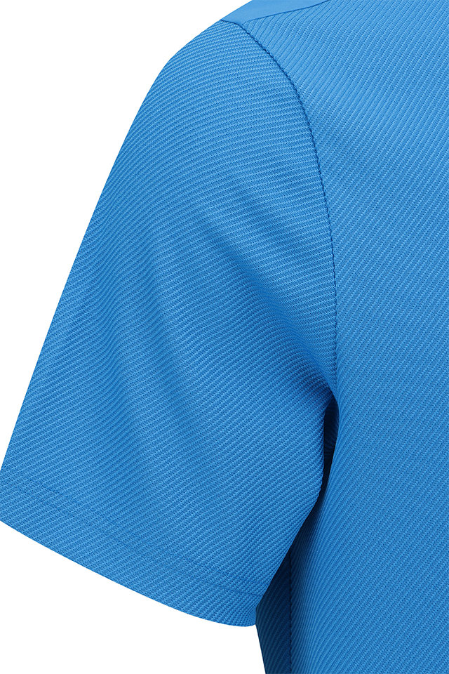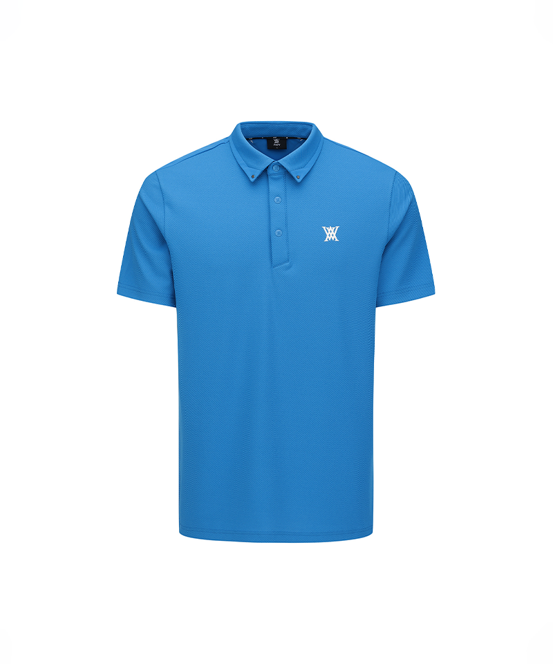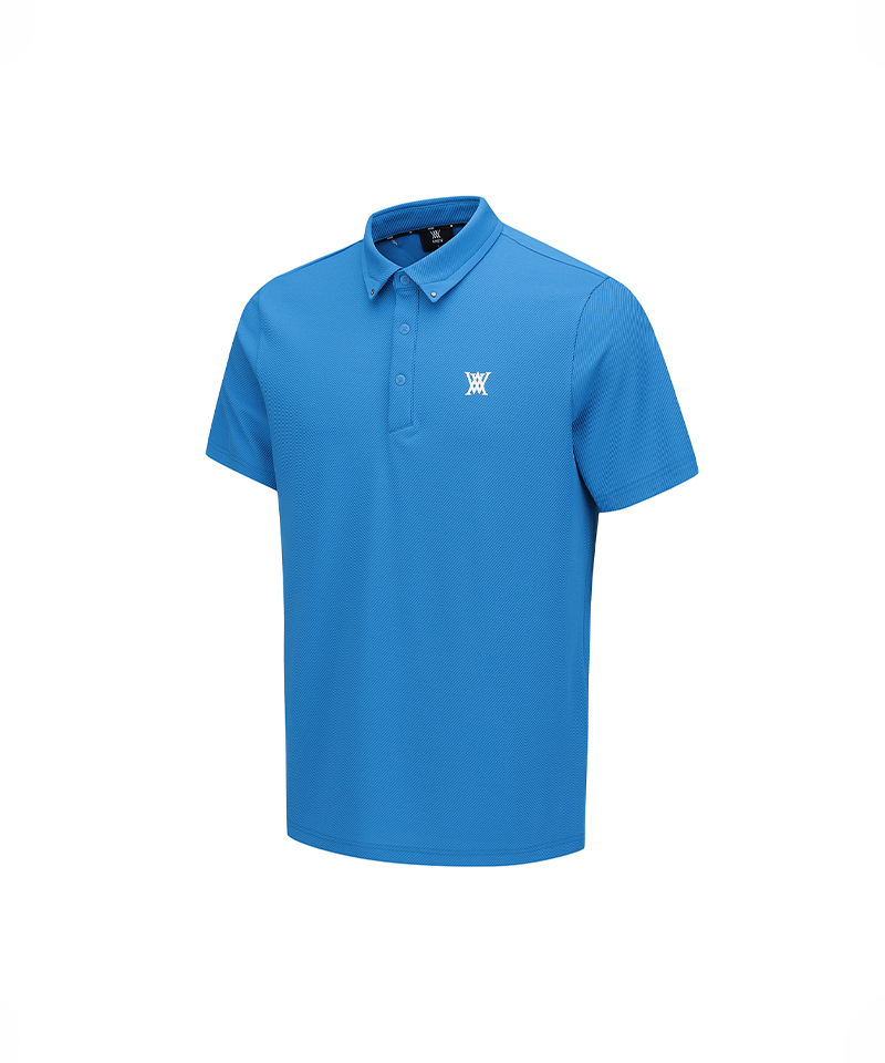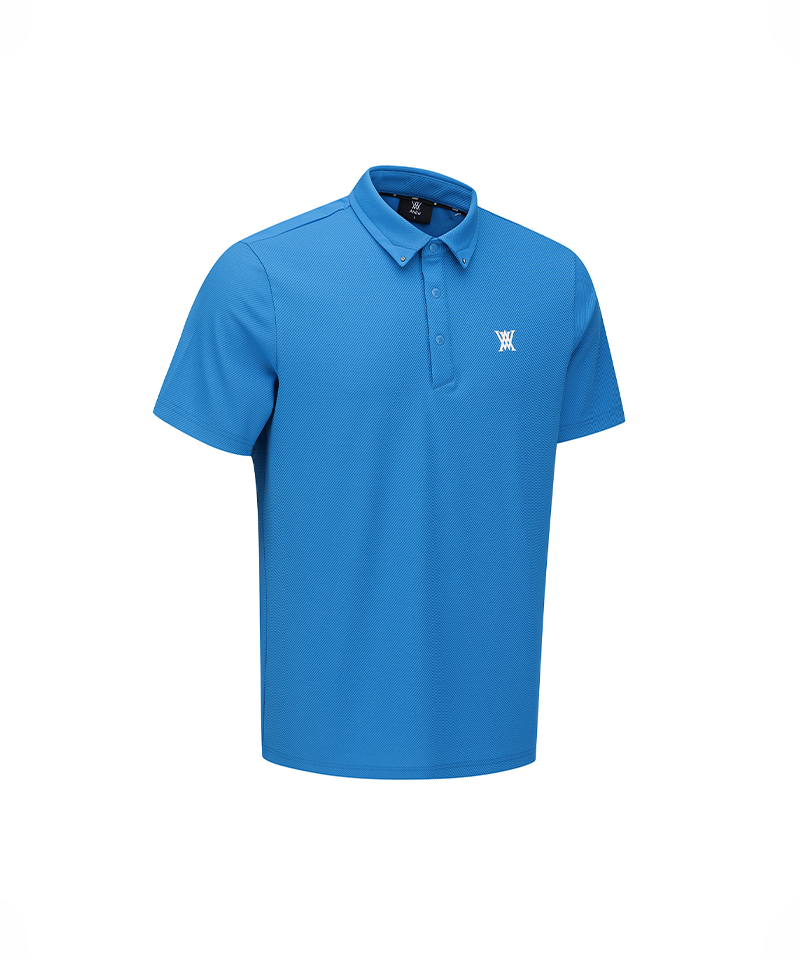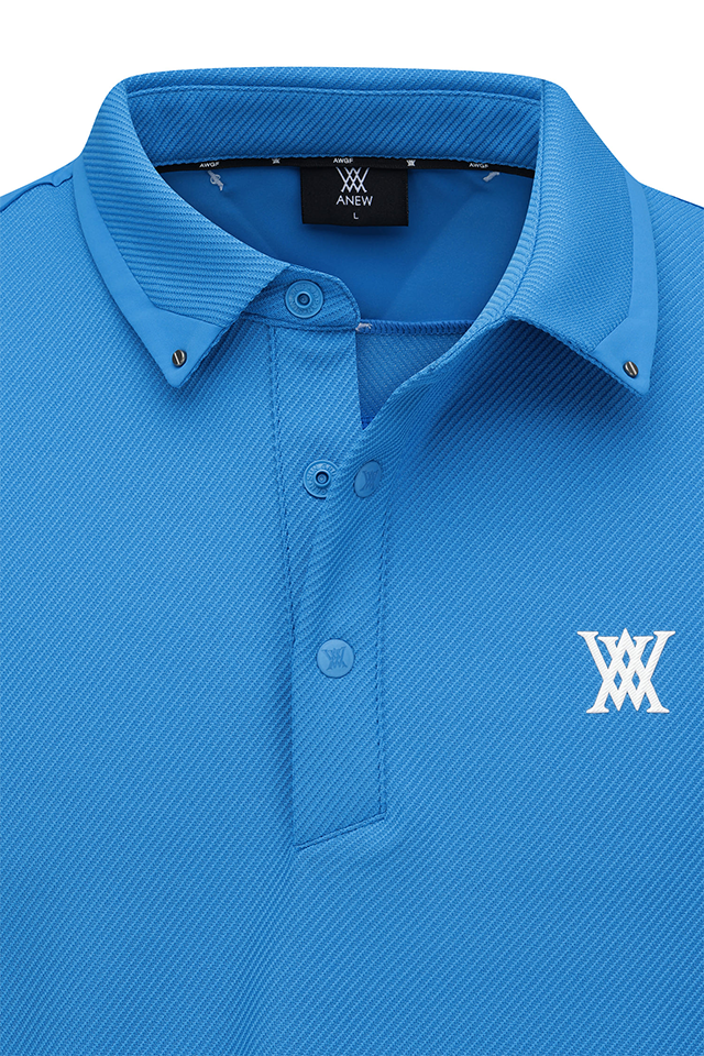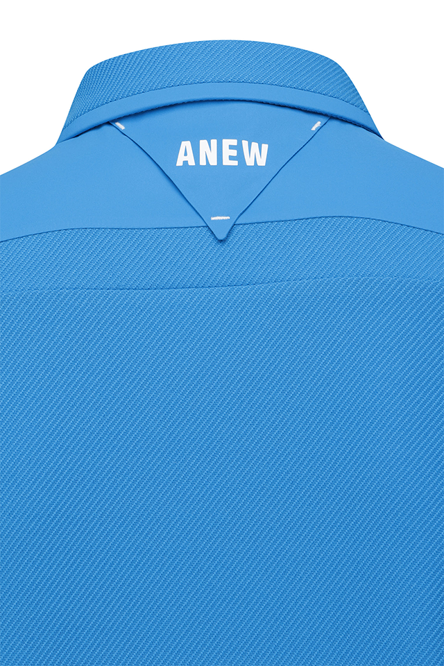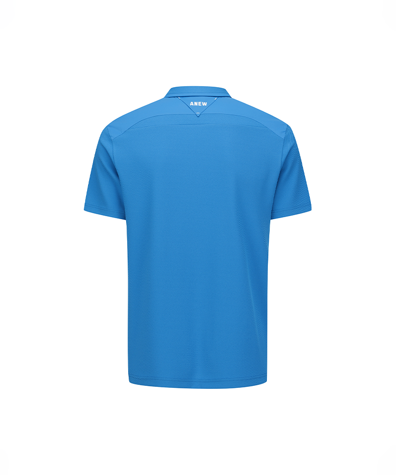 This men’s Y-neck hybrid half-sleeve T-shirt captures the unique sensibility of ANEW with a refined, modern design. Distinctive cut details at the collar add a subtle point of interest, while the back panel features a highly elastic woven material that ensures comfortable movement—even during active motions like swings. A batik-finished logo patch placed under the back neck subtly reinforces the brand identity, making this piece both functional and visually distinctive.