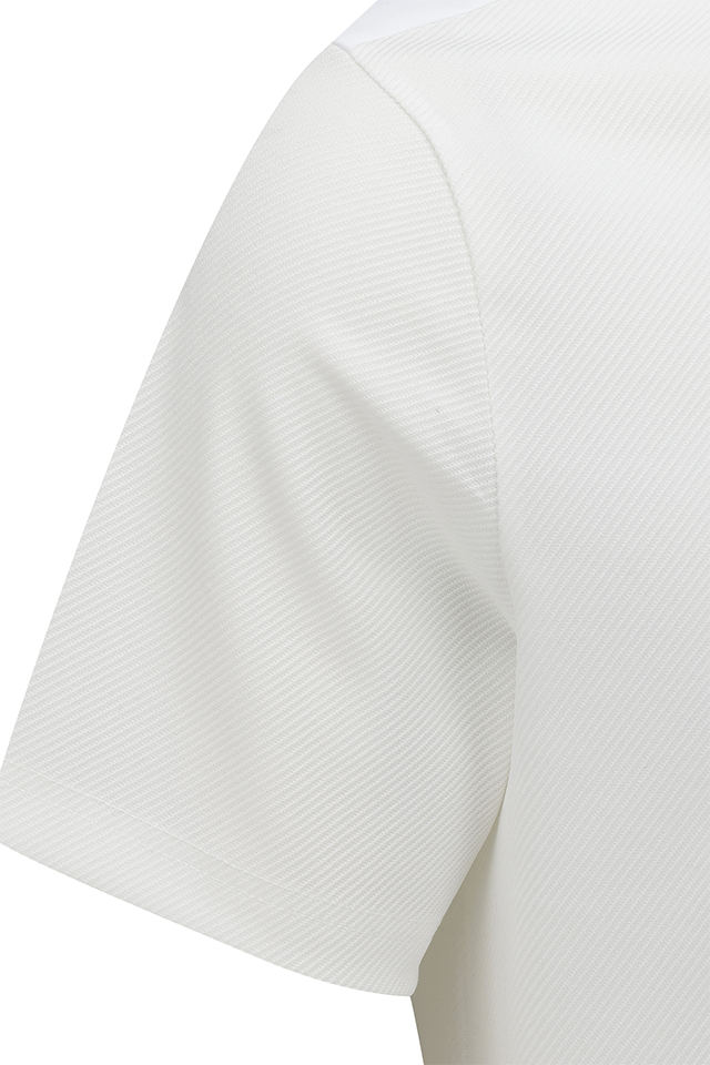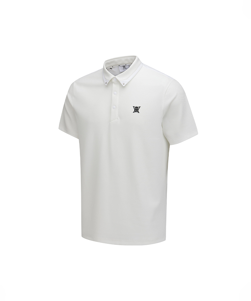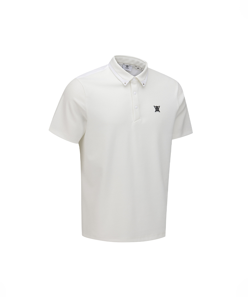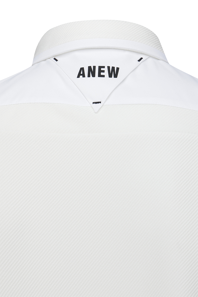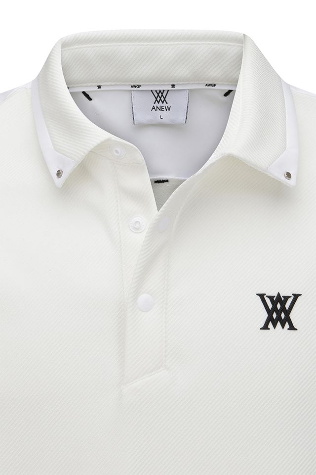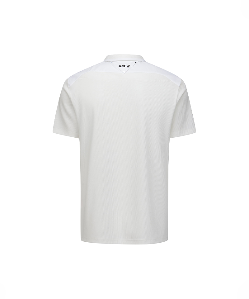 This men’s Y-neck hybrid half-sleeve T-shirt captures the unique sensibility of ANEW with a refined, modern design. Distinctive cut details at the collar add a subtle point of interest, while the back panel features a highly elastic woven material that ensures comfortable movement—even during active motions like swings. A batik-finished logo patch placed under the back neck subtly reinforces the brand identity, making this piece both functional and visually distinctive.