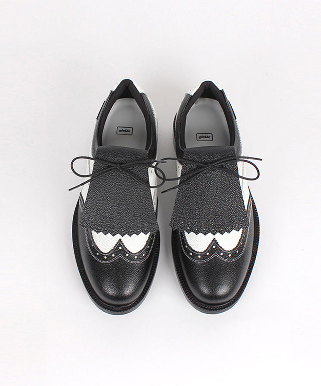 A modern reinterpretation of Giclee's philosophy that classic is the most basic, shoes with a design that can be worn comfortably in any look. High-quality textured embossed leather in contrasting color combination, leather outsole used for added comfort.