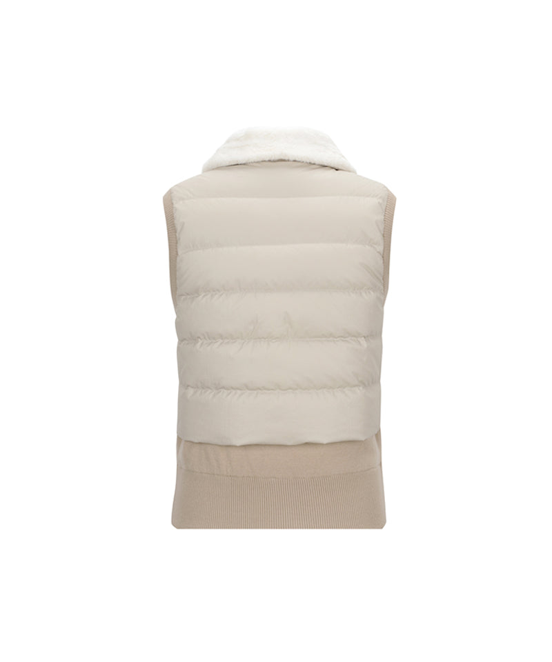 This is a faux fur collar hybrid down vest that can be comfortably worn over a warm and thick inner layer. The fur collar adds a more feminine touch, and the goose down makes this down vest very warm in the winter.