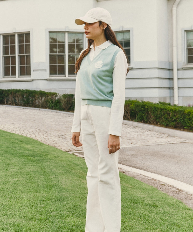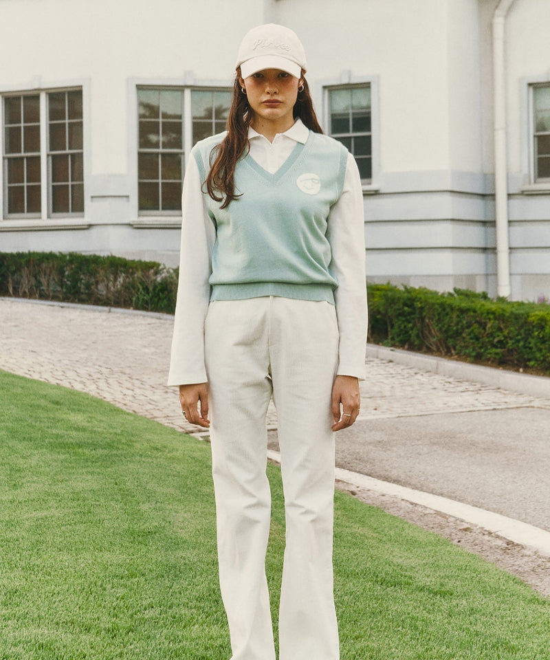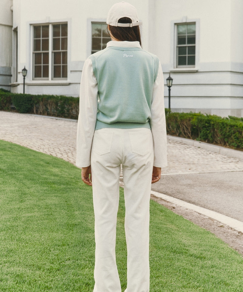 This V-neck knit vest, crafted from cozy wool, offers a comfortable and refined fit. Its V-neck design exudes timeless elegance, enhanced by a subtle PvB logo jacquard on the front and embroidered PvB lettering on the back. With a classic style, this versatile piece pairs effortlessly with a range of bottoms. Made entirely from wool in Korea.