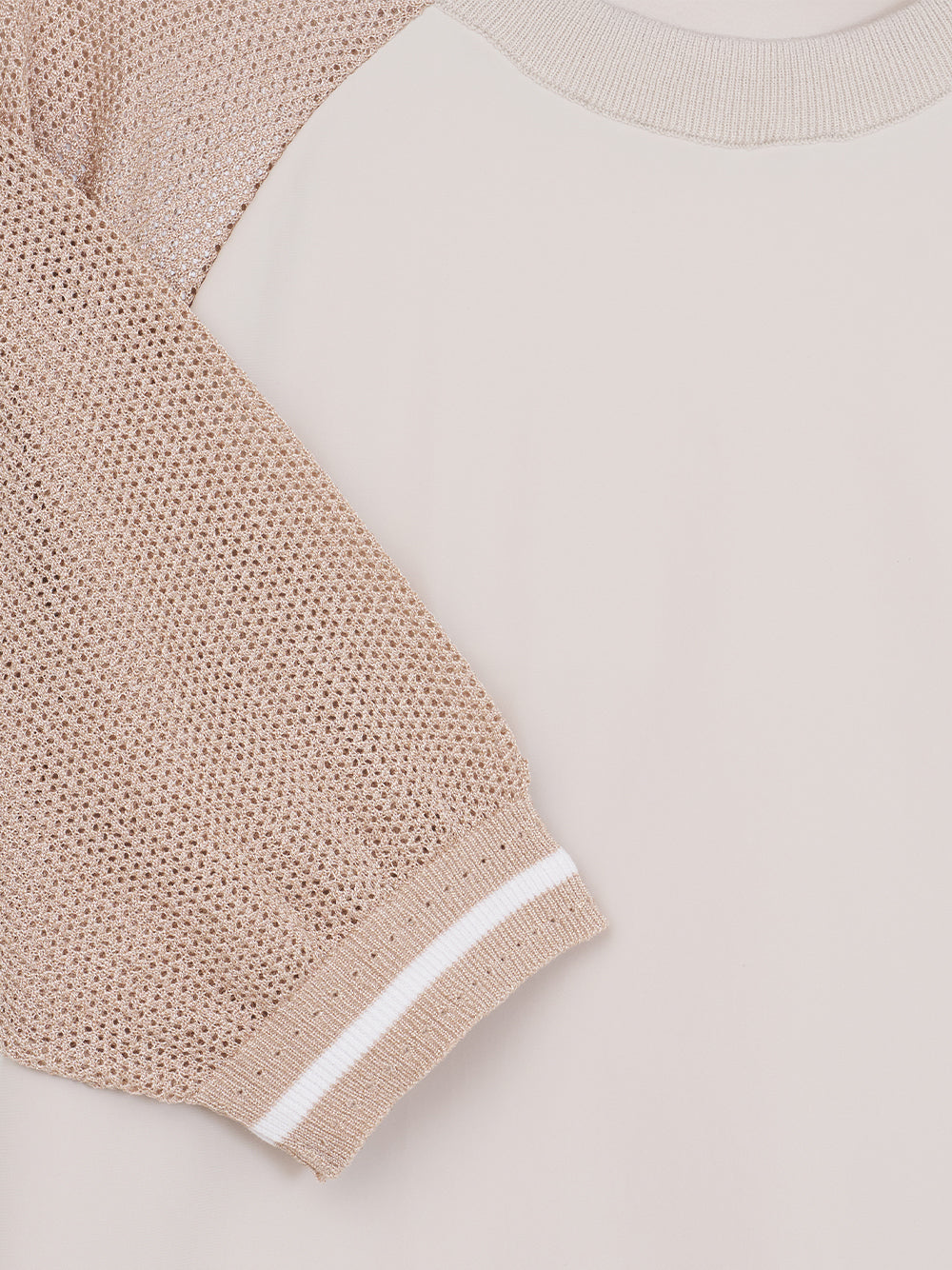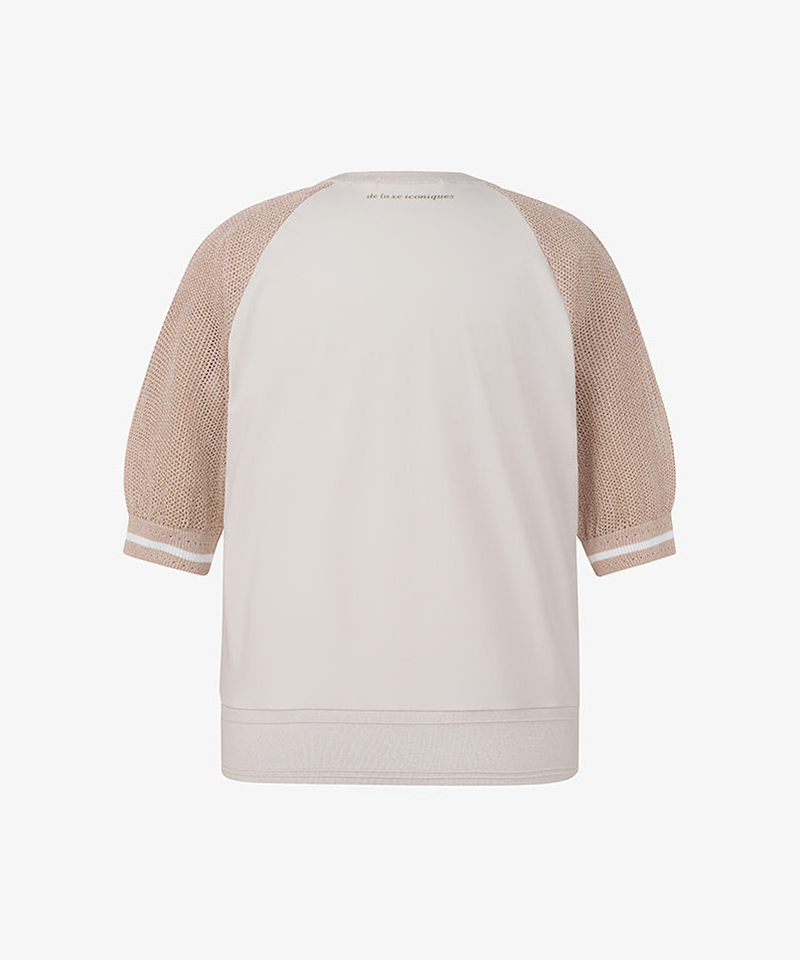 A performance golf knit with full sweater construction and subtle sparkle from glitter yarn on the sleeves.