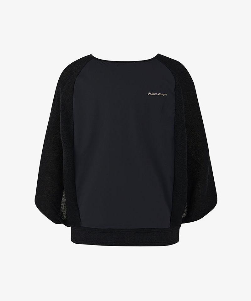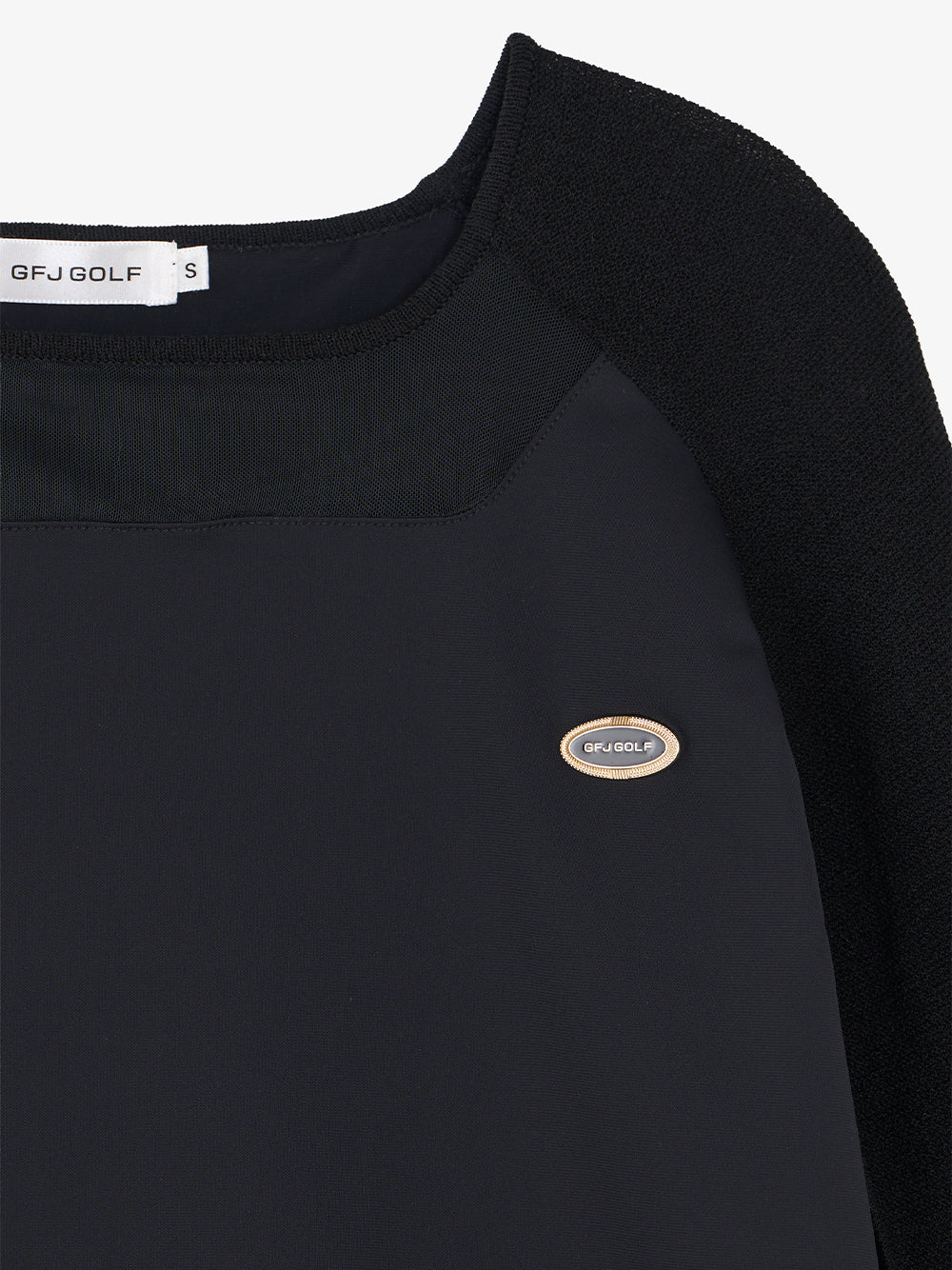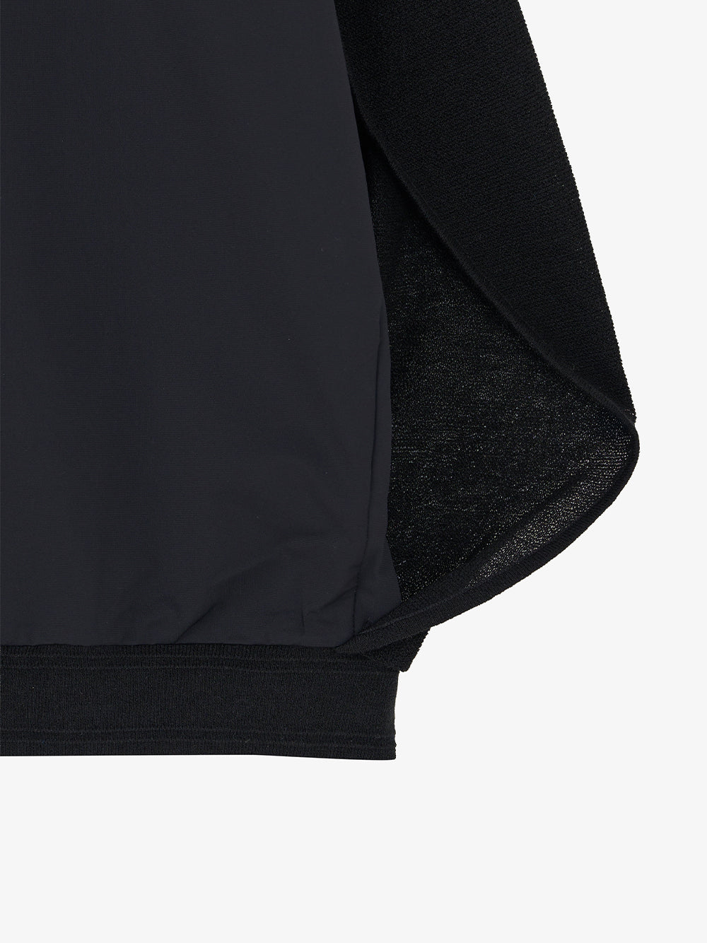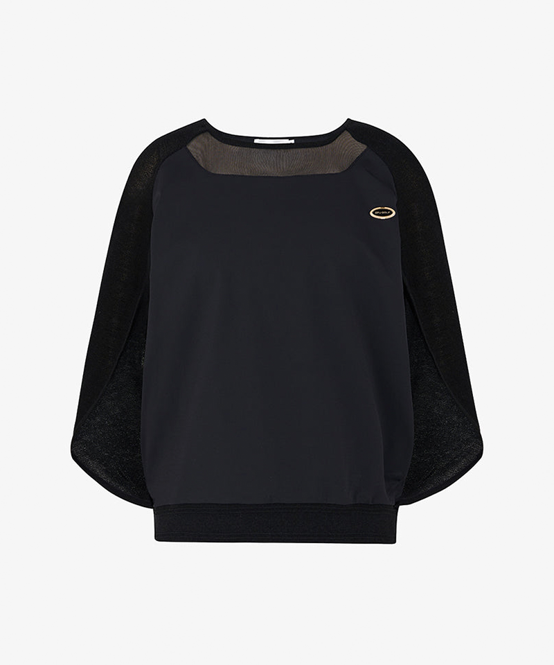 A hybrid sweater with mesh-knit cape sleeves that blend breathability with a feminine touch—perfect for a stylish round.