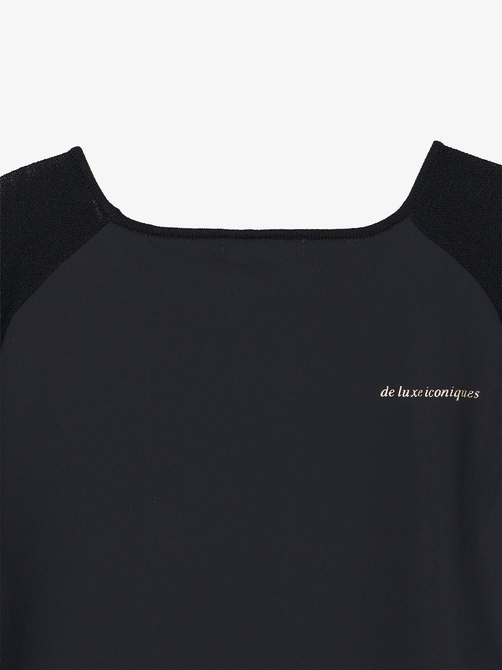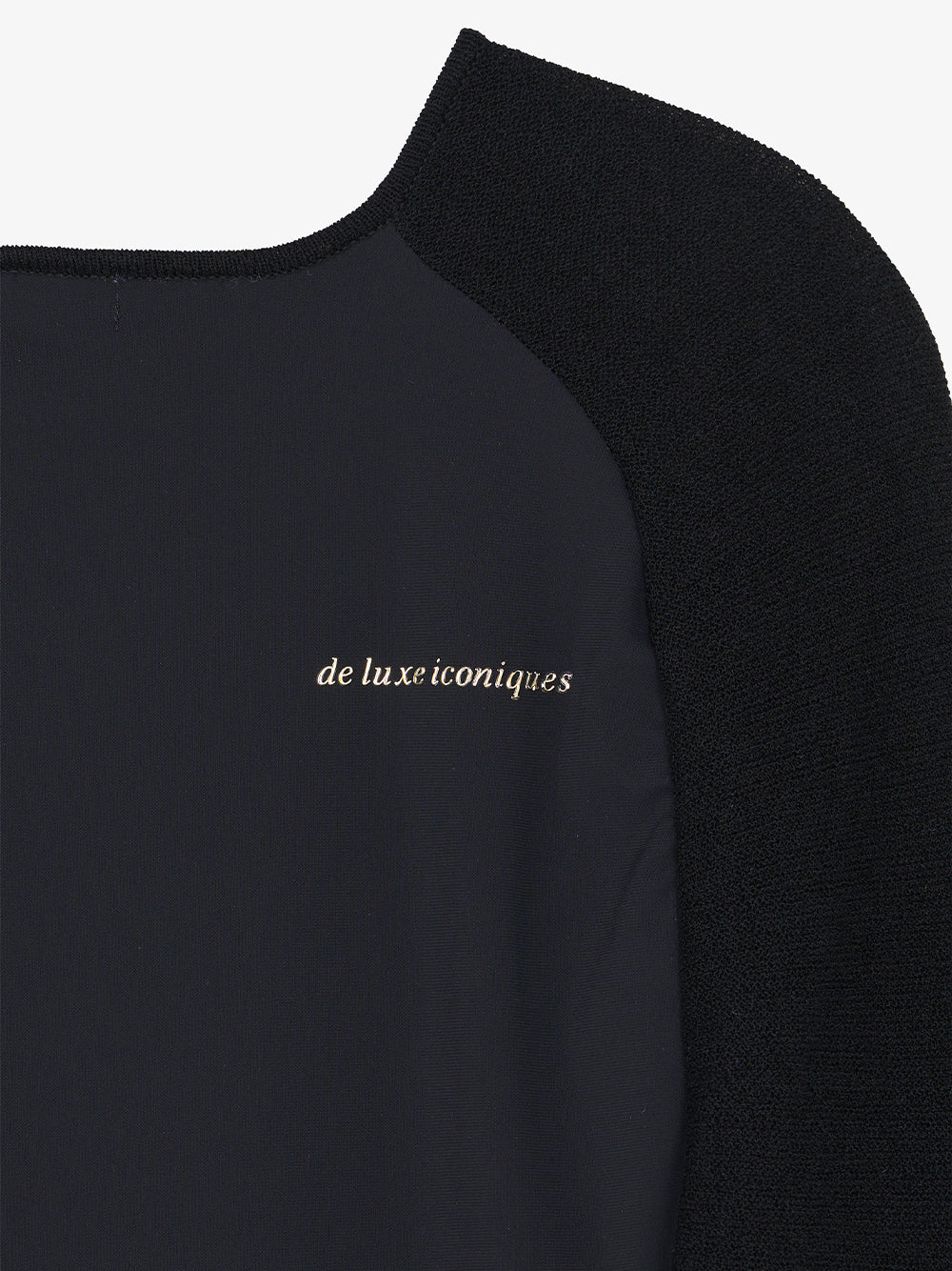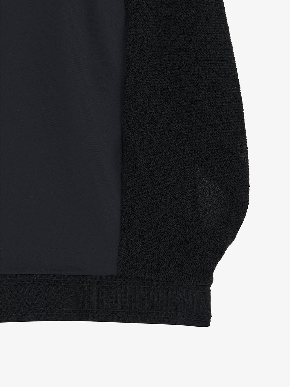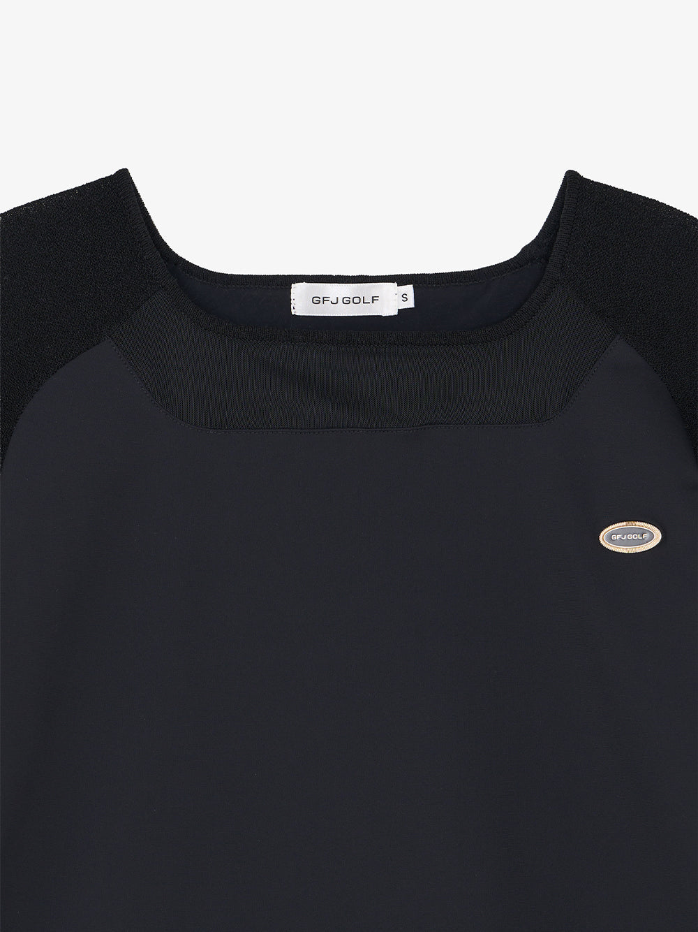 A hybrid sweater with mesh-knit cape sleeves that blend breathability with a feminine touch—perfect for a stylish round.