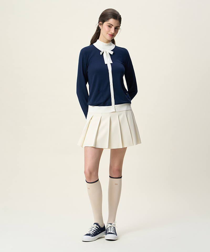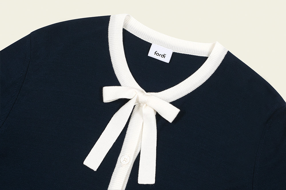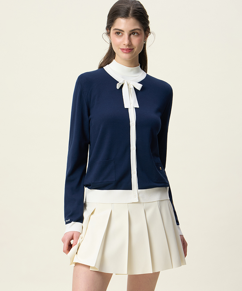 A soft-touch, lightweight knit cardigan with a refined color palette that enhances any look. The viscose blend ensures a smooth and comfortable feel, while seasonal theme colors provide a sophisticated aesthetic. Feminine ribbon details add elegance, making it a versatile essential for layering with various outfits.