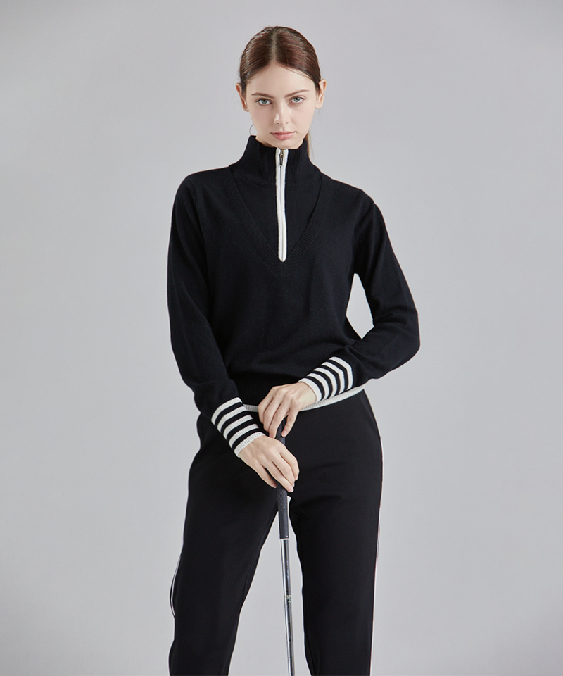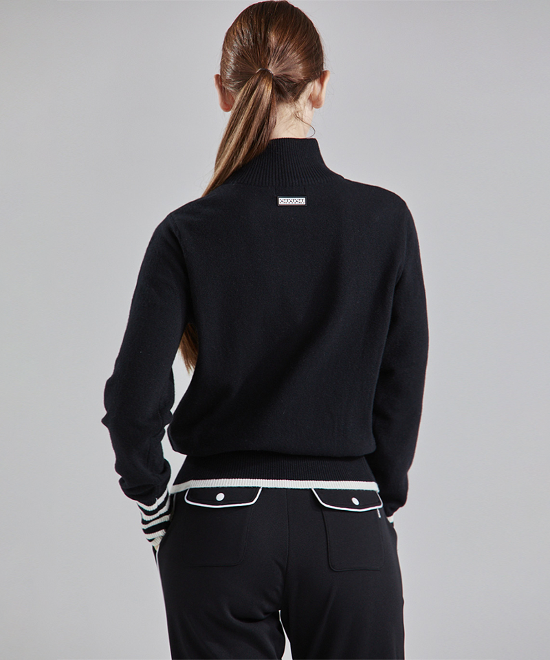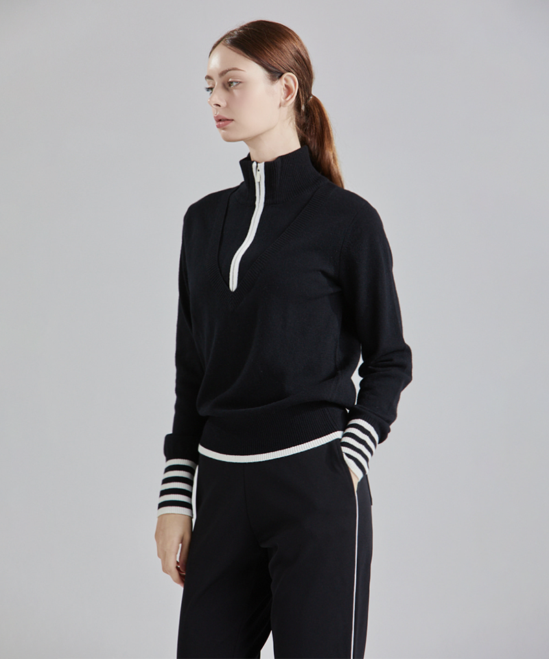 The CHUCUCHU Deep Half Zip-Up Wool Blend Knit in Black merges classic sophistication with exceptional comfort. Made from a premium wool blend, its deep half-zip design delivers a sleek, contemporary silhouette. The rich black hue enhances its timeless appeal, making it a refined and versatile addition to any elegant wardrobe.