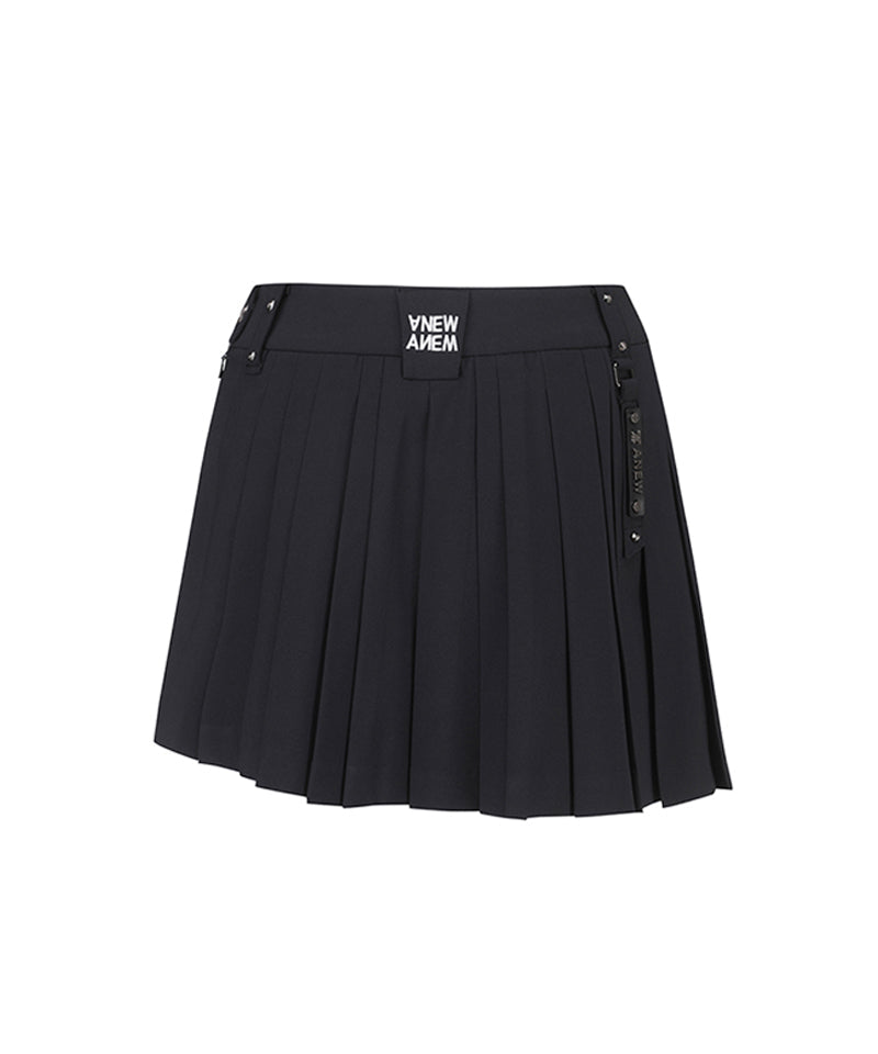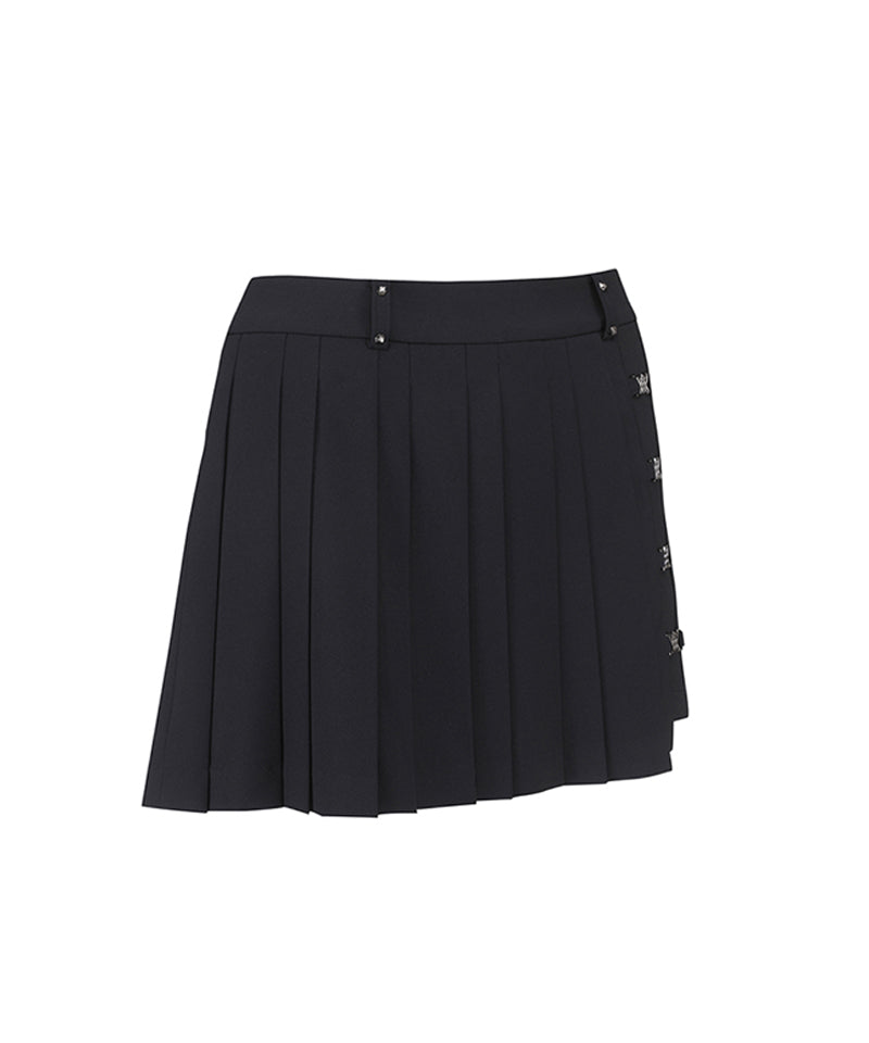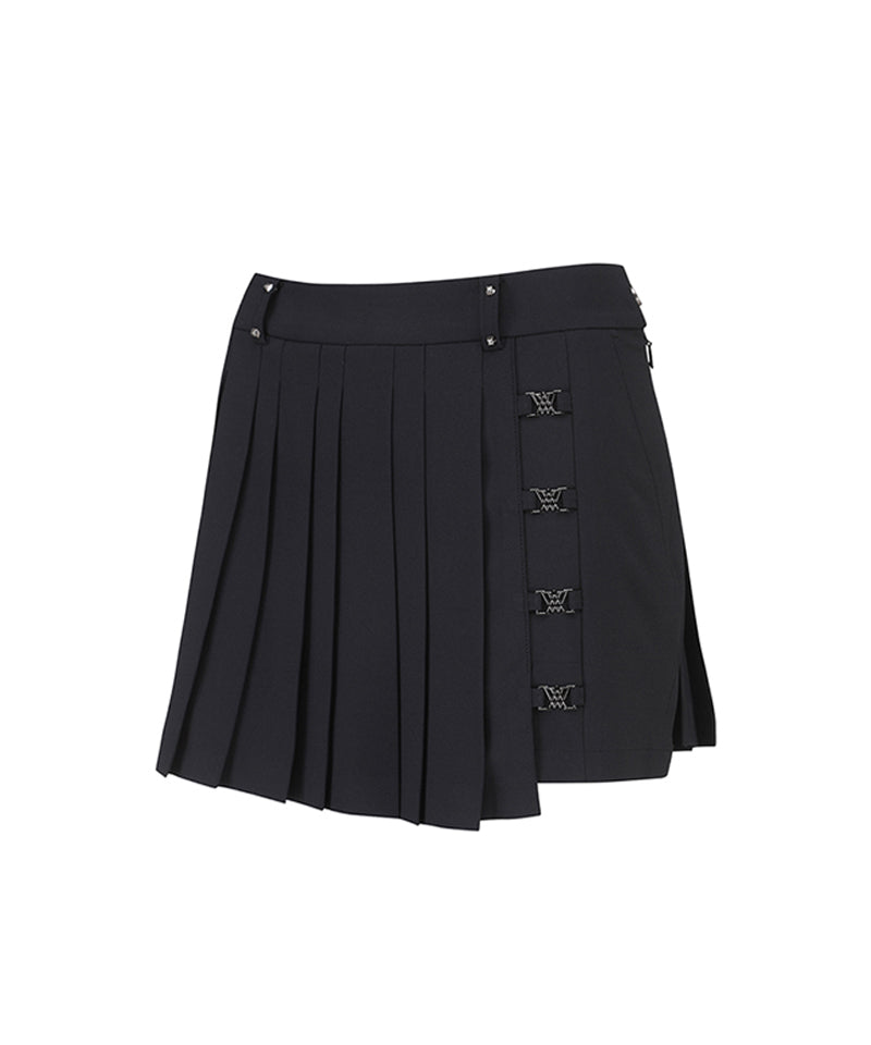 It is a skirt pants with a metal shape and a collar. The outer part and the pants are connected with a metal logo, and the form of pleats that enter the outer part is also