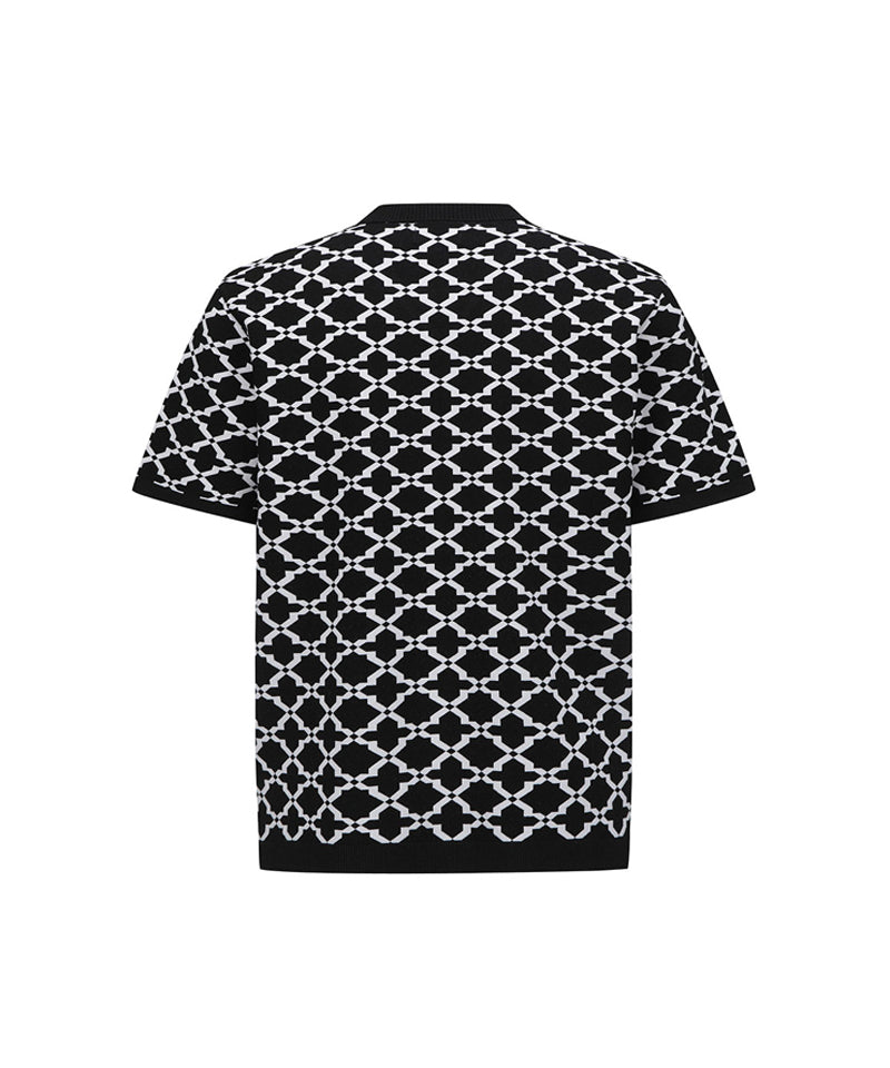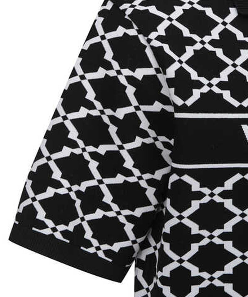 Weiss's soft and thin gauge yarn this is a short-sleeved knit with jacquard knitted using a front pattern. The relaxed overfit gives a casual feel, such as joggers and sweatpants. It is a highly versatile item that can be paired with a variety of bottoms.