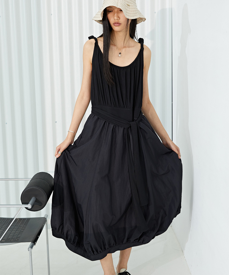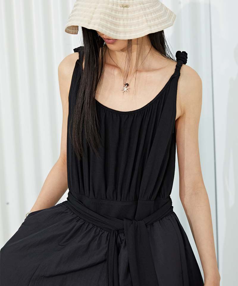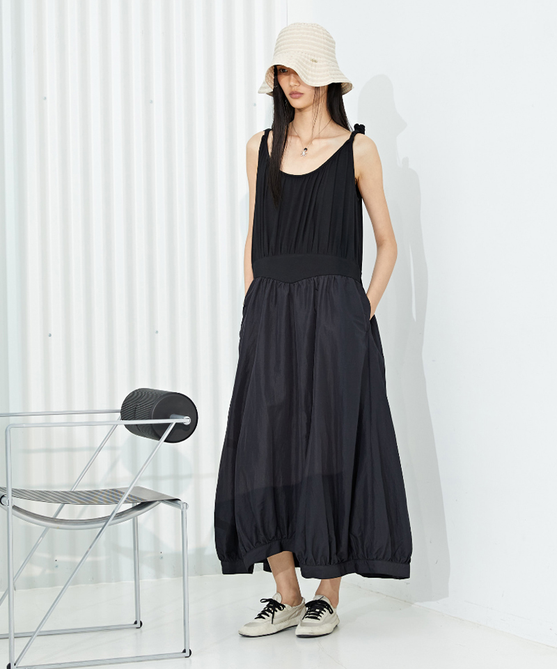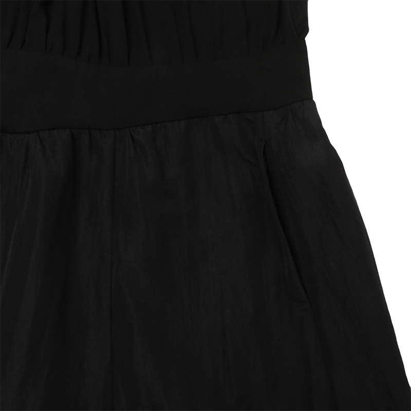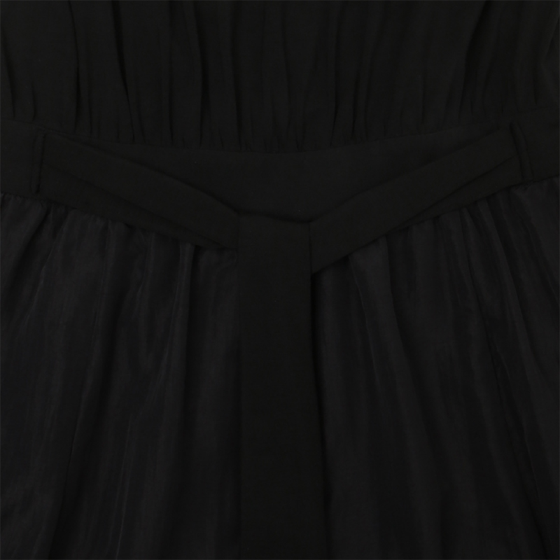 This summer one-piece features a breezy design with a soft V-neck and an open back that enhances airflow. The contrasting materials—cool, stretchy Tencel on top and lightweight nylon skirt—ensure comfort and style. Adjustable waist ties allow for a tailored or relaxed fit, while pleated and shirred details add elegance. Its asymmetrical hem and textured fabric blend create a refined yet airy look, perfect for effortless summer sophistication.
