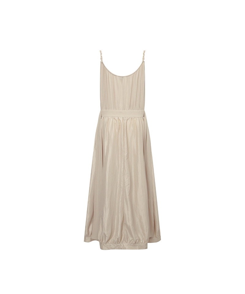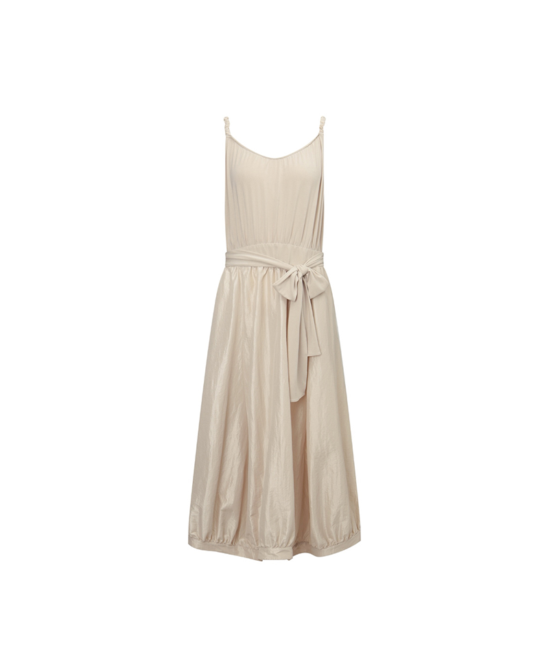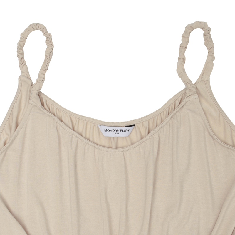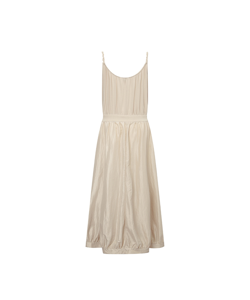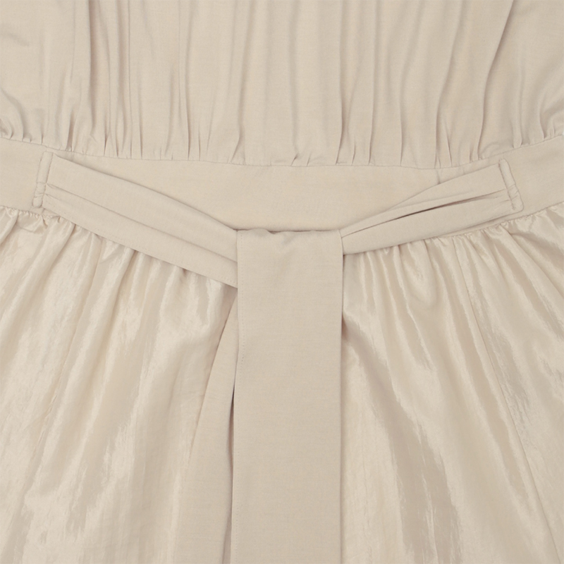 This elegant summer one-piece in light beige combines a soft, breathable Tencel jersey top with a lightweight, subtly shiny nylon skirt for a cool, comfortable fit. Designed with a rounded V-neck, airy back cutout, and asymmetrical hemline, it offers effortless movement and a refined silhouette. Adjustable waist ties and pleated details add a feminine touch, making it perfect for both everyday wear and vacations. Stay stylish and comfortable all season with this sophisticated, breathable dress.