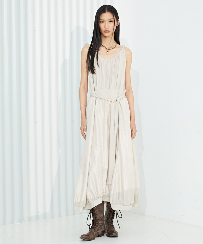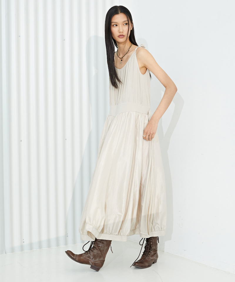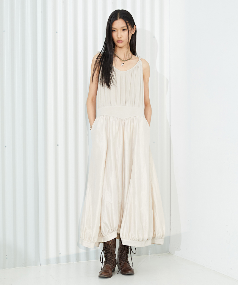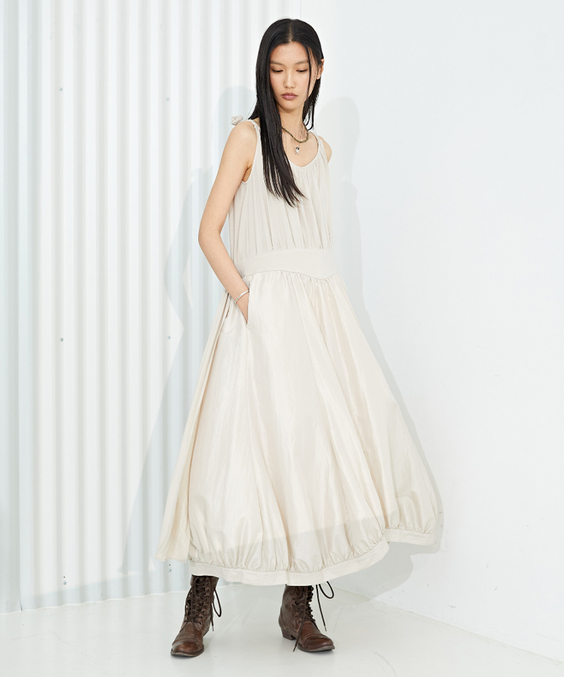 This elegant summer one-piece in light beige combines a soft, breathable Tencel jersey top with a lightweight, subtly shiny nylon skirt for a cool, comfortable fit. Designed with a rounded V-neck, airy back cutout, and asymmetrical hemline, it offers effortless movement and a refined silhouette. Adjustable waist ties and pleated details add a feminine touch, making it perfect for both everyday wear and vacations. Stay stylish and comfortable all season with this sophisticated, breathable dress.