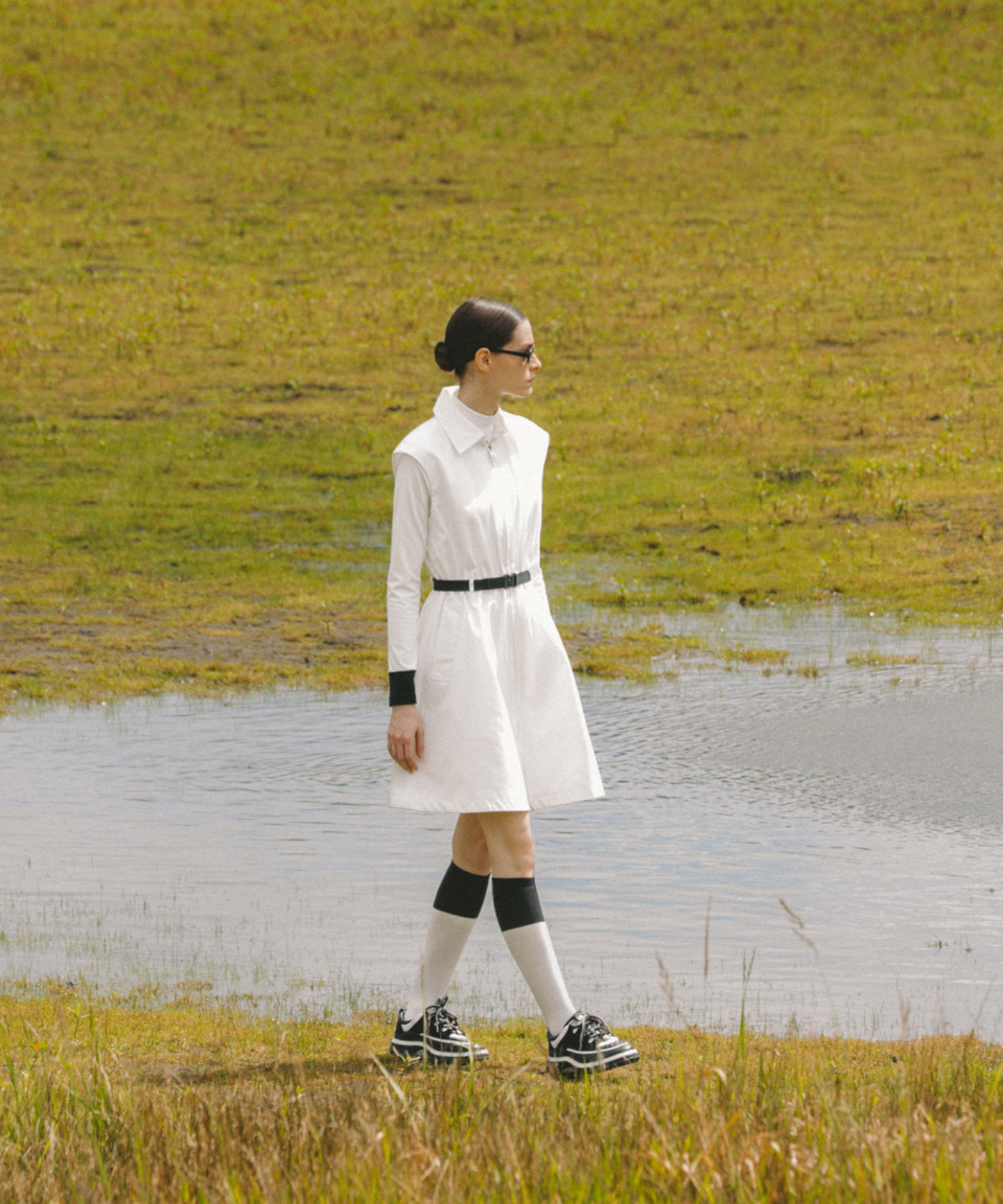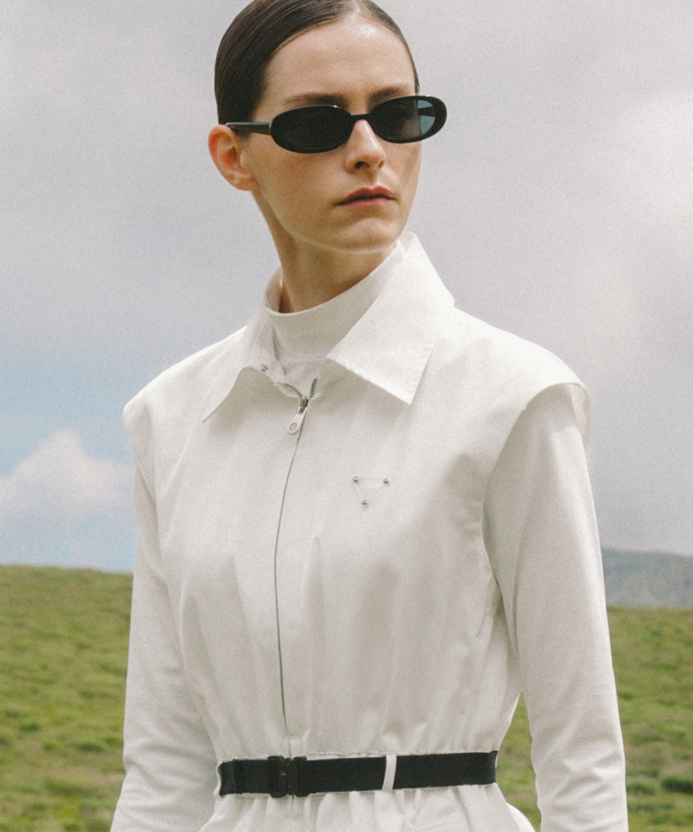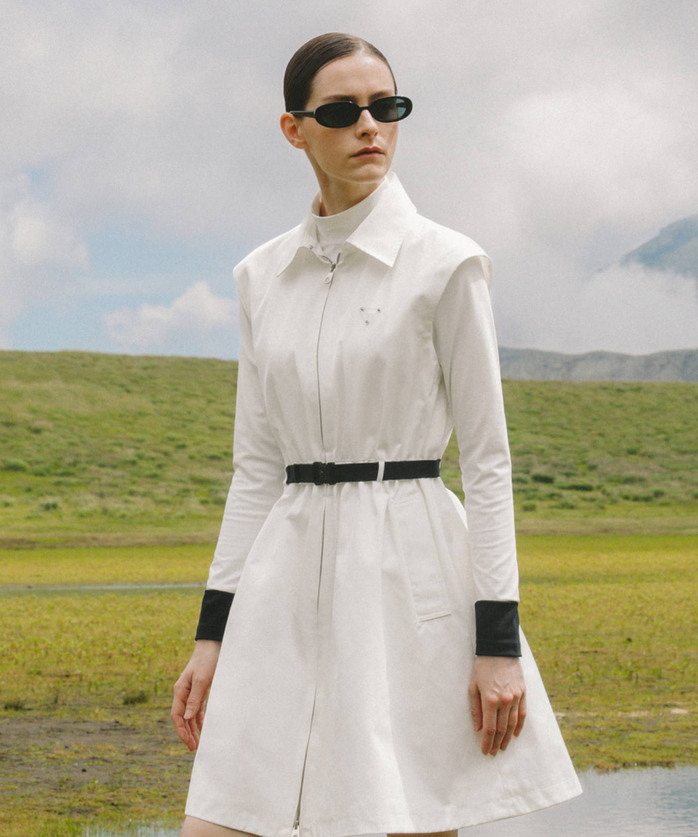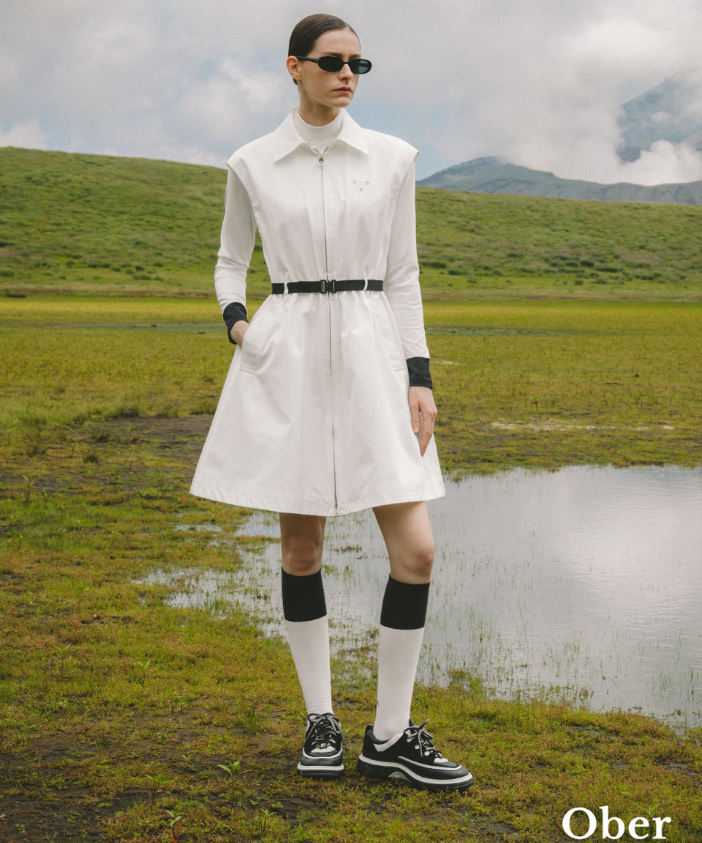 A windbreaker vest-style one-piece dress made of memory fabric with a subtle sheen. Perfect design as a vest outerwear or as a single piece. Built-in waist banding provides a comfortable fit and a feminine shape. Two-way zipper for easy movement. The band-type belt set creates a line and adds a sophisticated touch. Express your brand identity with the newly developed Ober Golf patch.