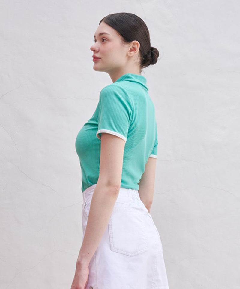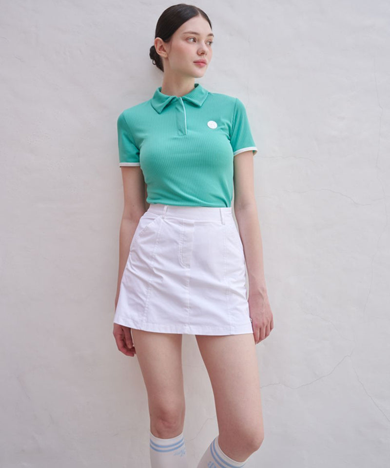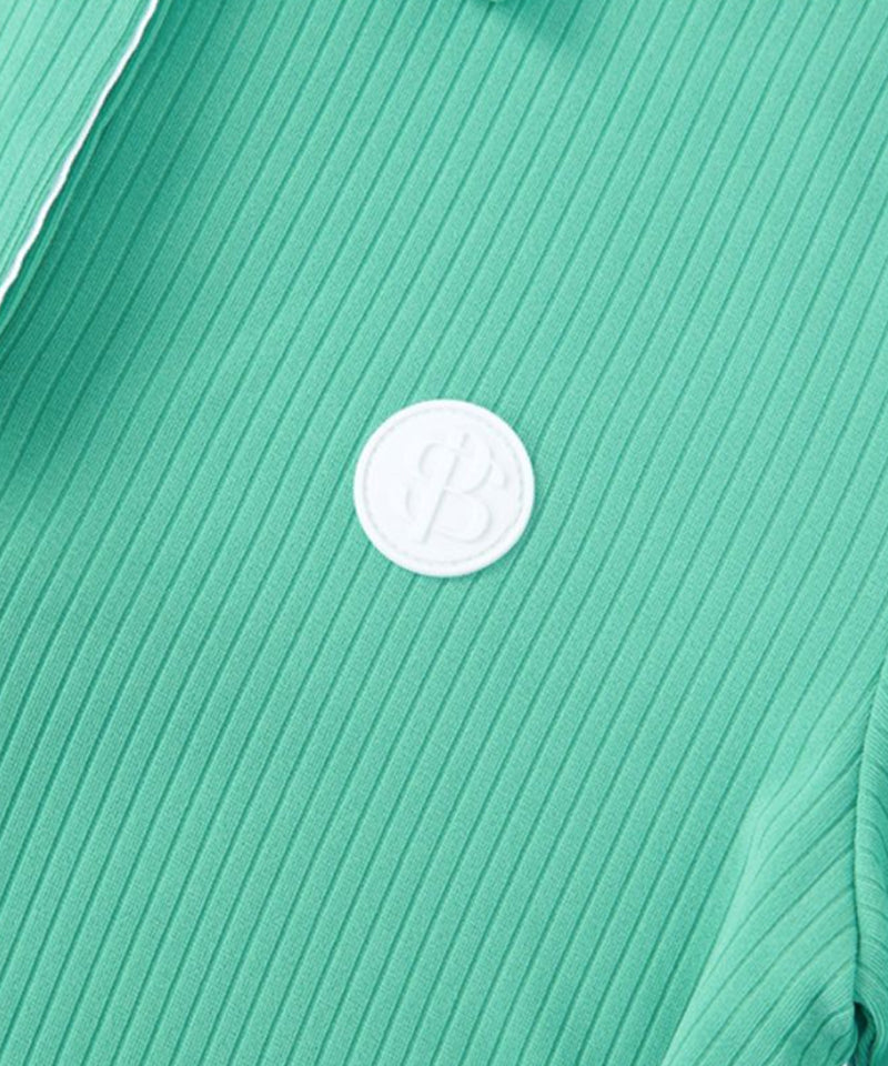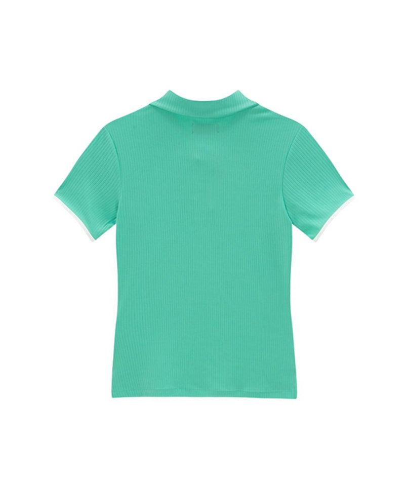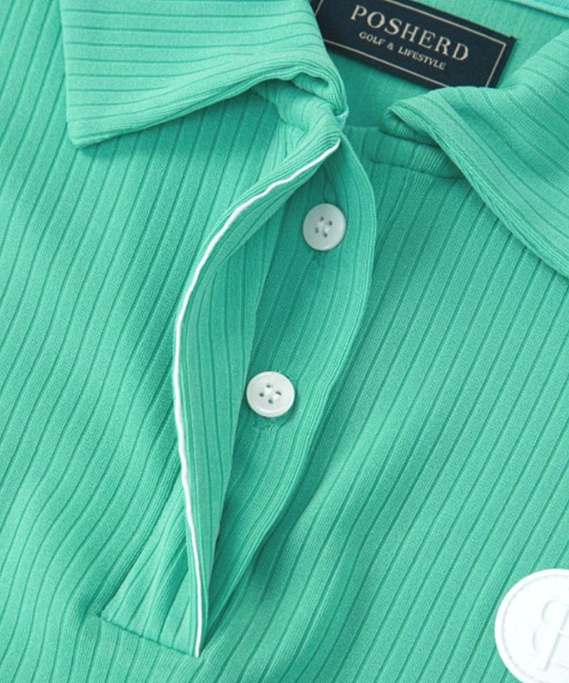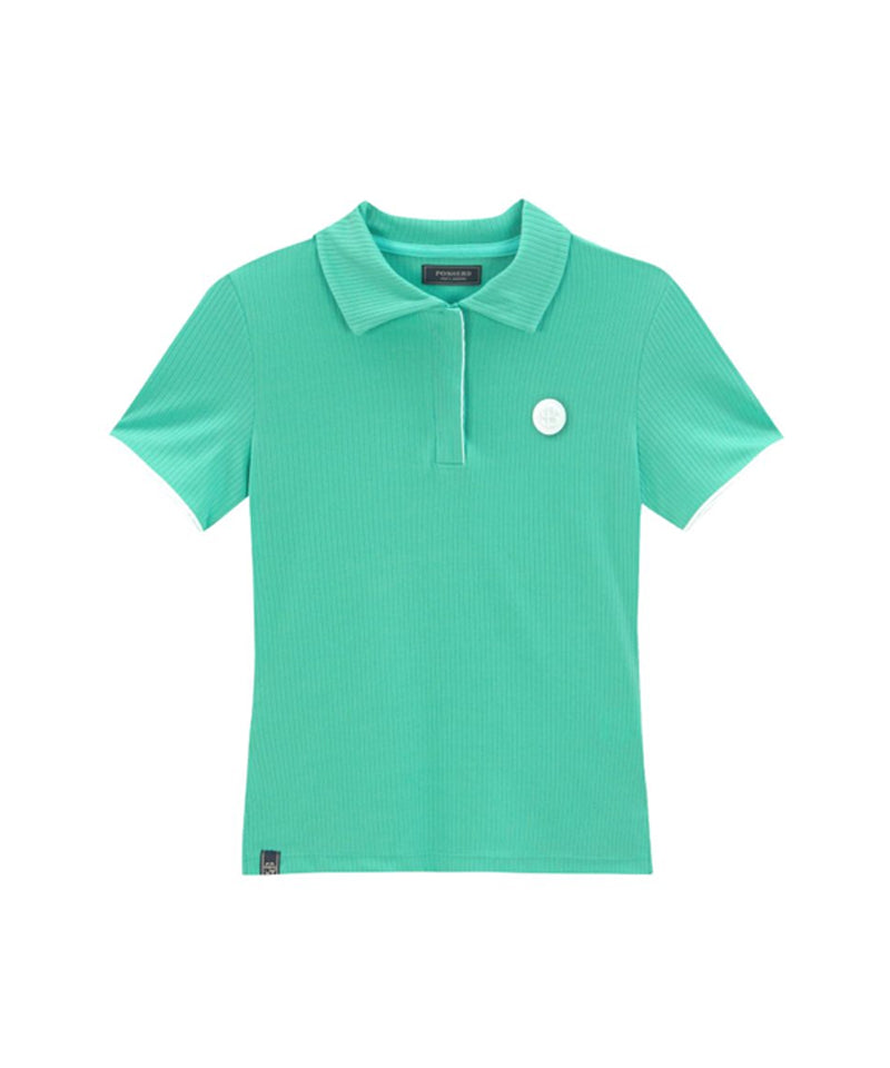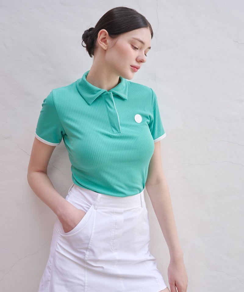 Golf collar top with attractive bright and refreshing colors A cooling jersey with a cool touch that reduces wrinkles. Comfortable fit thanks to light and soft poly material pearl glitter folding band point at the bottom of the sleeves. Clean design with hidden button details items that are great to match with point styling.