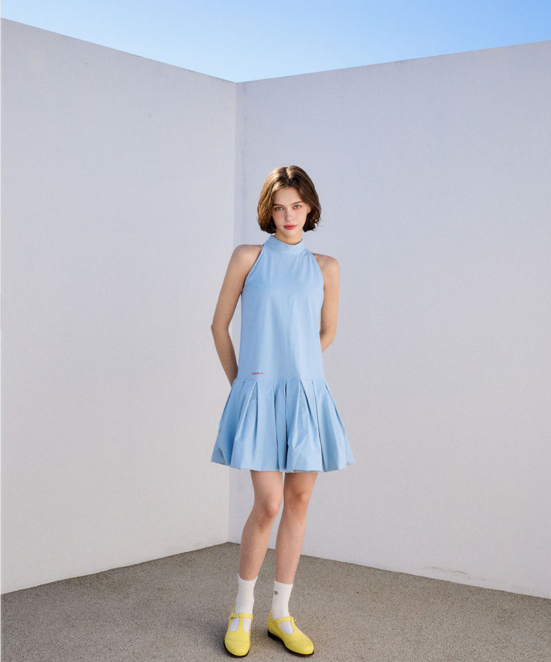 This halter one-piece dress is made of soft, elastic fabric, offering a light and comfortable fit. The relaxed A-line silhouette and mid-length design provide a perfect balance of comfort and sophistication. The voluminous skirt adds an elegant touch, while practical side pockets enhance its functionality. Additionally, the dress features a set of functional inner pants, making it an ideal choice for active wear on the field.