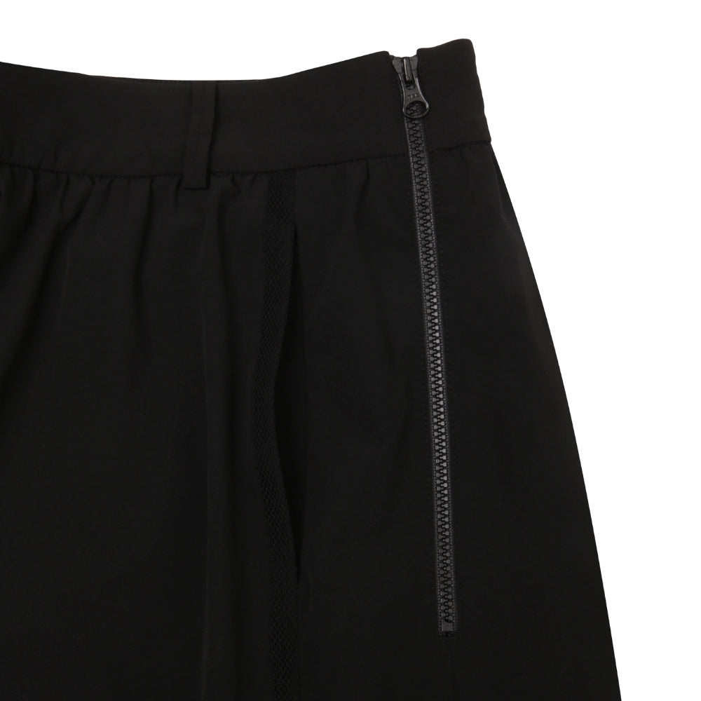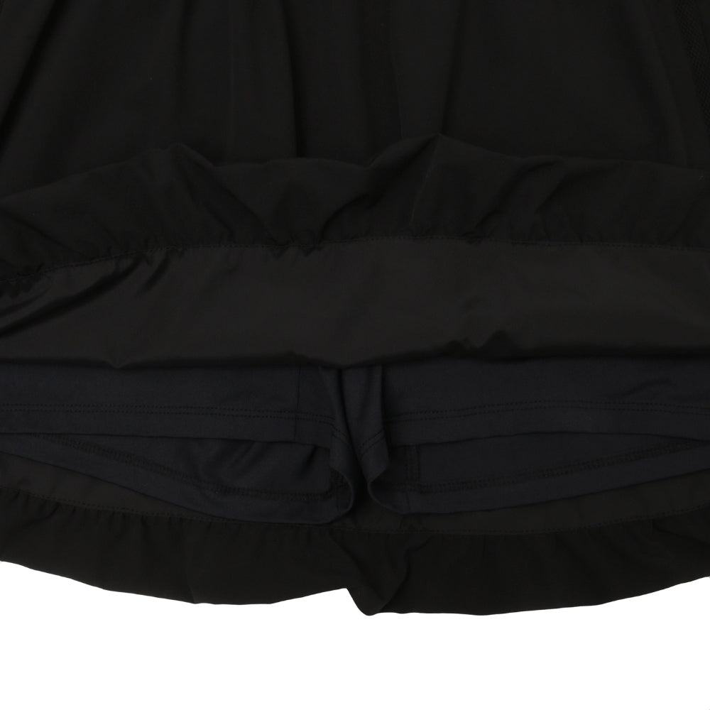 The skirt’s length provides a comfortable and light fit while maintaining modest coverage, and its structured shape subtly enhances the legs for a slimmer appearance. Designed with built-in spandex shorts, it ensures ease of movement and peace of mind during activity. Additional features include a smooth YKK Vislon zipper, side pockets for practicality, and a subtle logo print detail at the hem for a touch of shine. A stretch waistband at the back offers a secure yet comfortable fit.