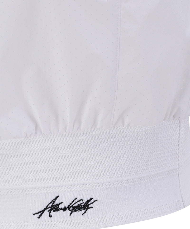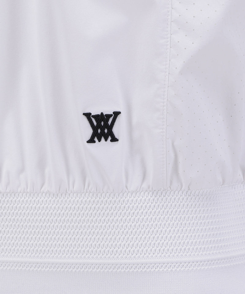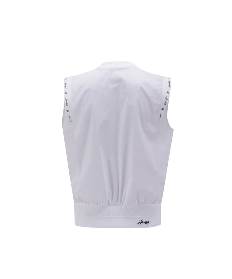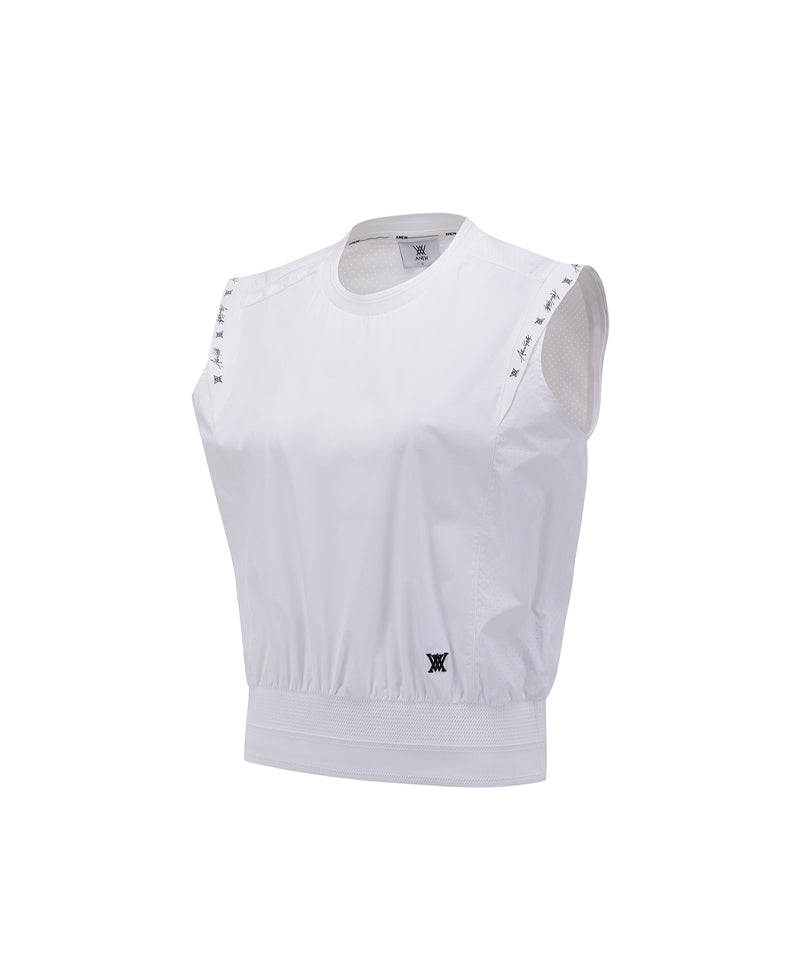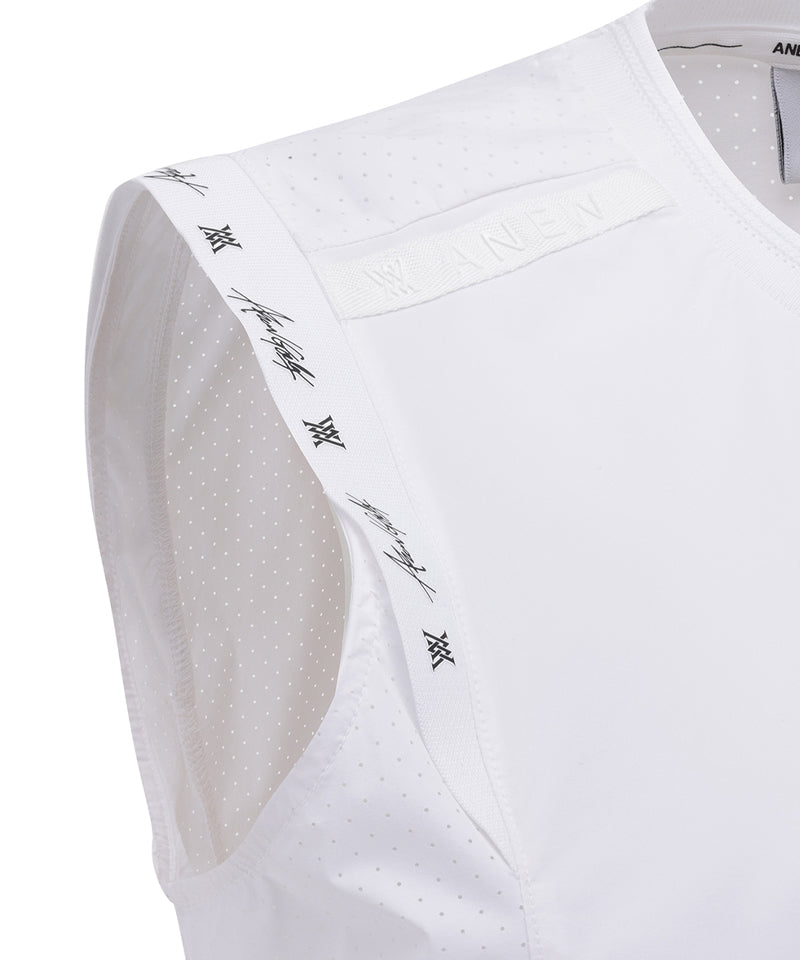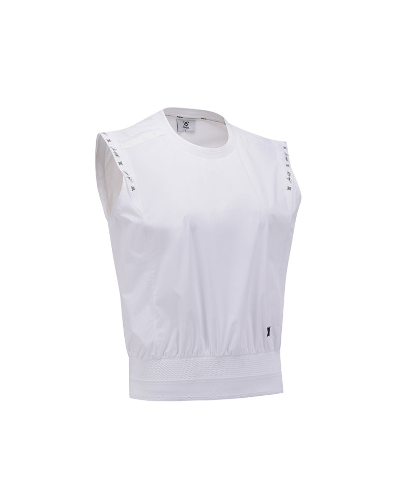 This is a layered vest made of woven material. It is an item worn over an inner layer and can be worn from early spring to summer. It has a loose fit and a wide rib at the bottom to cover the body shape and create a slim line at the same time. A tape with the Anyu logo on the shoulder adds a point, and the fabric with perforations on the back and sides is designed to facilitate sweat discharge.