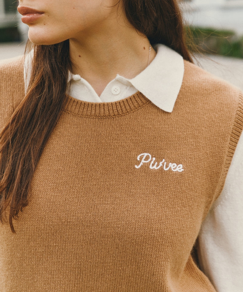 Crafted from a cozy blend of wool and cashmere, this knit vest offers exceptional softness and warmth. It features a delicate cursive PvB logo chain embroidered on the front and a large jacquard PvB smile logo on the back. Designed with a classic fit, it layers effortlessly over a variety of inner garments. Composition: 5% cashmere, 40% merino wool, 55% nylon. Made in Korea.