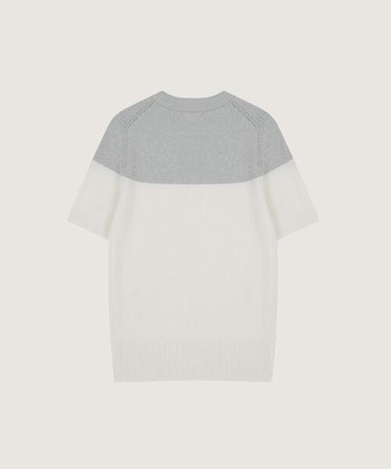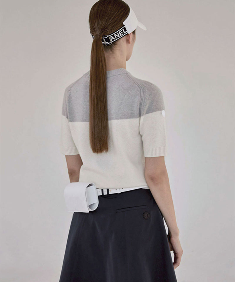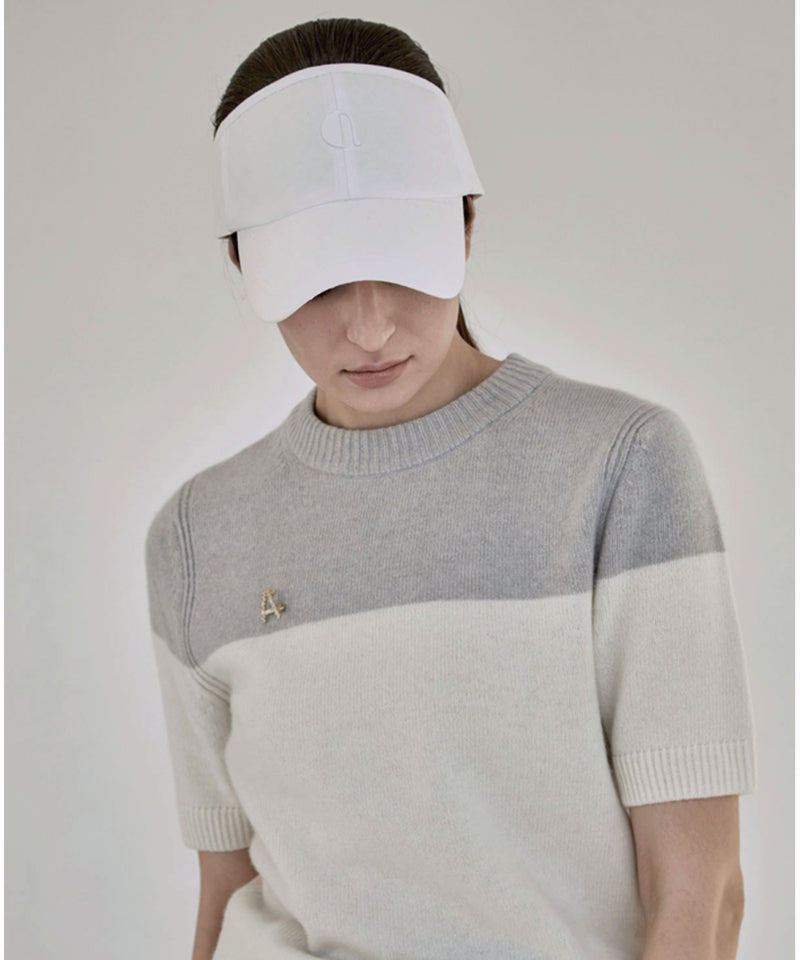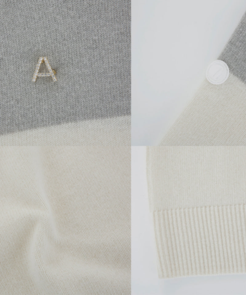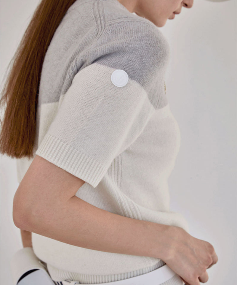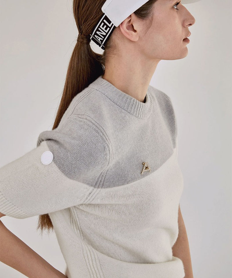 This half-slip knit is elevated with a touch of brilliance, featuring a real crystal "A" brooch that adds a sophisticated sparkle. Crafted from a cashmere-blended Irene yarn, it combines plain double-lip and single-lip details for a refined texture. The double-lip neck and single-lip sleeves and waist provide a structured and polished look, enhancing its overall elegance.