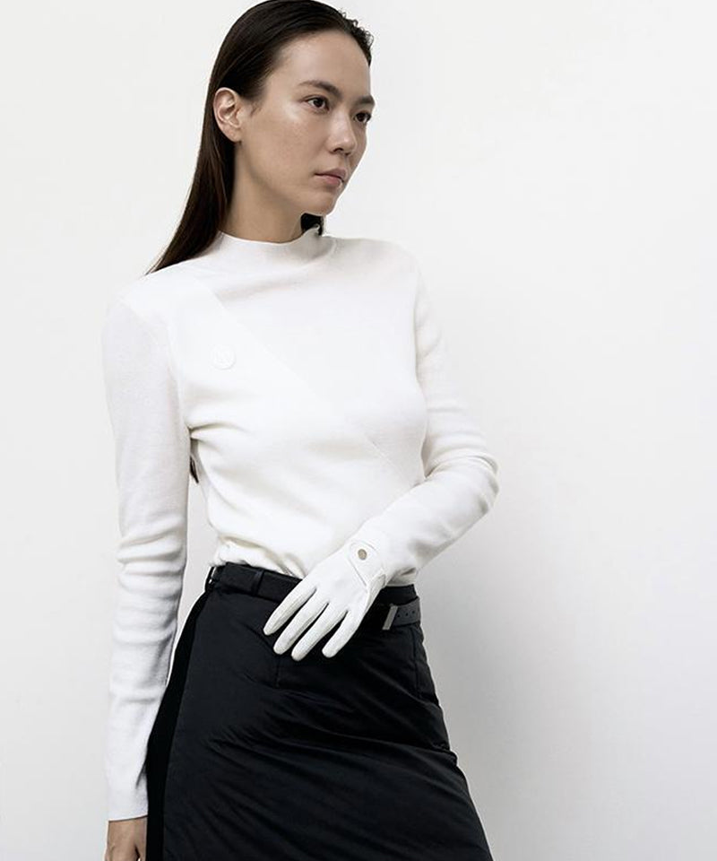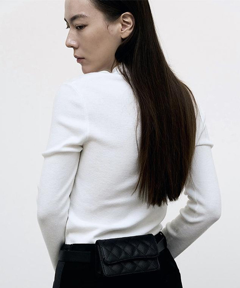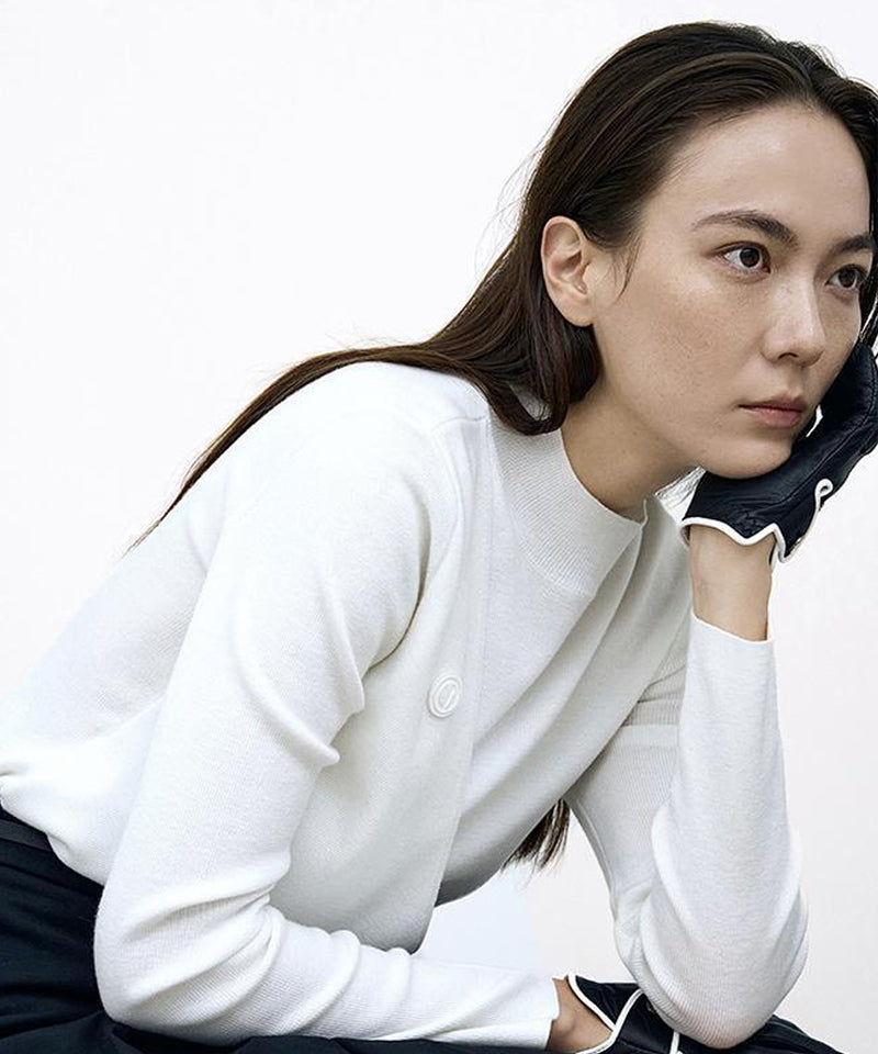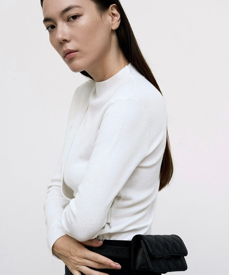 Made of soft and stretchy material this is a simple yet luxurious layered slit knit top. Soft and stretchy knit top A sophisticated design with a double layered design. Half-high neck design that comfortably wraps around the neck. Simple yet luxurious all-in-one knit top A special point with Anell's rubber label.