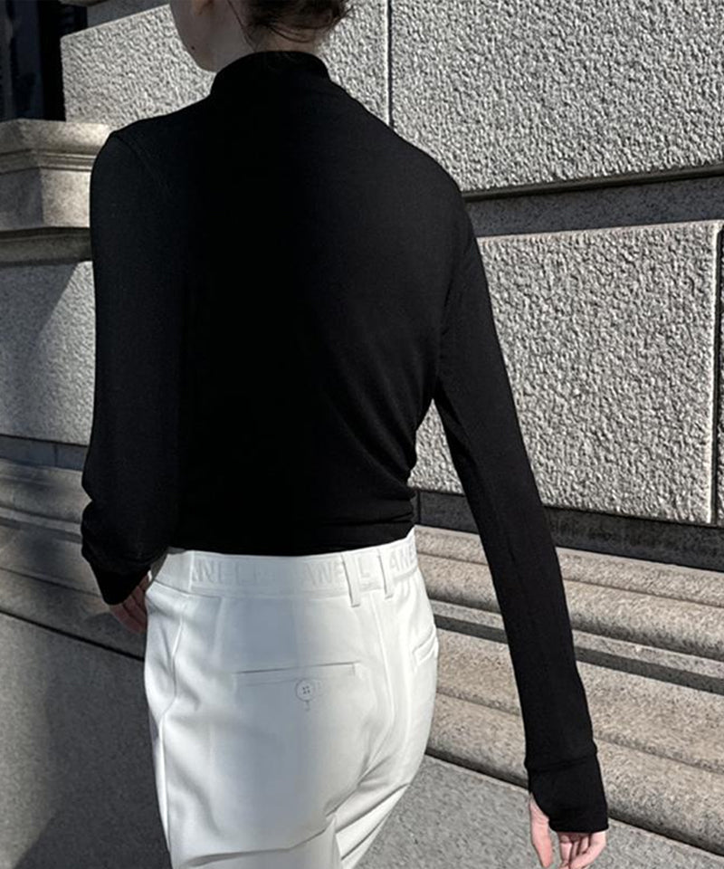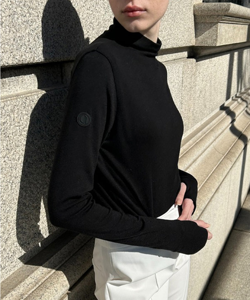 This Styling Polar features a firm yet soft texture crafted from an elastic wool and spandex blend fabric. With a half-high neck that gently wraps around, it offers versatility to be worn on its own or as an inner layer across seasons. The design includes sleeve ends and a finger holder detail to help maintain an ideal body temperature, while Anell's signature logo rubber label adds a distinctive touch. Overall, it stands as one of Anell's basic items, recognized for its high degree of completion and refined style.
