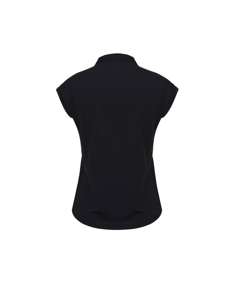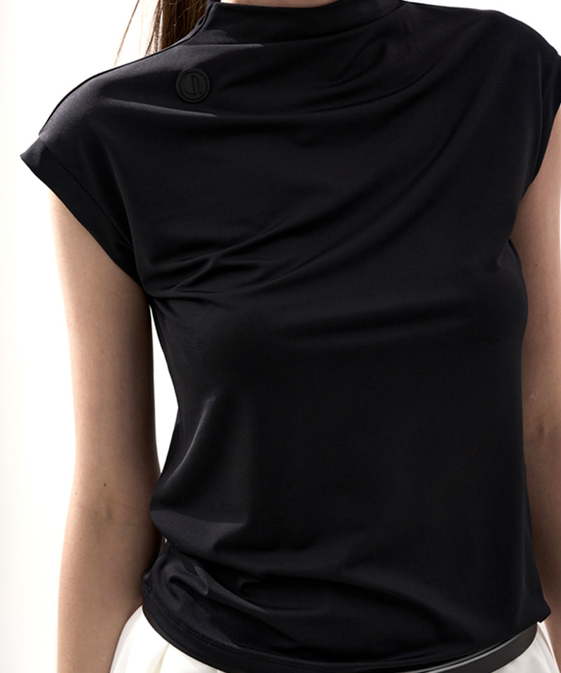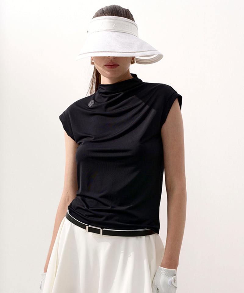 This is a basic golf top with stretch cool functionality soft single spandex, four-way stretching fabric. Sleeveless design that covers the shoulder line semi-high neck of appropriate height hem round design.