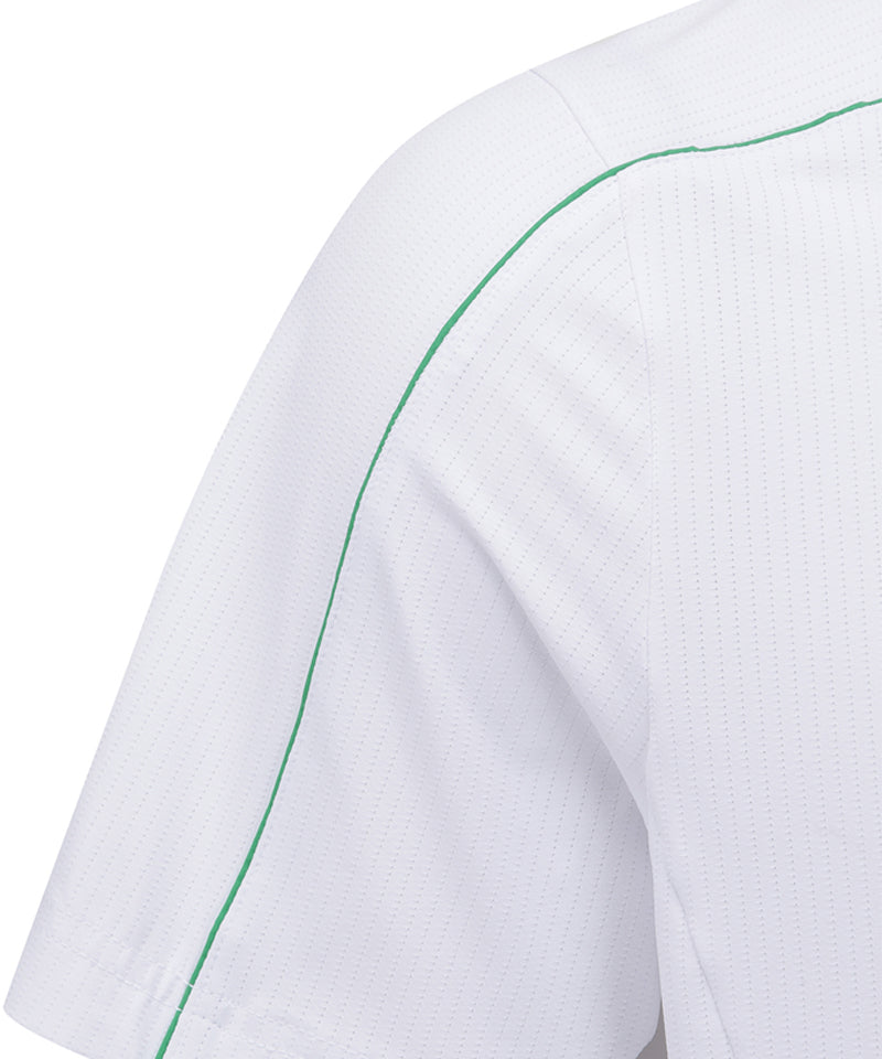 This is a men's summer line point mesh cut short-sleeved T-shirt with a contrasting line on the shoulder and a contrasting line on the neck collar. The back is made of mesh material, so you can wear it coolly in the field.