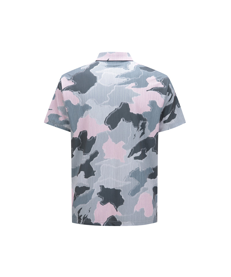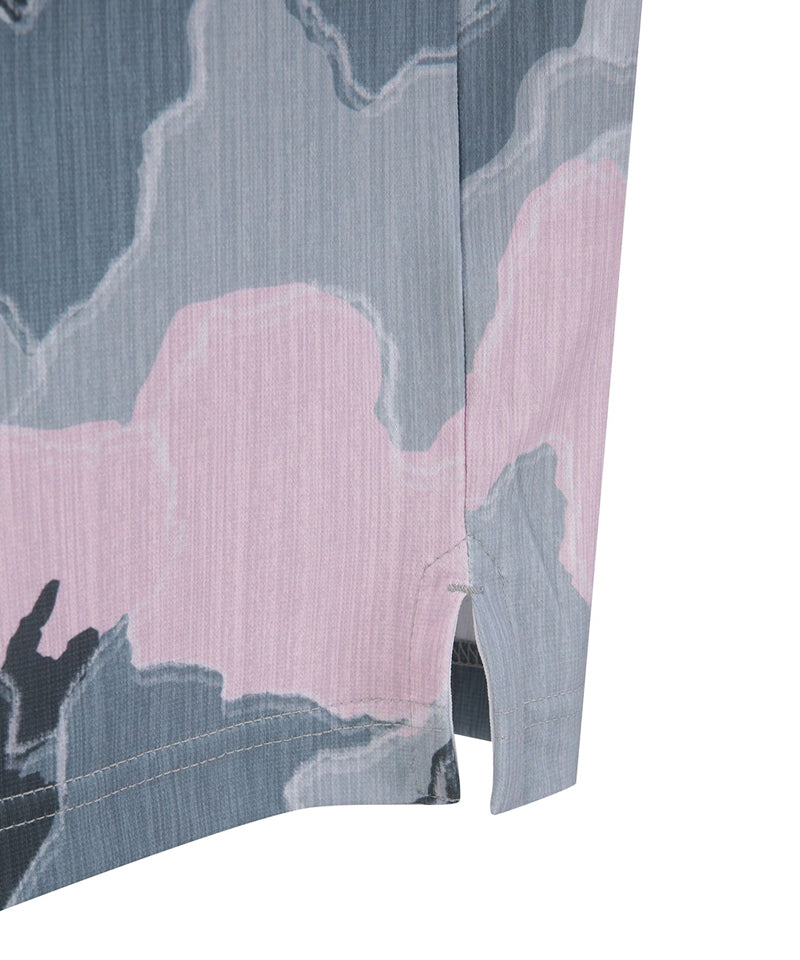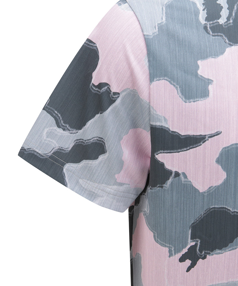 This is a summer T-shirt with a pattern applied to a textured fabric. It is cool to wear because it does not get sticky even when sweaty, and it is an item that will stand out even more on the field when coordinated with simple pants. It is a resort-mood item that can be styled for indoor or outdoor use.
