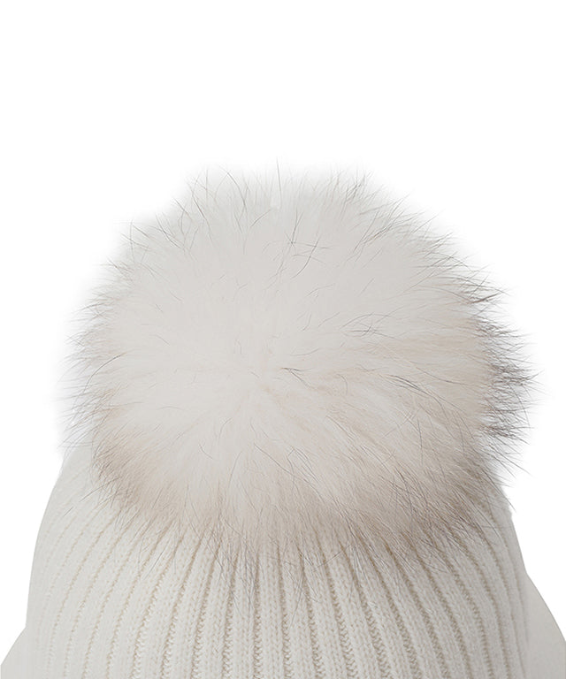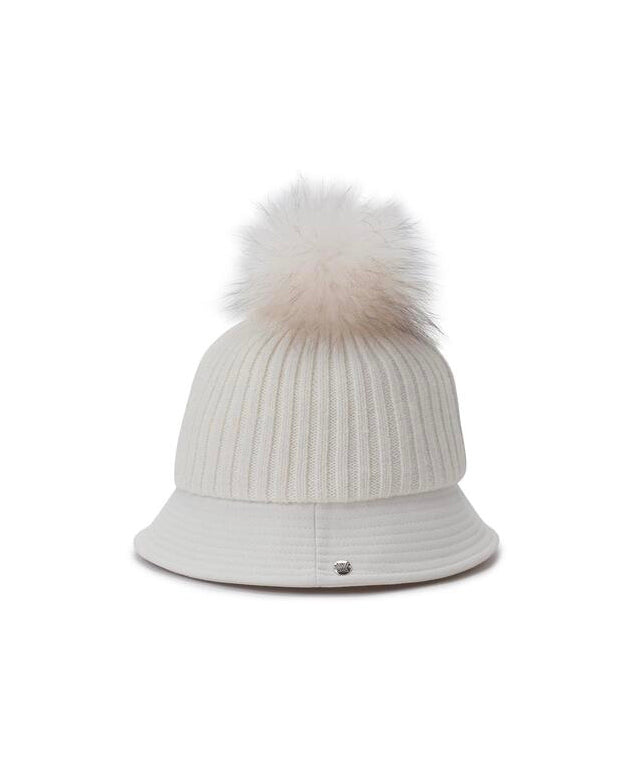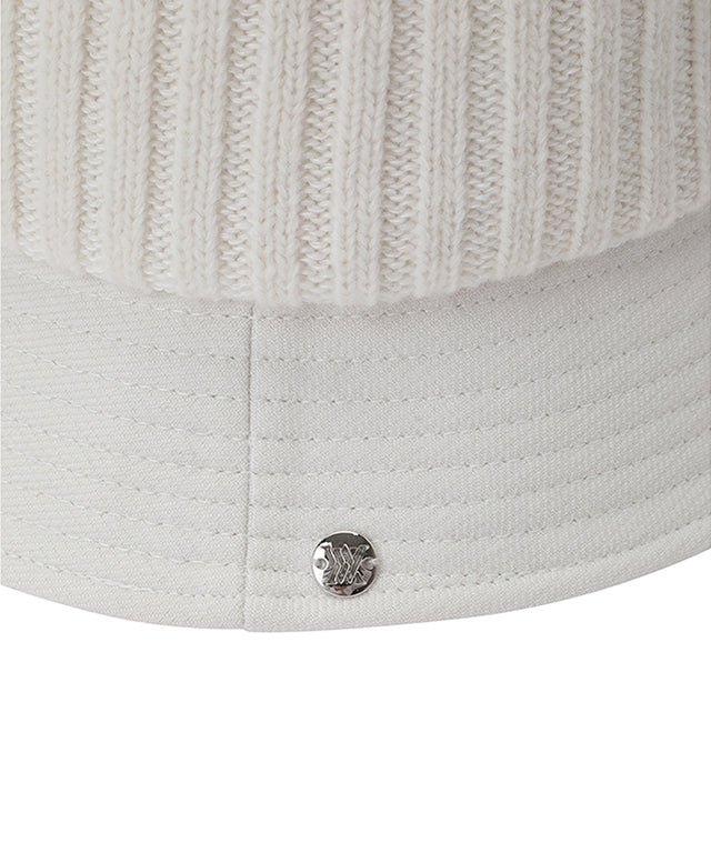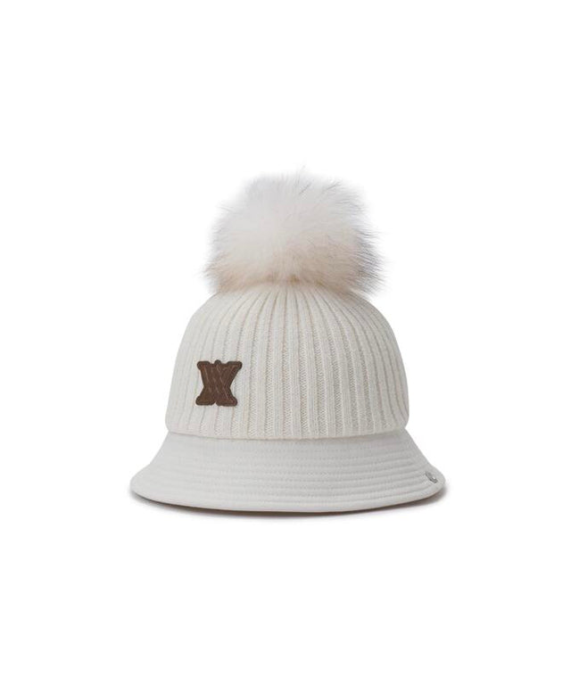 A bucket hat with a difference in texture between the crown and brim. A knit bucket with excellent thermal insulation and a fox fur bead for added femininity.