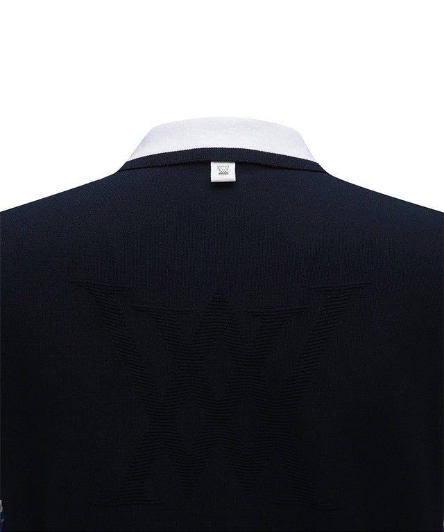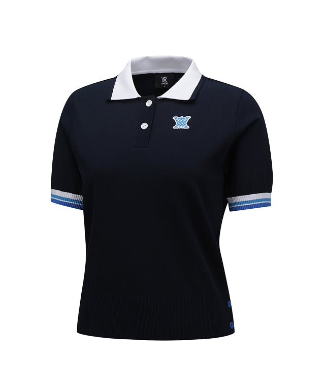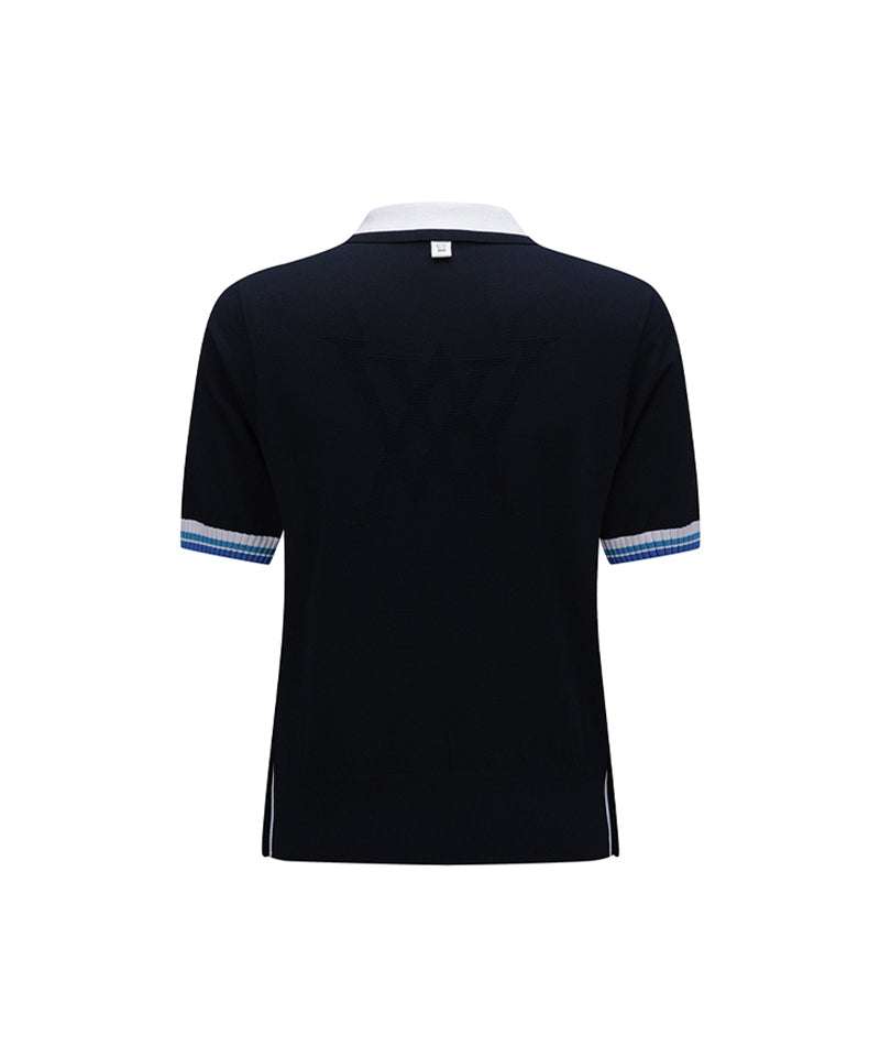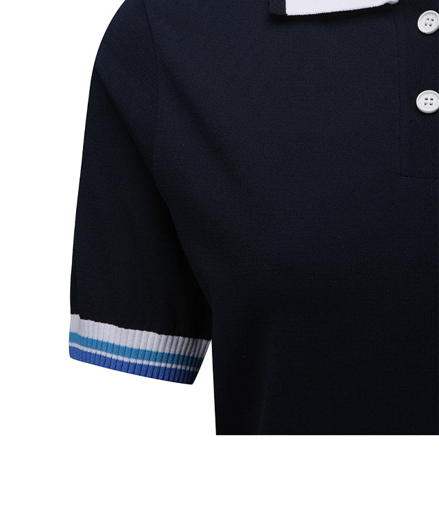 With a moderate shoulder drop and a slightly relaxed overfit. A short-sleeved polo-type knit pullover with a natural body cover effect. Multi-color schemes are given to the hem of the sleeves, and a decorative button is attached to the upper lip, making it a lively yet youthful look. Knitted with strong yarn, it can be worn coolly until summer and is coordinated with white-toned bottoms.