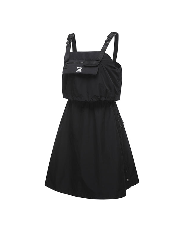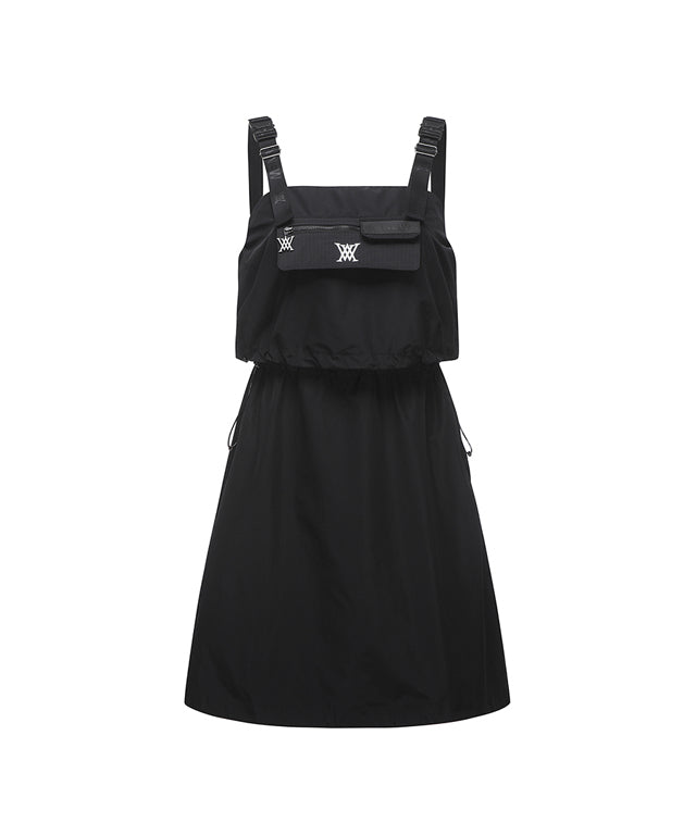 This is a suspender-style dress. Tape with shoulder analog was put in and through the buckle. Length can be adjusted. Put a thin rubber on the armpit to comfortably fit your chest circumference will increase. A fake pocket was put in the front chest to give Anew's hip point and the waist. It can be adjusted by tightening the string. The bottom part has a wide flare to give a cute point. Snaps at the end of the hem allow for adjustment during activity. It is detachable through the zipper in the back center. A D-ring is attached to the back of the waist for simple hanging.
