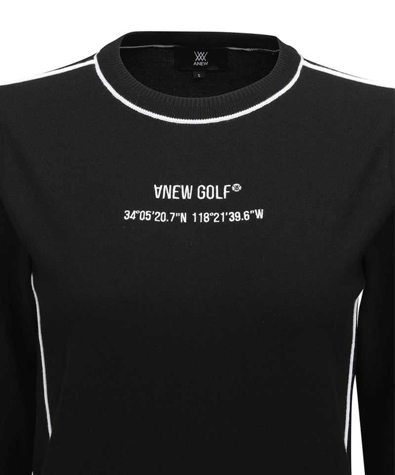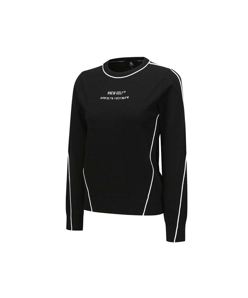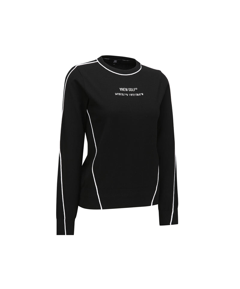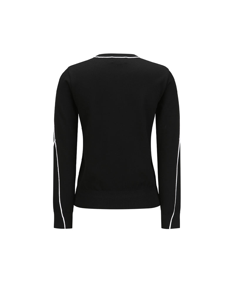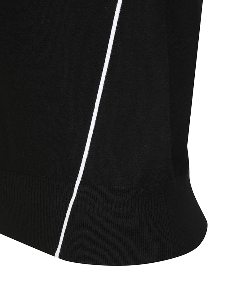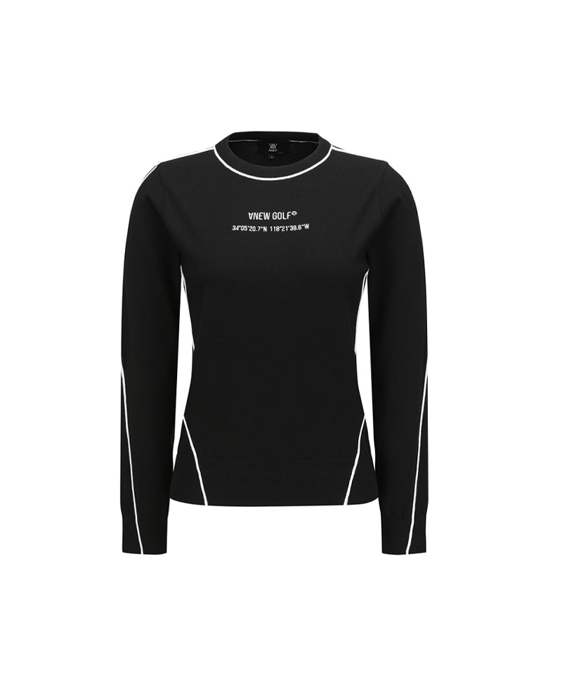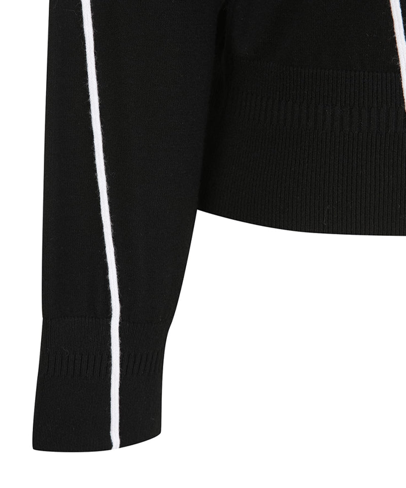 This is a signature round sweater made with soft-touch rayon blend yarn. The contrasting color lines from the shoulders to the sleeves and on the sides give a slimming effect. The overall softness and elasticity provide a comfortable fit. This is a basic style that can be used as innerwear in various coordination.