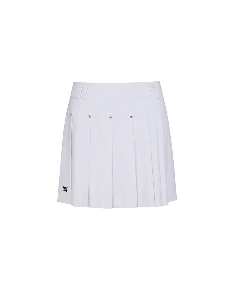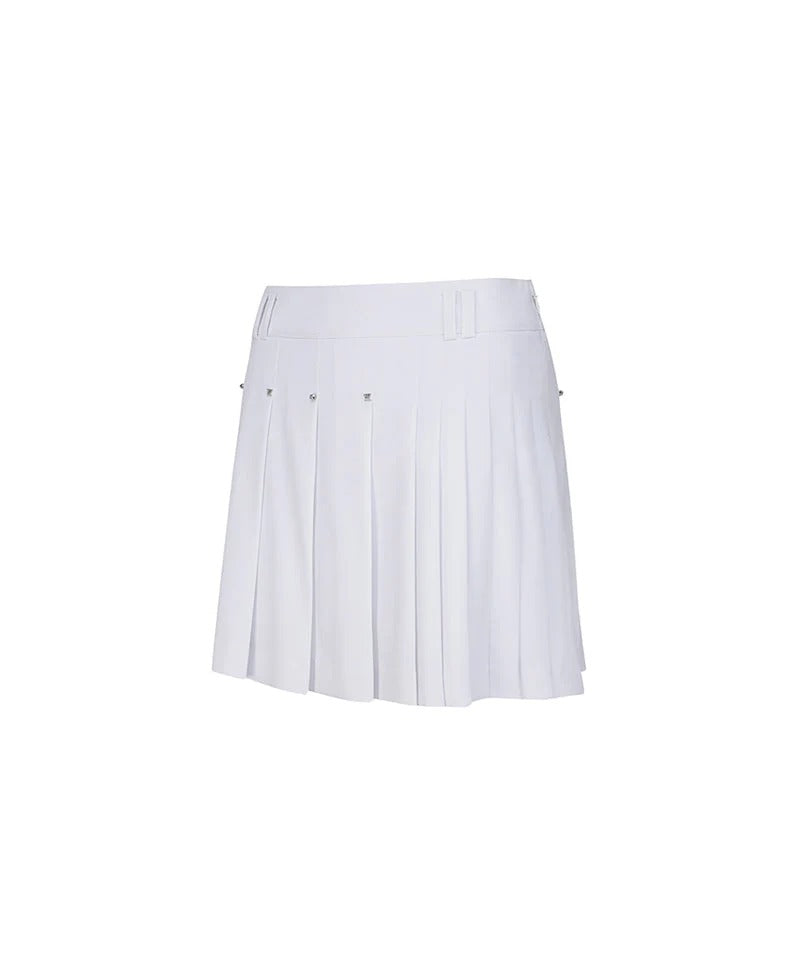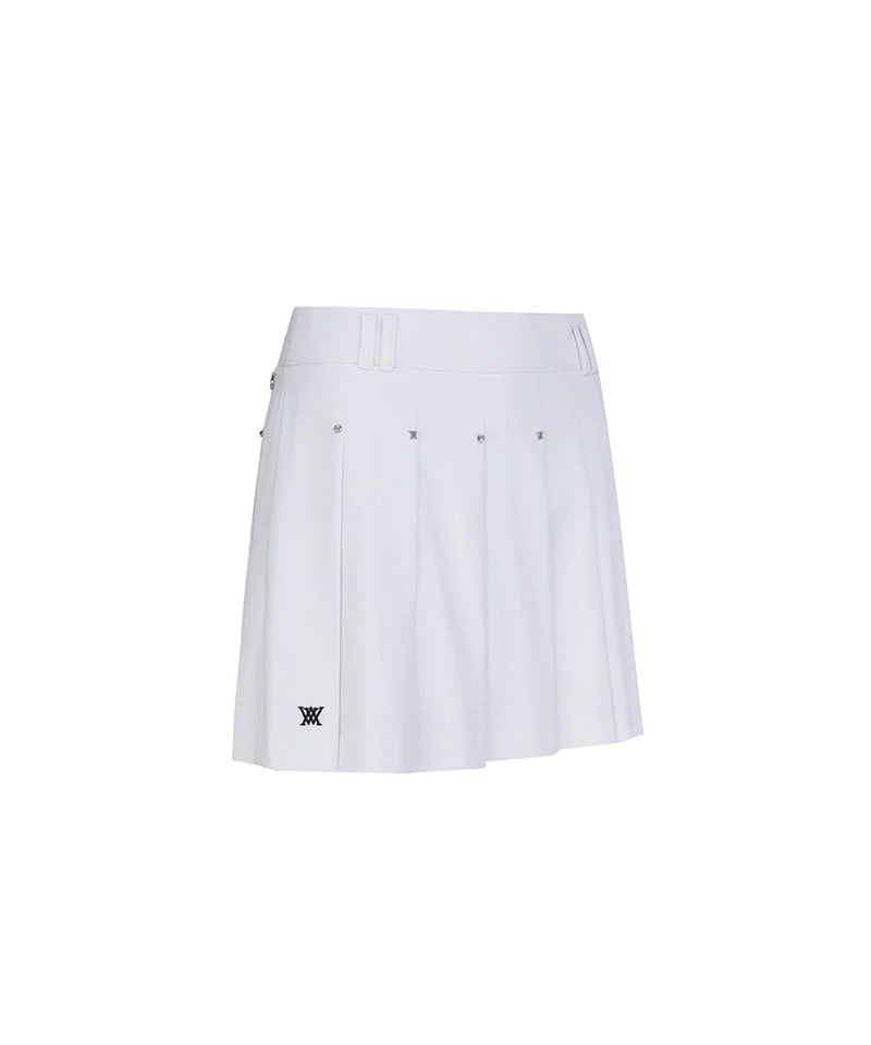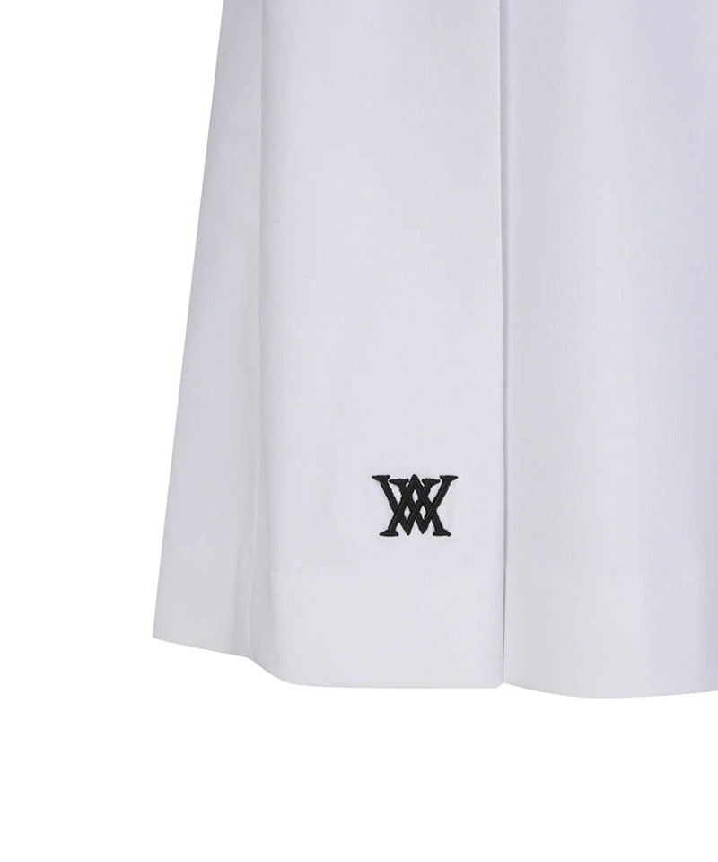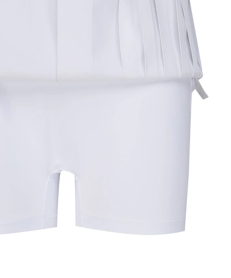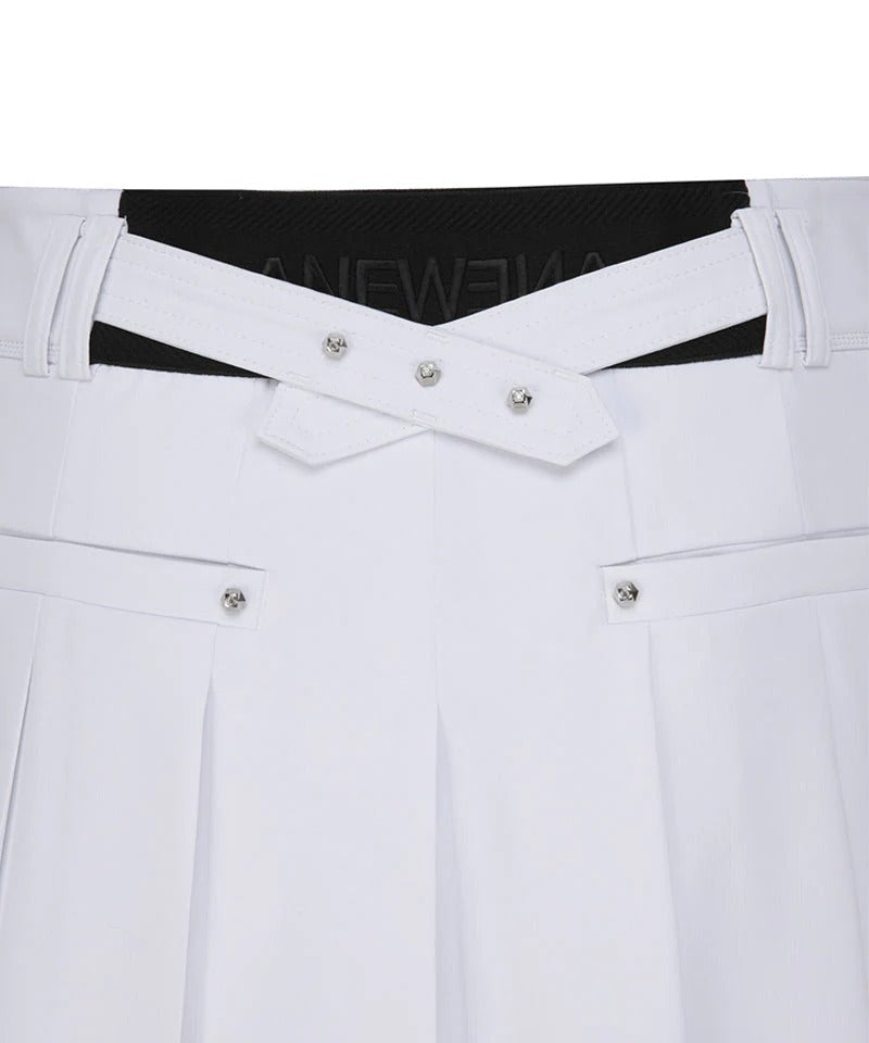 This piece features pants styled as a pleated skirt with uniquely varied pleat widths on either side. The overlapping pleats are carefully trimmed to enhance freedom of movement. The inner pants match the skirt’s fabric, ensuring comfort without the feel of underwear. The back waistband is detailed with a rivet and a subtly gradient-embroidered logo, offering a refined finish that considers every angle.