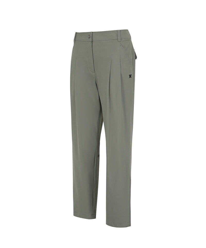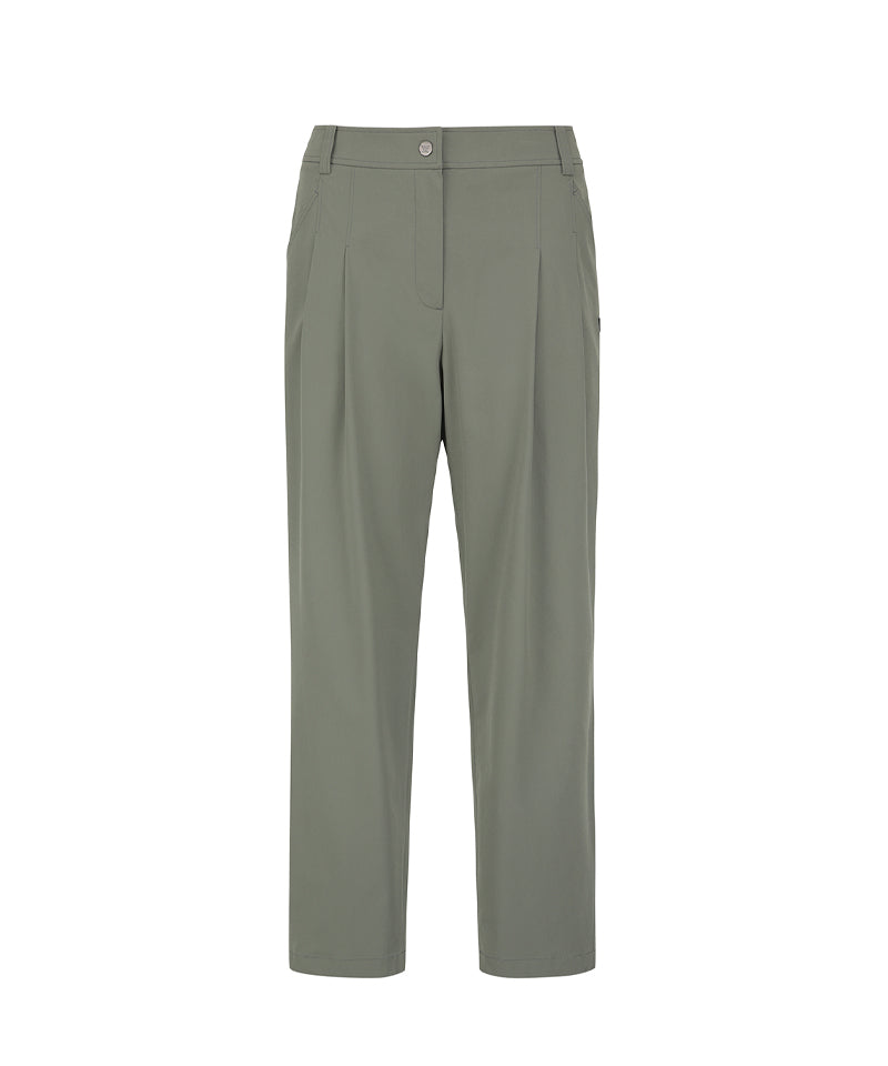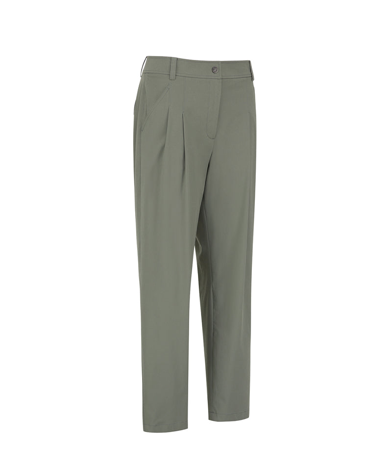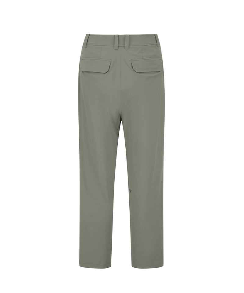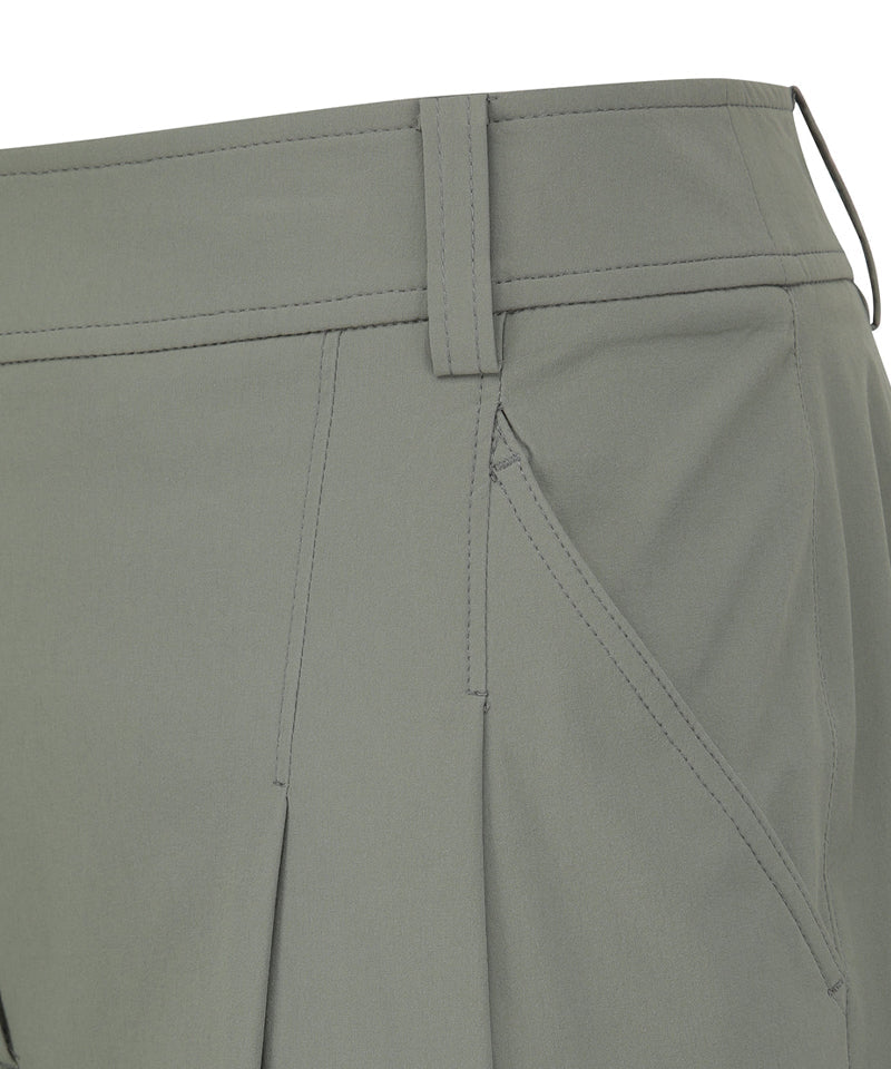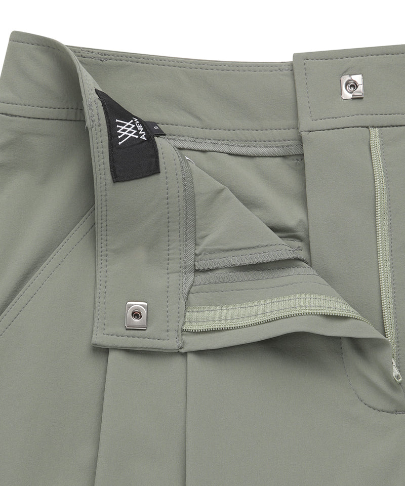 These are tapered-fit pants with pin tucks. This is a style that is modified from the existing pants shape with a loose fit,and is an item that can be worn more casually in everyday life. This item has a color-coordinated tape at the bottom that becomes a point when rolled up.