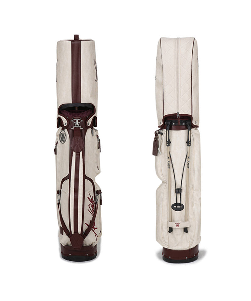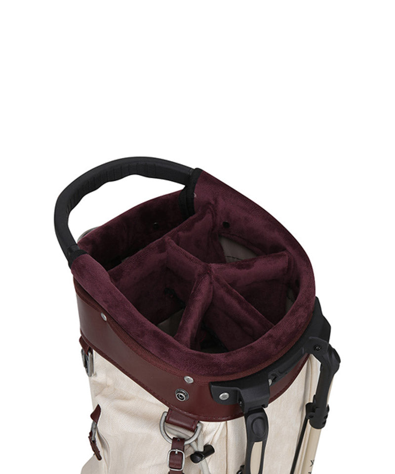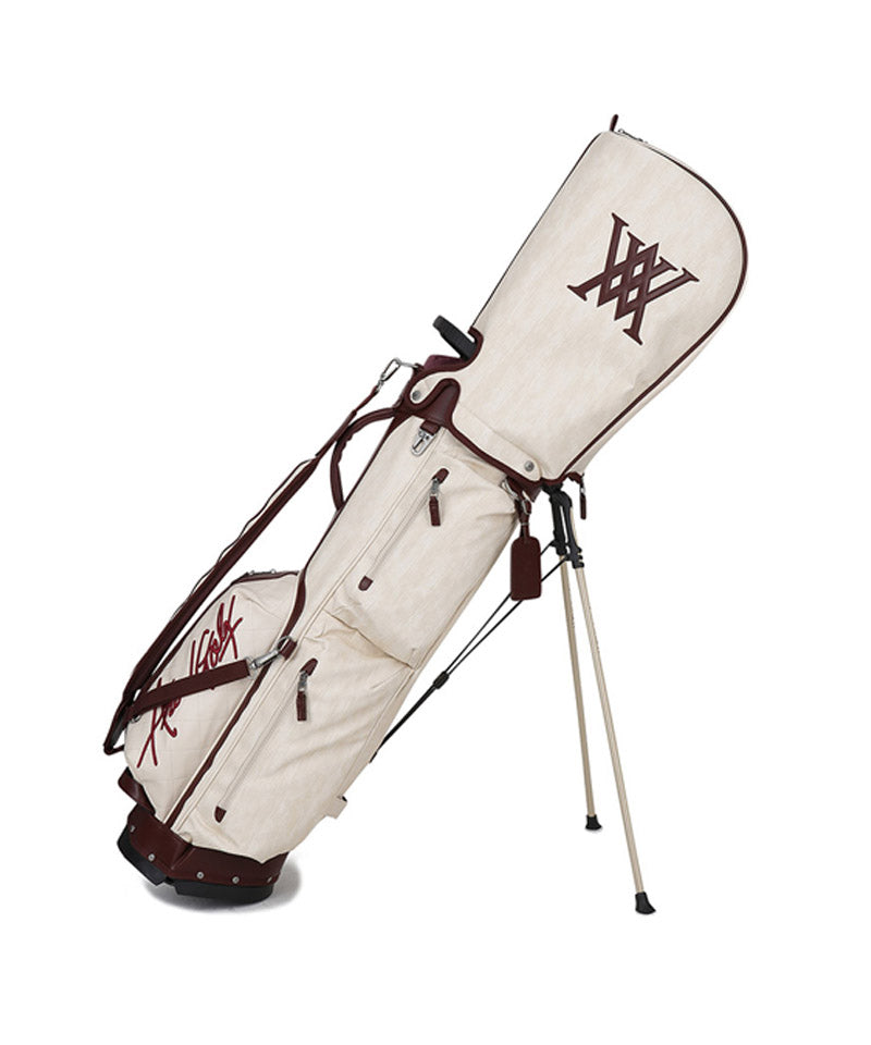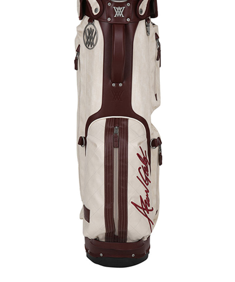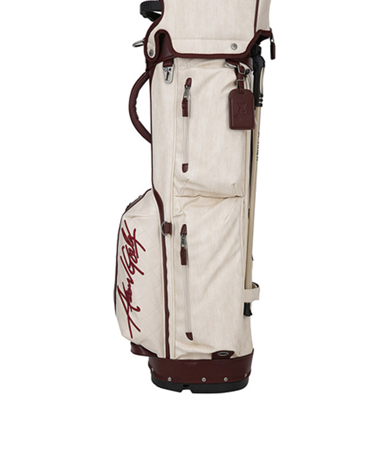 Antique stand bag with a vintage mood antique plating with a cracked feel gives it a luxurious and vintage feel. Front pocket points feature voluminous logo embroidery and logo patches. Stand bag with various storage capacities.
