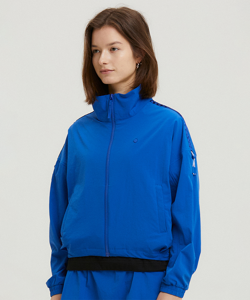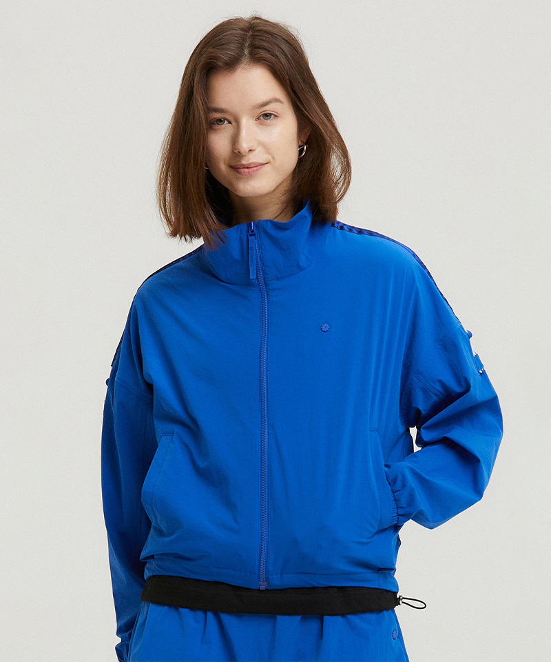 This performance-meets-style piece elevates your look with tonal color line tape accents and a high-neck detail that maintains functionality while adding fashion-forward appeal. The adjustable shoulder drawstrings let you customize the fit, creating a more feminine silhouette than standard windbreakers. Perfect for those who want athletic functionality with elevated design details.
