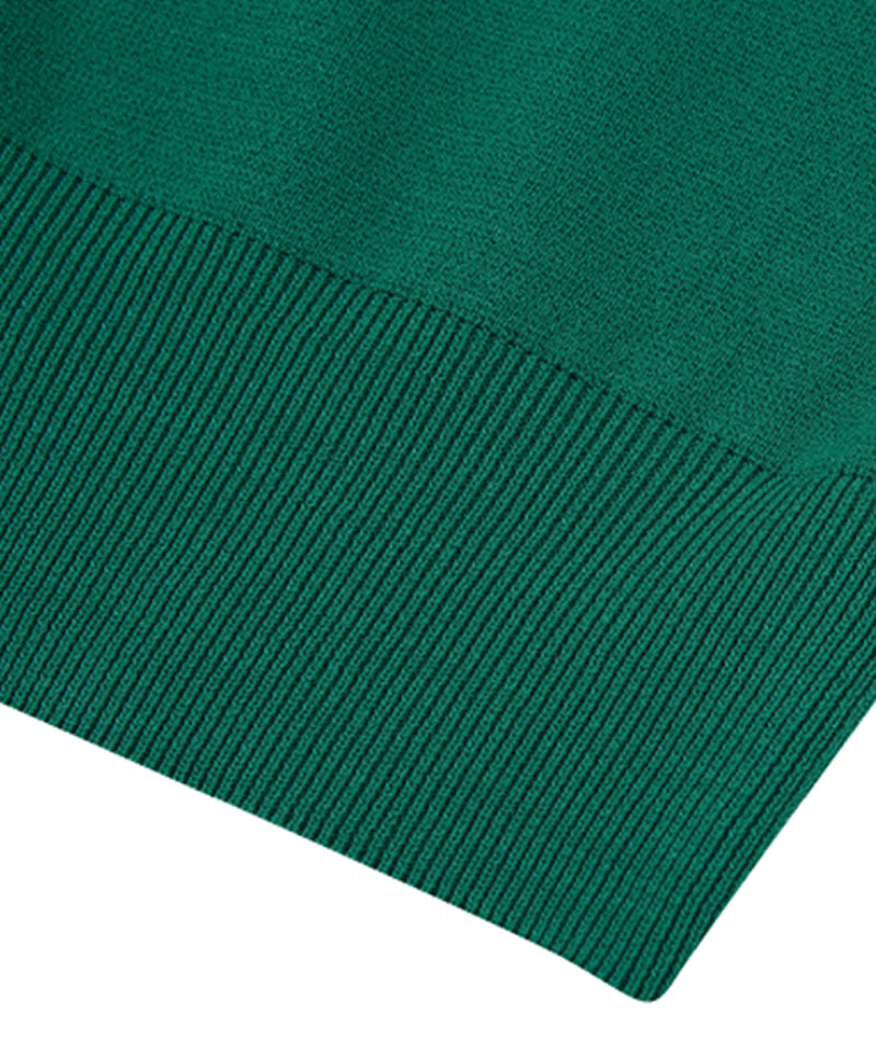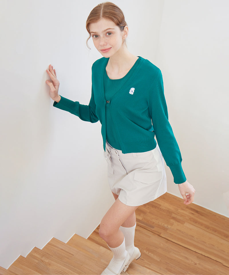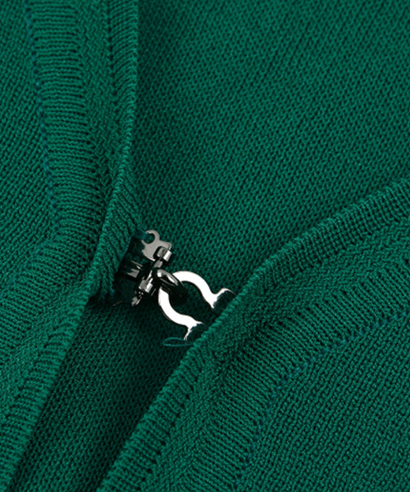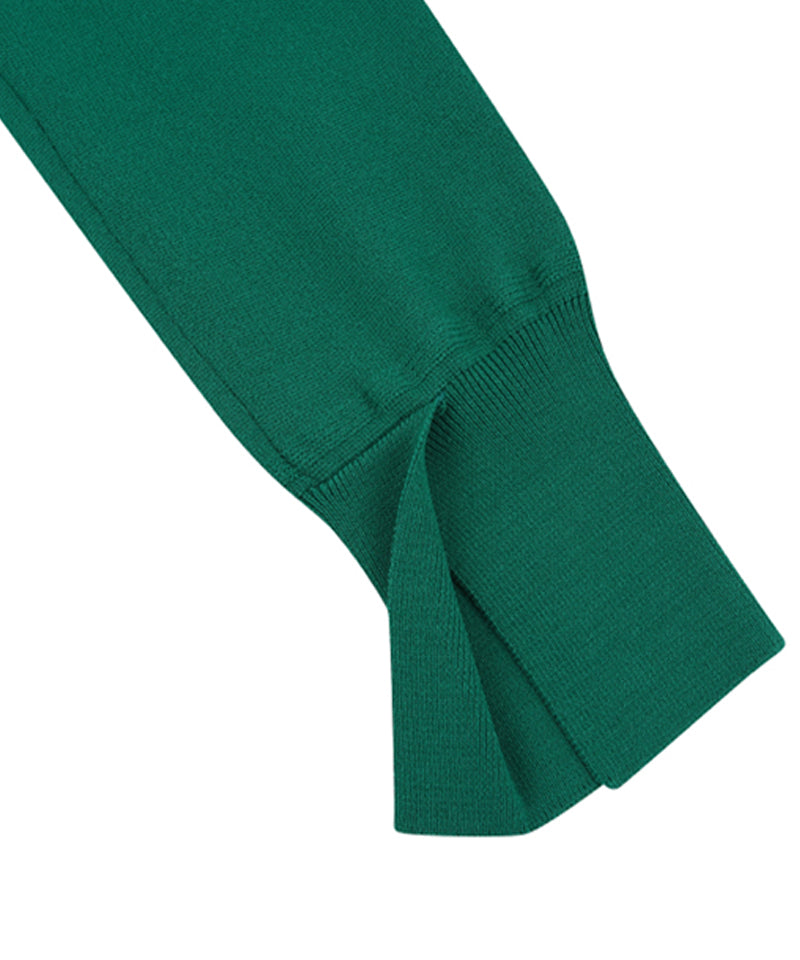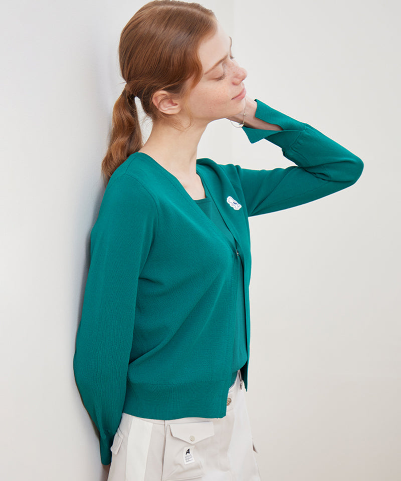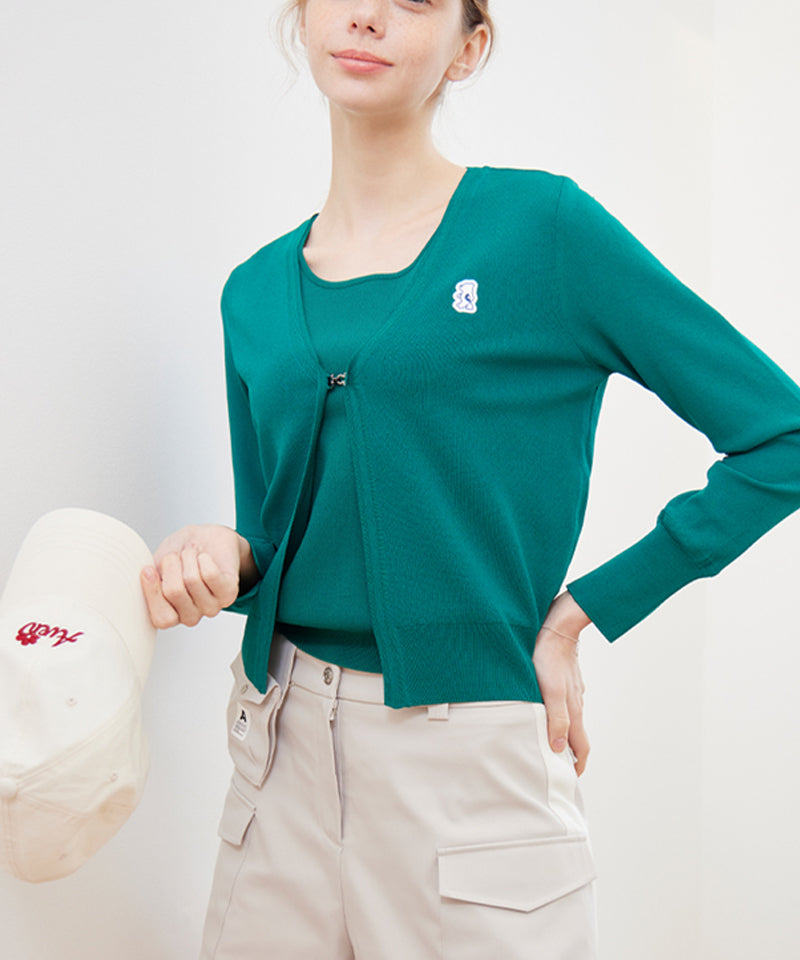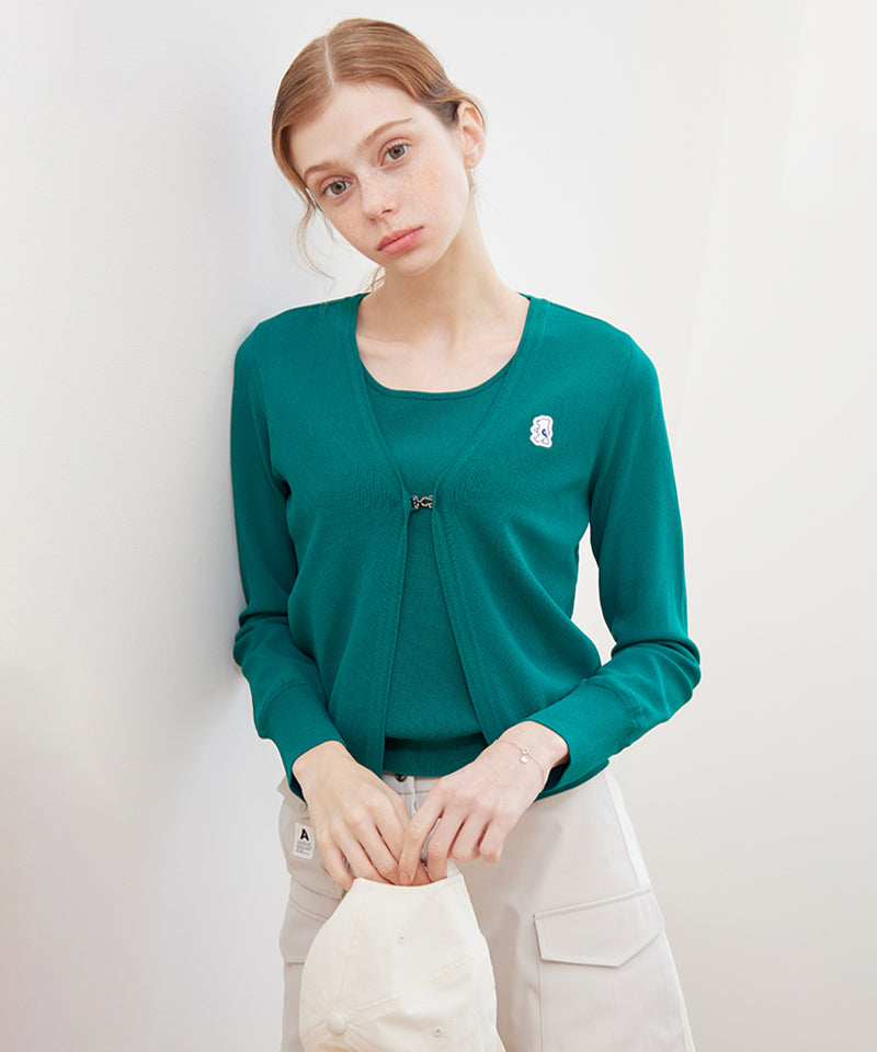 This green AVEN Sleeveless Knit Cardigan Set is a versatile staple for any wardrobe. Perfect for both spring and fall, it can be dressed up or down for any occasion. Featuring a V-neck design, it can be worn in two different ways with a snap closure at the dropped back or side neck. The glossy texture is accented with subtle logo engraving, adding a touch of elegance to this feminine piece.
