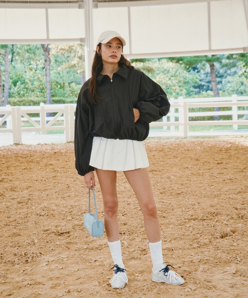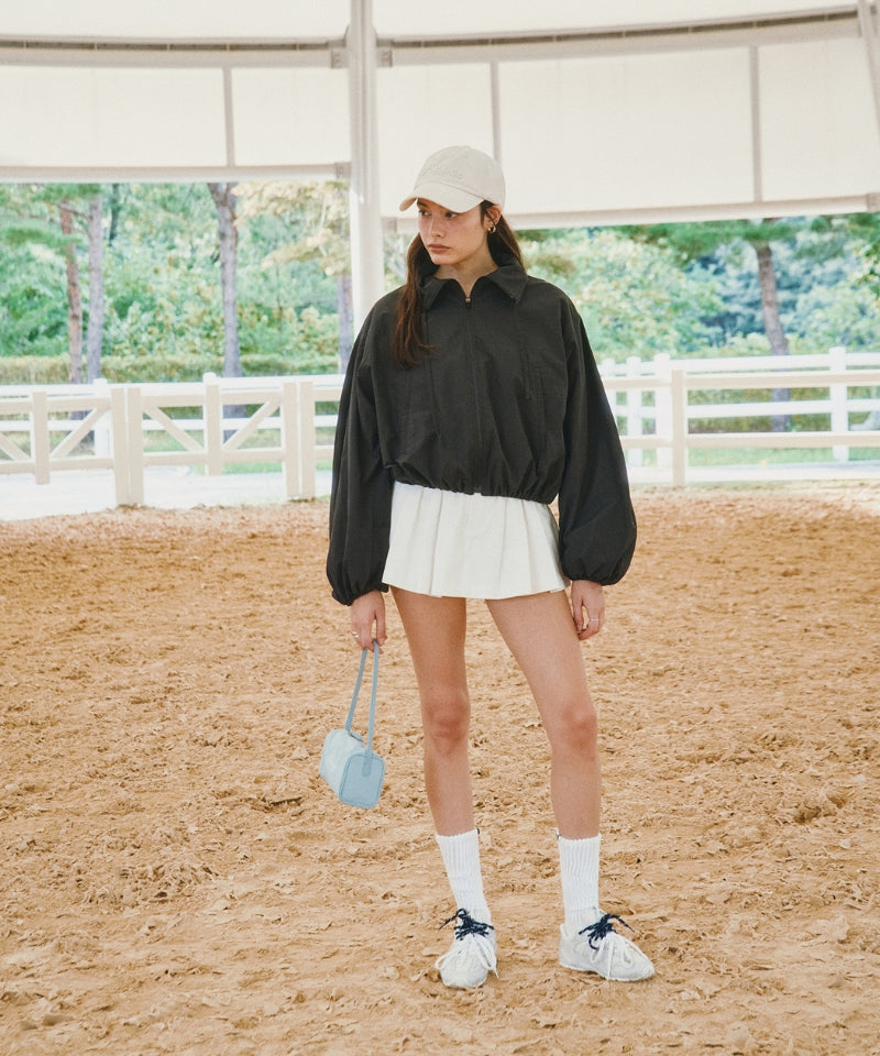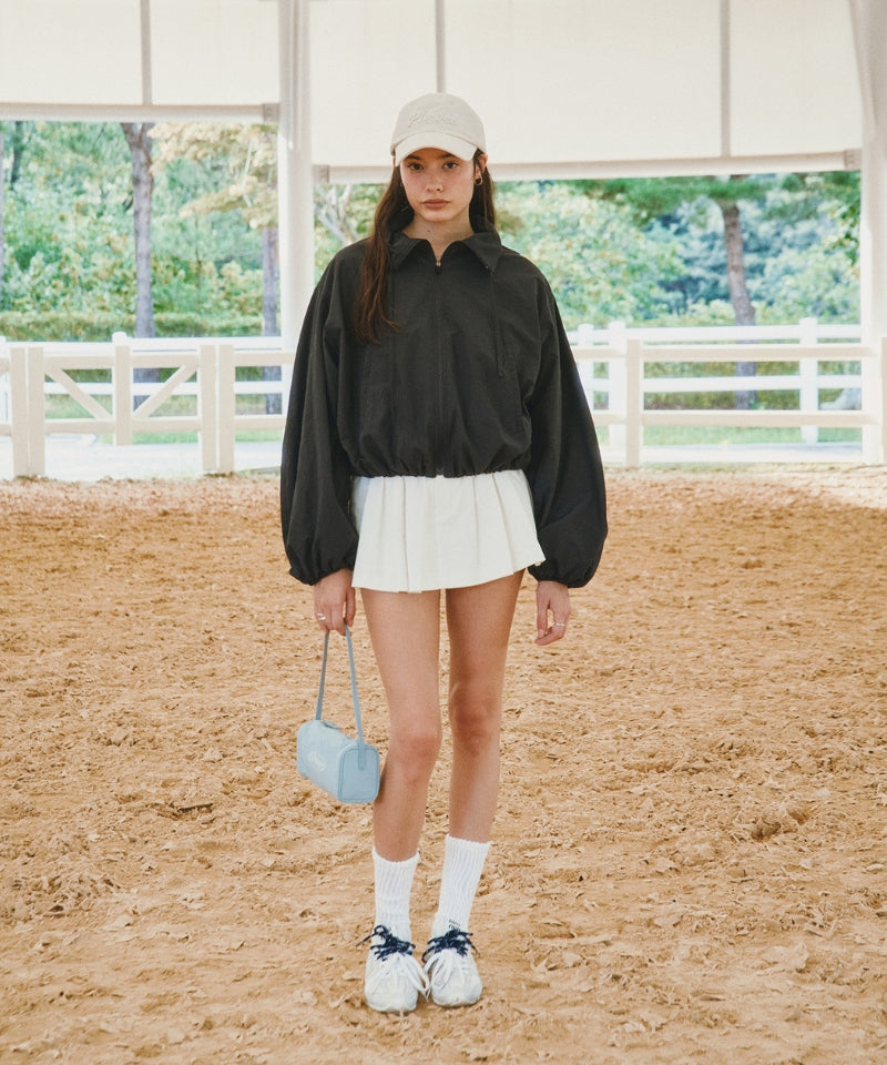This Balloon Sleeve Windbreaker Jumper features generously voluminous sleeves that create a laid-back yet refined silhouette. A ribbed hem ensures a secure and comfortable fit, while the high neck with adjustable strings offers versatile styling options. Adorned with Piv'vee embroidery on the shoulder, this piece effortlessly transitions from casual daywear to sporty ensembles. Crafted from a blend of 75% nylon and 25% cotton, it is thoughtfully designed and made in Korea.