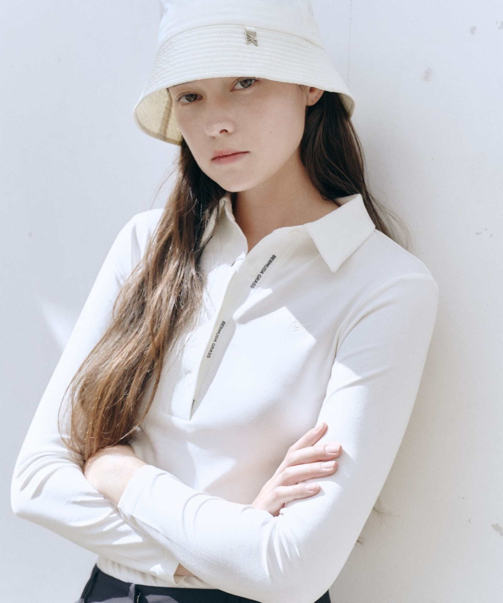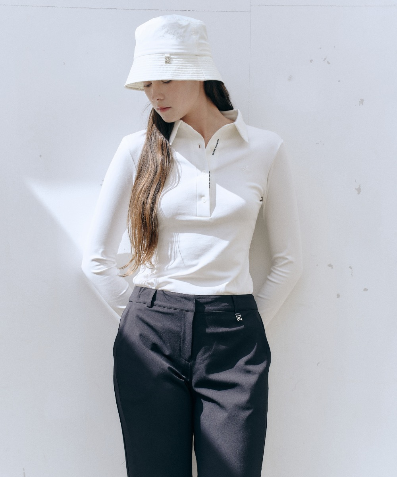 The soft, breathable cotton blend helps wick away sweat, and the slim waistline accentuates the feminine silhouette. Partial shape restoration tape treatment maintains a neat fit without stretching even with frequent movement. Logo embroidery. Logo tape detail. Shoulder shape restoration tape. Color matching button.