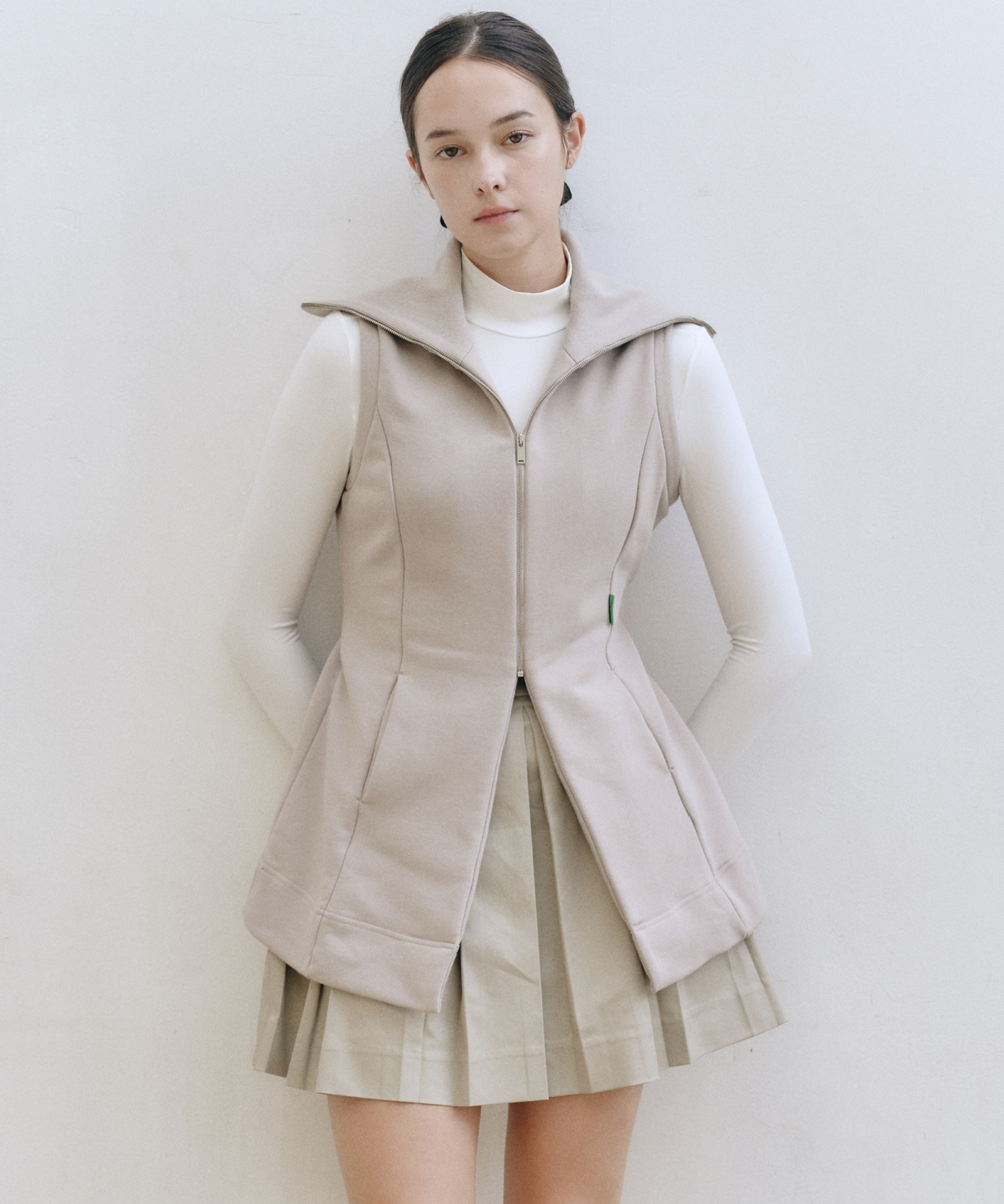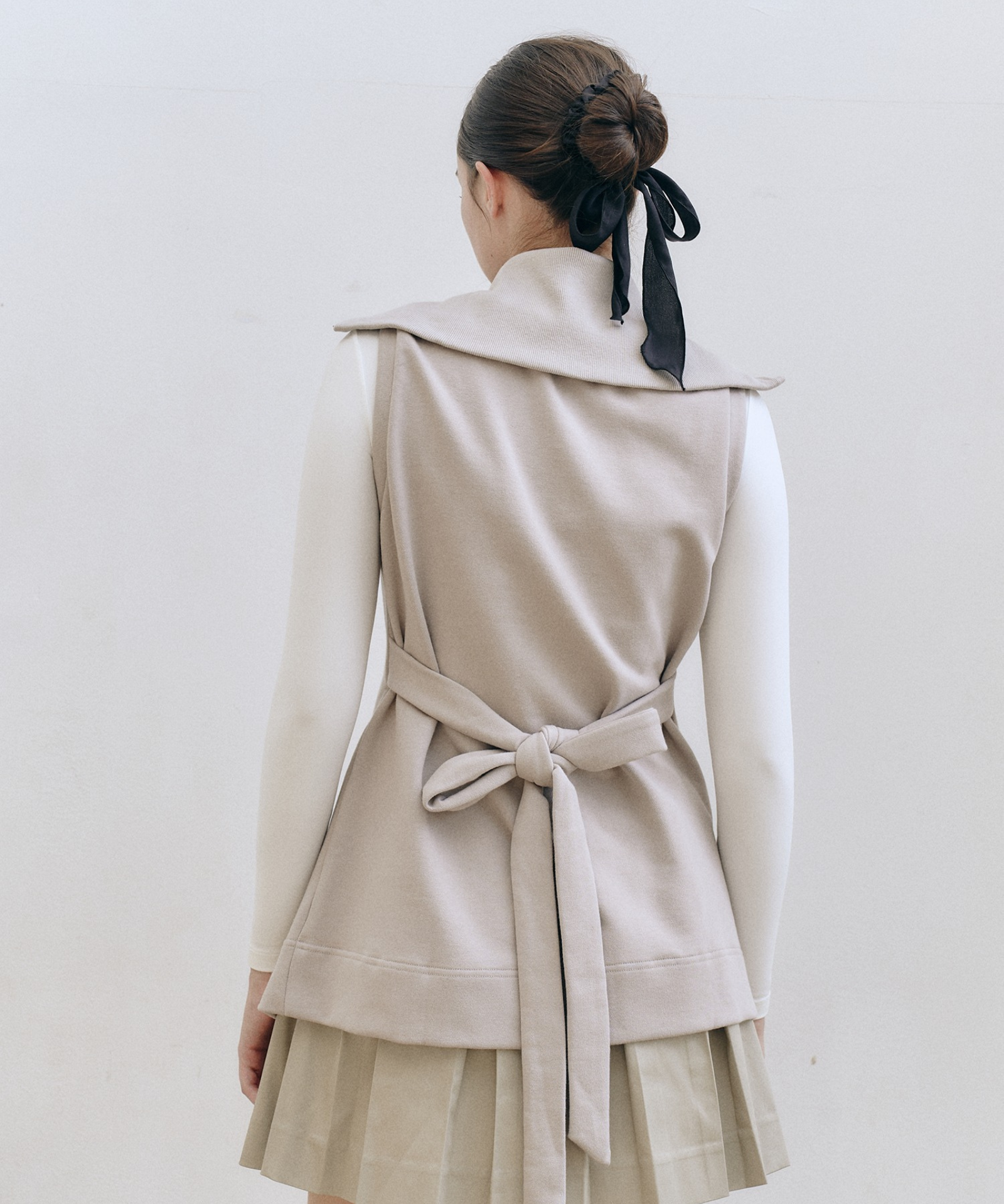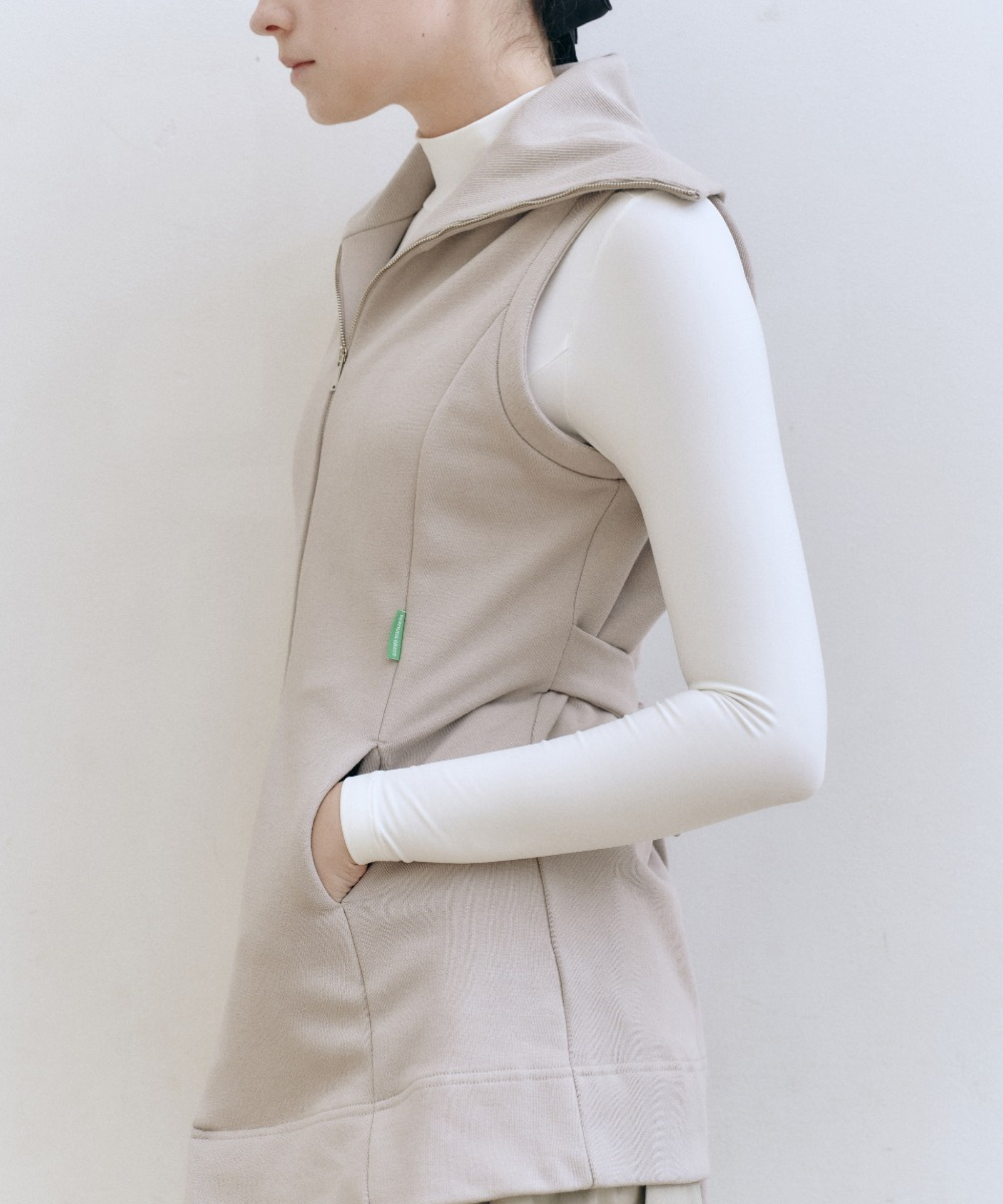 Beige belt vest with a convertible collar that shifts from turtleneck to sailor style. Premium breathable fabric with thermal regulation keeps you comfortable, while the adjustable integrated belt ensures a custom fit. Features flared hem, cut-line pockets, and refined Bartec accents. Versatile layering essential.