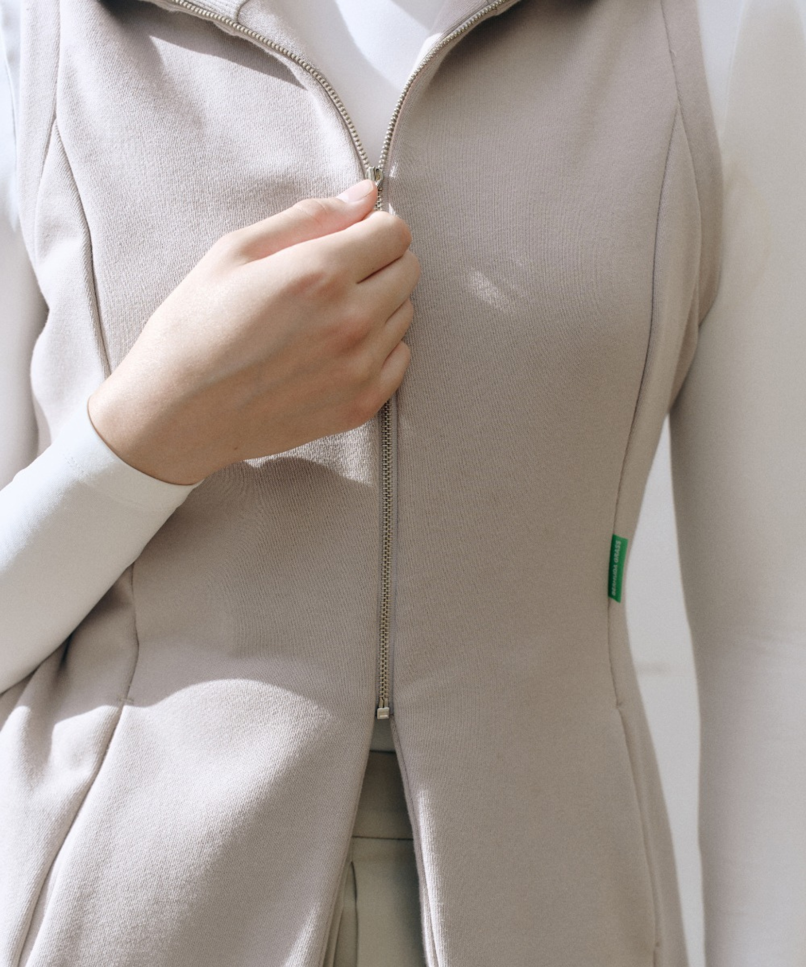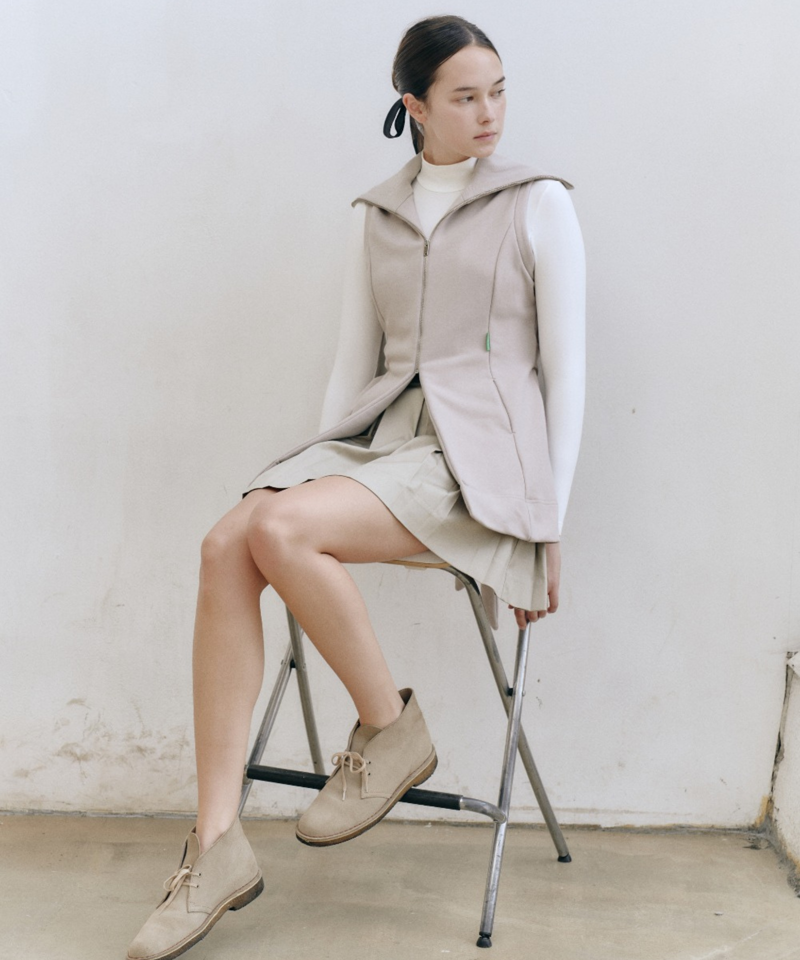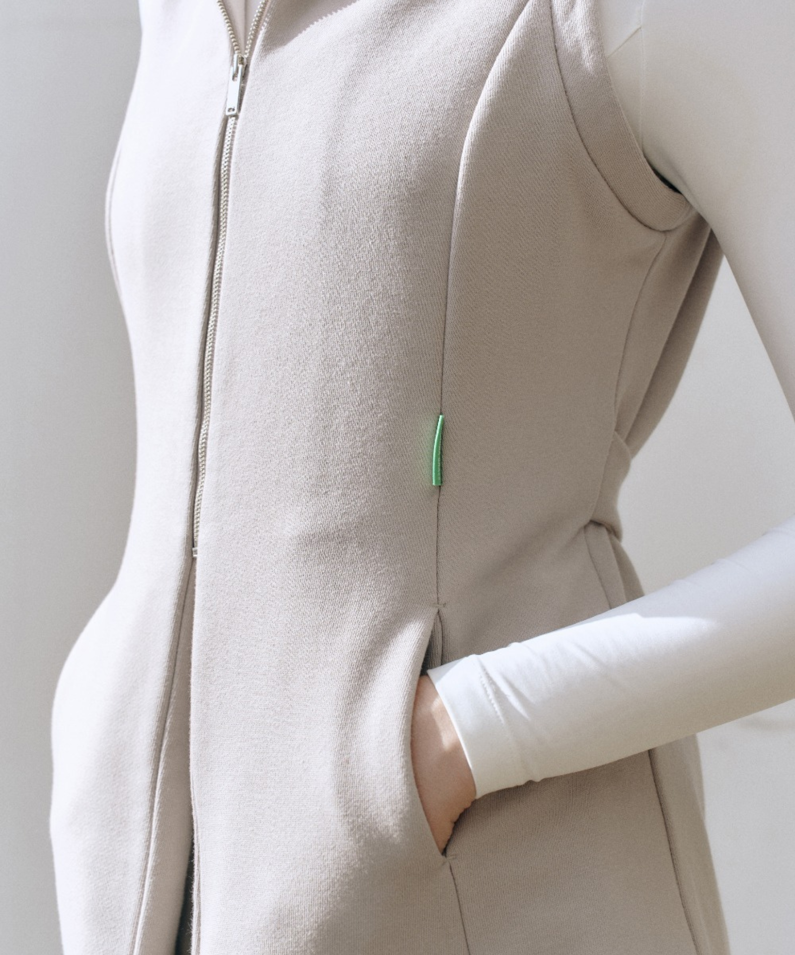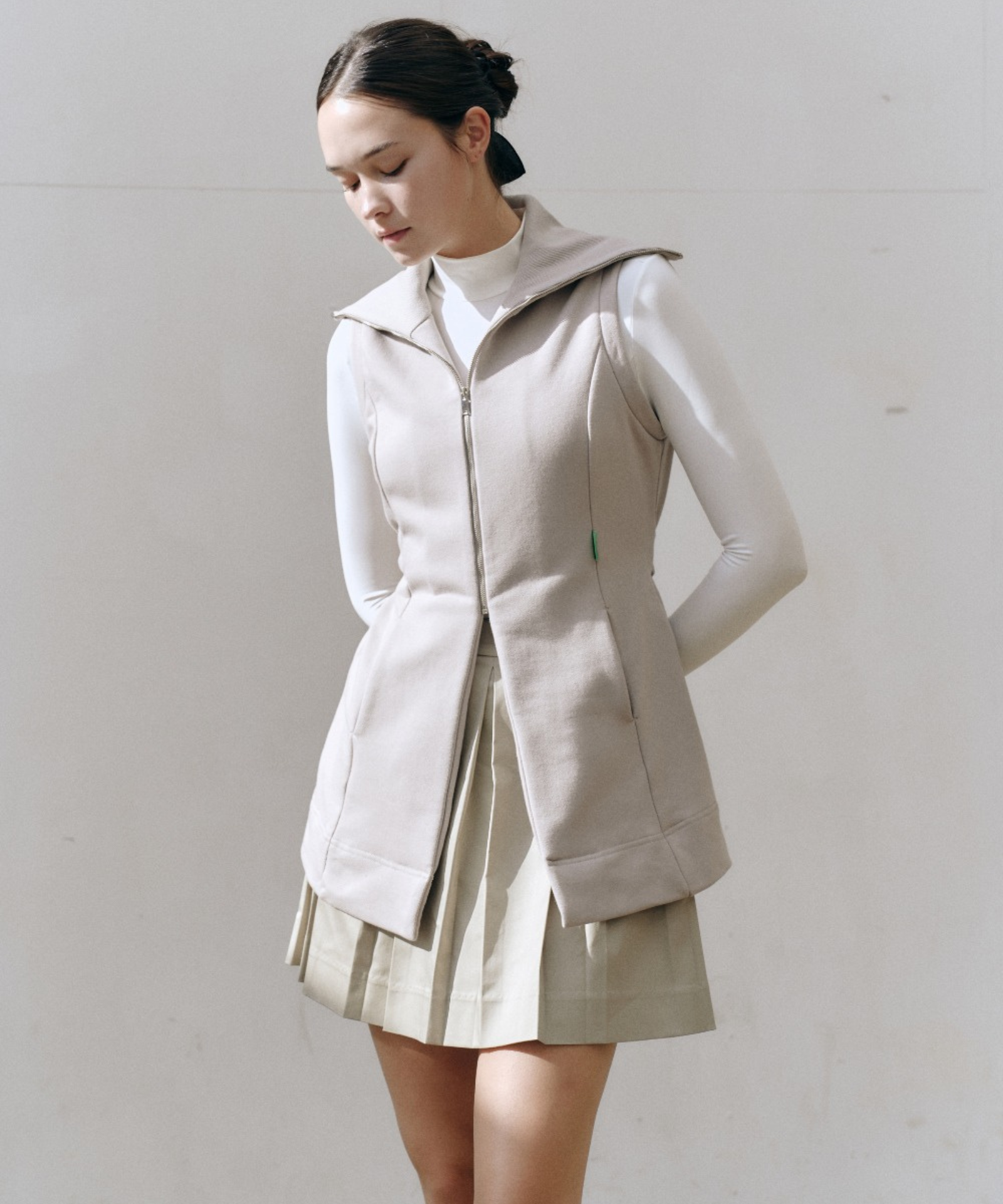 Beige belt vest with a convertible collar that shifts from turtleneck to sailor style. Premium breathable fabric with thermal regulation keeps you comfortable, while the adjustable integrated belt ensures a custom fit. Features flared hem, cut-line pockets, and refined Bartec accents. Versatile layering essential.